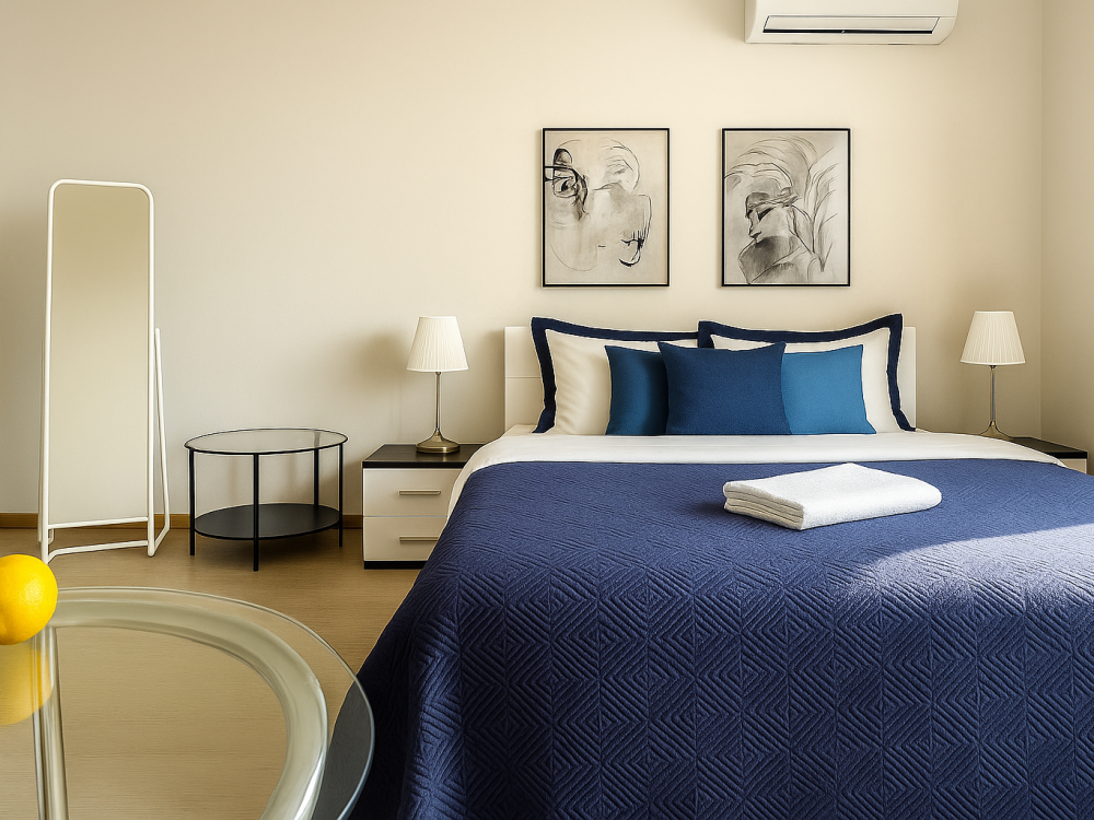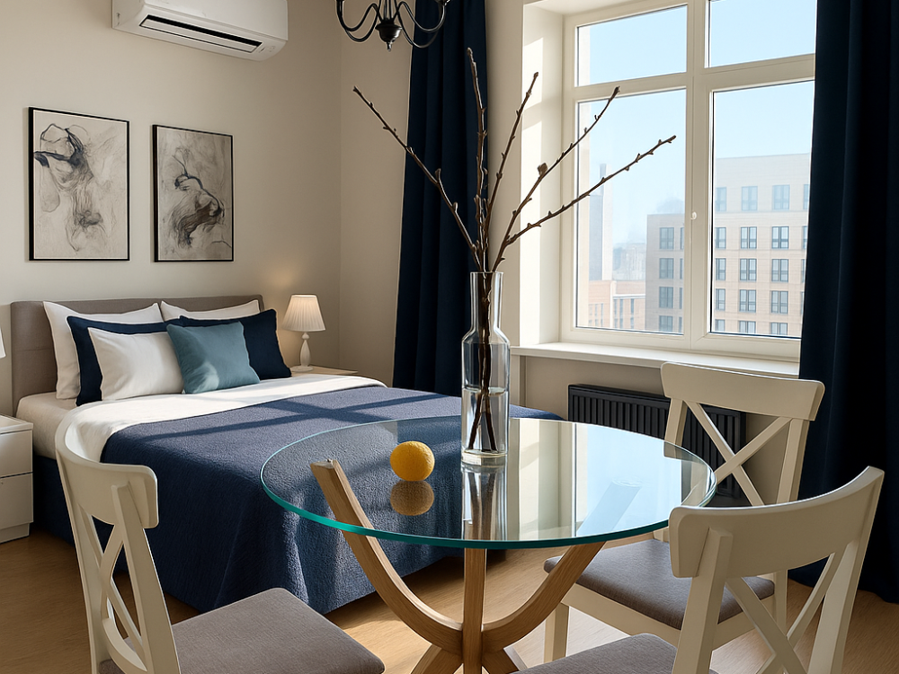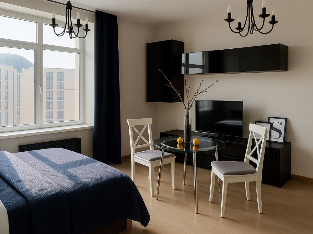 Апартаменты студия для 2 гостей: двухспальная кровать с ортопедическим матрацем с эффектом "Меmоry". В квартире есть места для хранения вещей и обеденная зона, телевизор, фен, стиральная машина, плита - скоростной WI-FI, Спутниковое ТВ от МТС. Кухня со всей необходимой посудой и бытовой техникой. К услугам гостей полотенца, постельное белье, шампунь, гель, мыло.