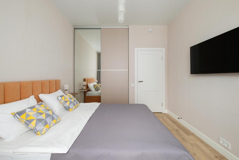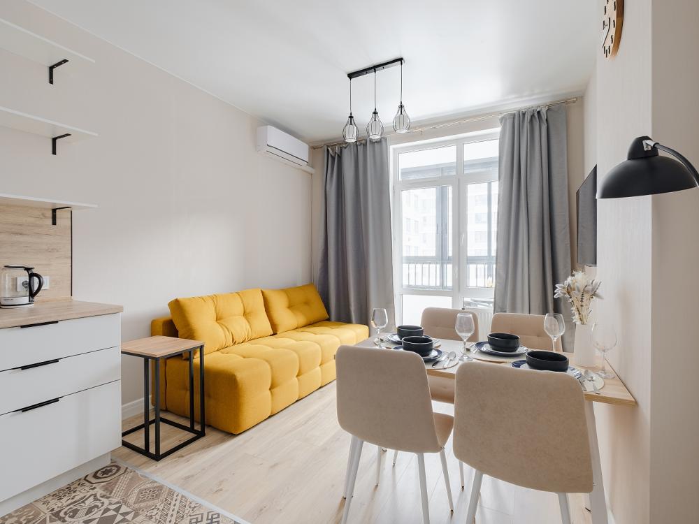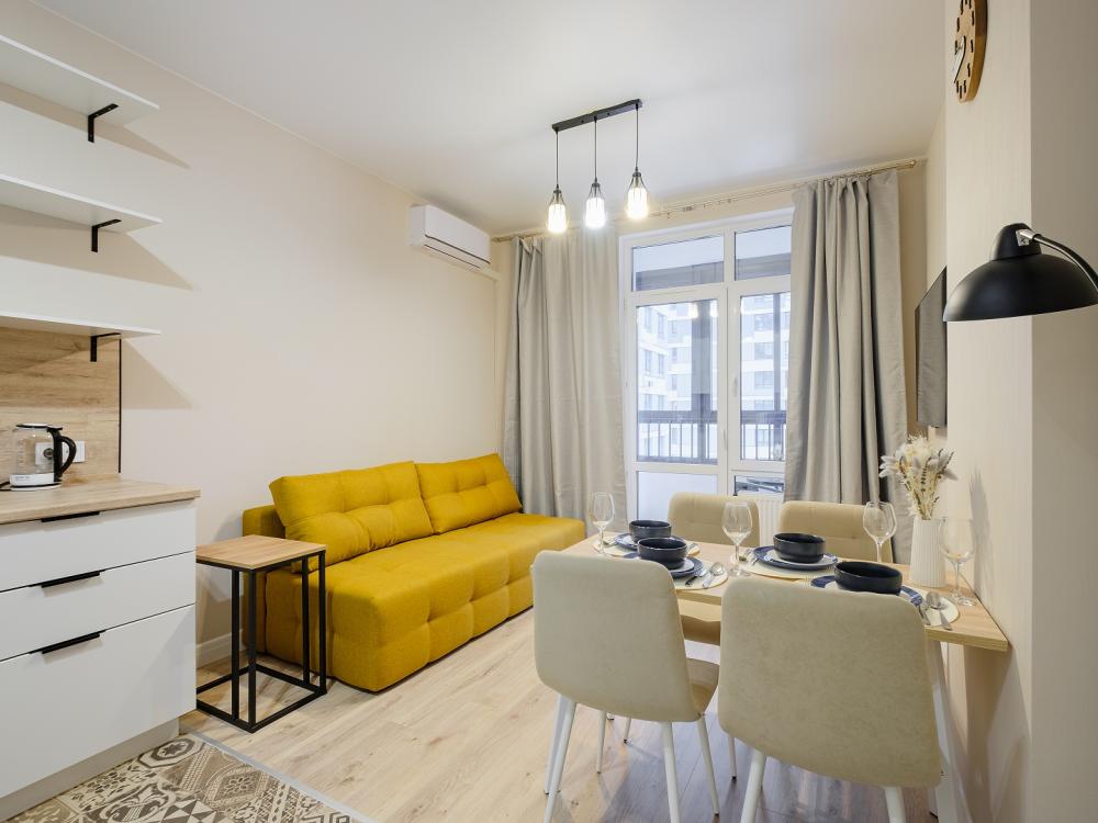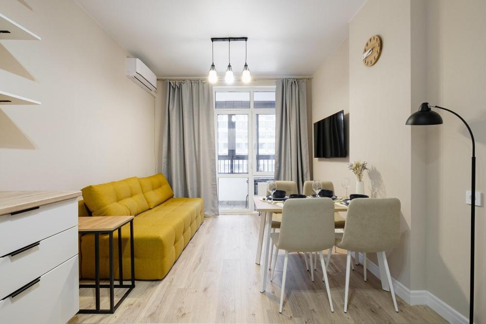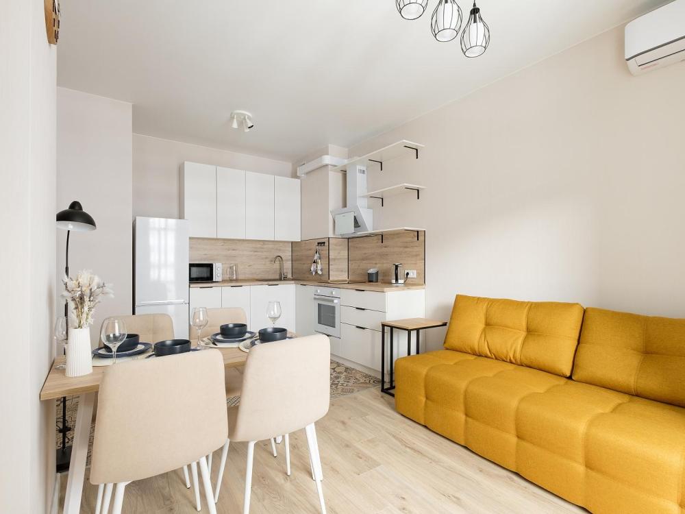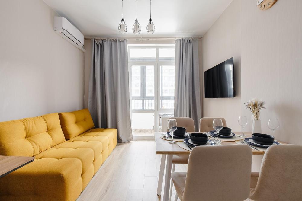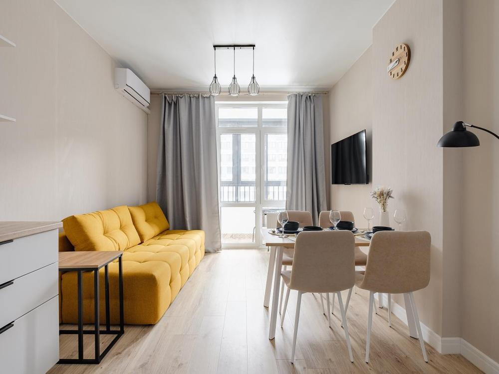 Уютны евродвухкомнатные апартаменты с просторной кухней - гостиной, отдельной спальней и полноценной ванной комнатой. Новый ремонт и современная техника: 2 телевизора smart в каждой комнате, кондиционер, плита и духовка, вытяжка, микроволновка, пылесос, утюг и гладильная доска, стиральная машина, фен. В спальне вместительный шкаф и двуспальная кровать со свежим бельем. Кухня оснащена посудой и аксессуарами, необходимыми для готовки. В гостиной зоне расположен удобный диван на двоих.