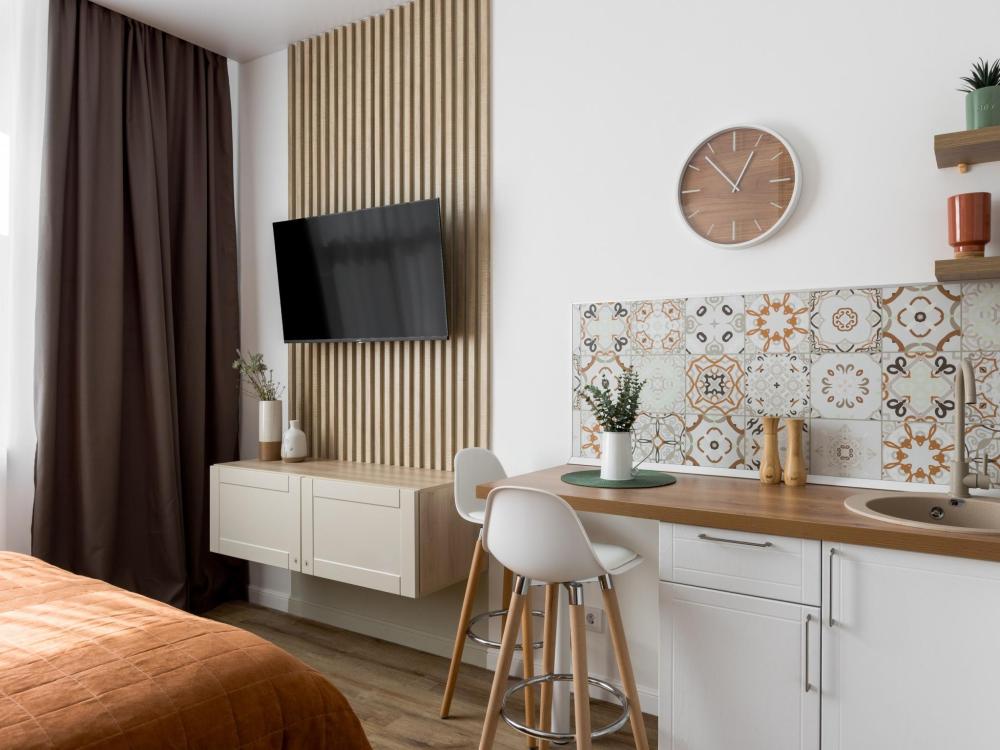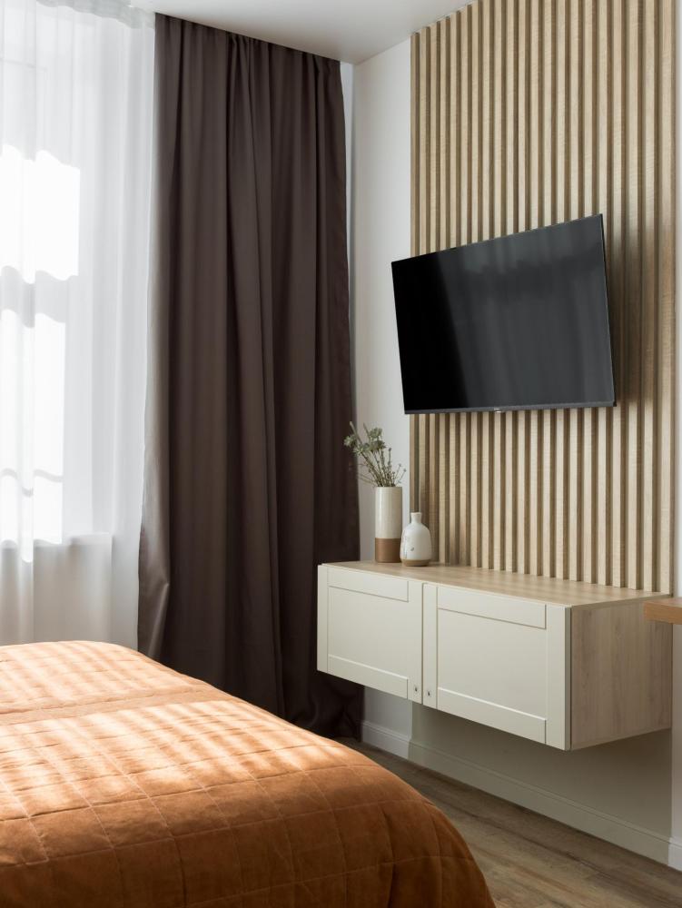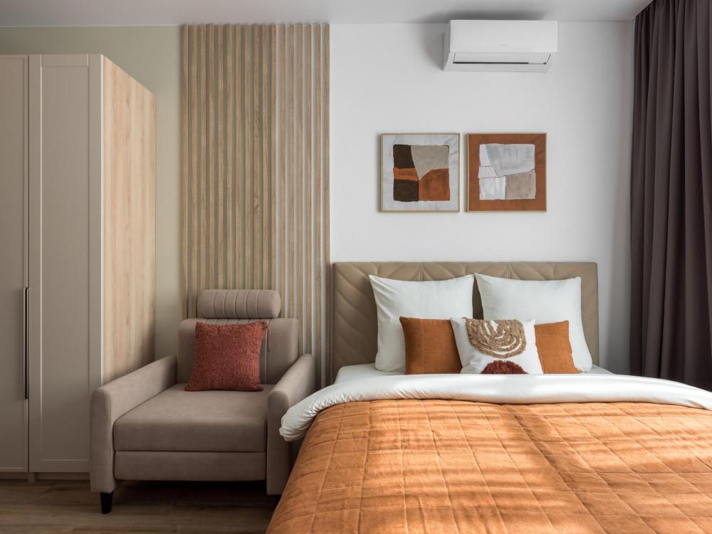 Апартаменты оснащены: Мультимедиа: Wi-Fi, Телевидение Бытовая техника: Электрическая плита, Холодильник, Чайник, Утюг, Фен, Стиральная машина, Кондиционер, Микроволновая печь. Наполнение: Полотенца, постельное бельё, столовые приборы, шампунь, гель для душа, мыло, тапочки, зубной набор, швейный набор, чай, кофе, книги, настольные игры. Удобства: Двухспальная кровать 140х200. Диван раскладной 120х200.