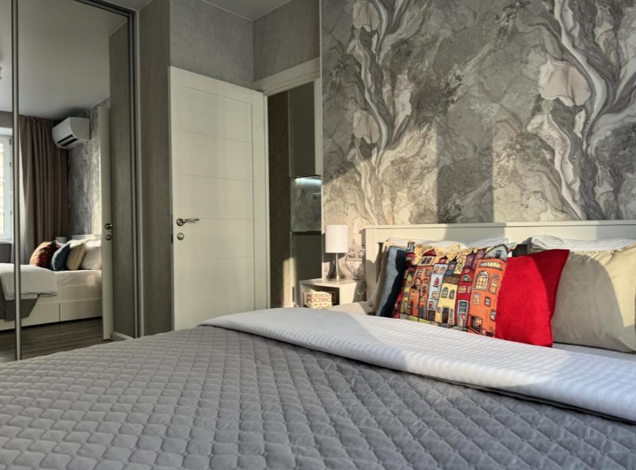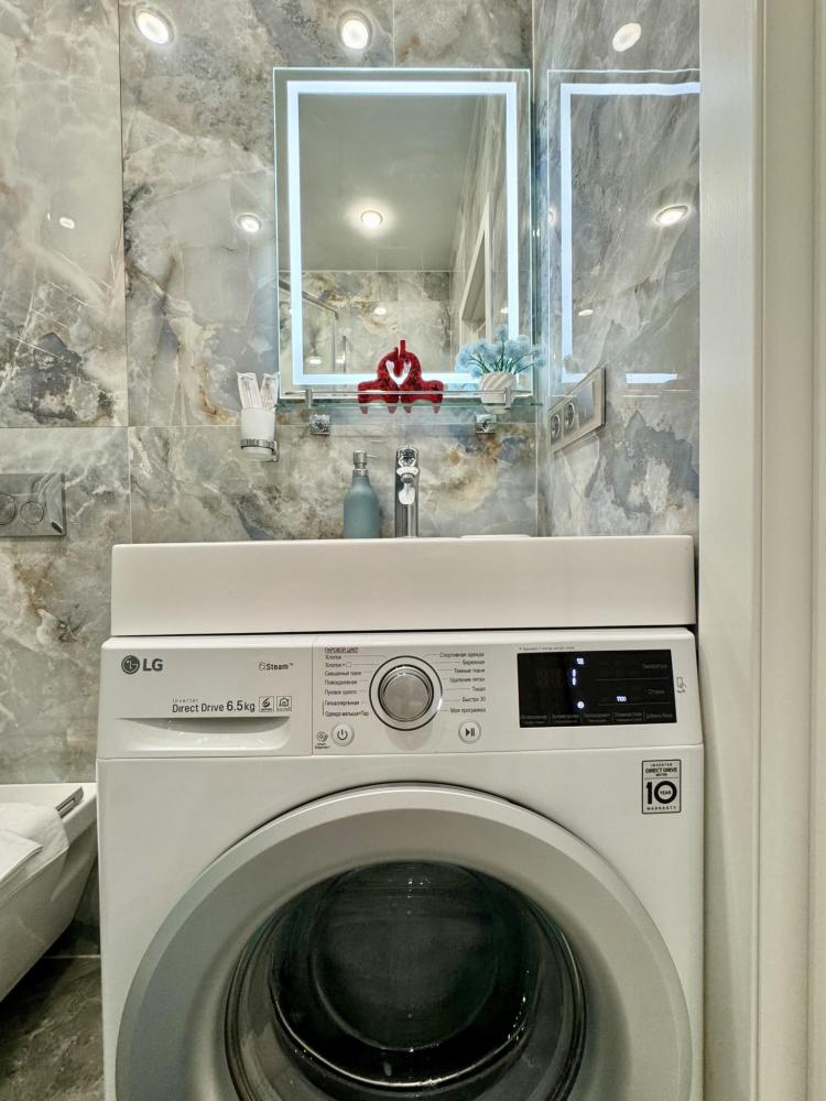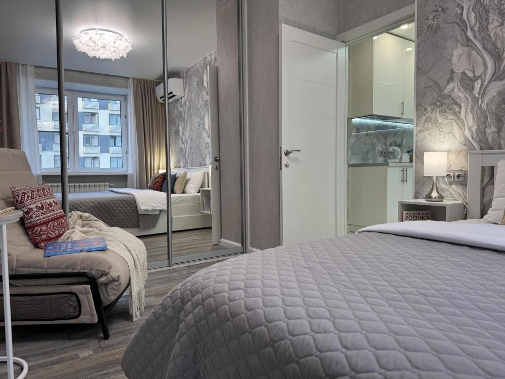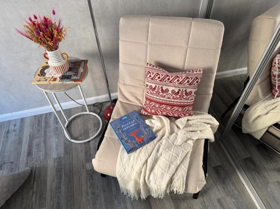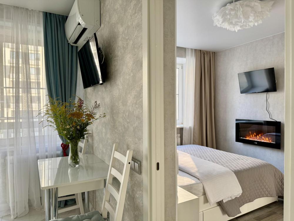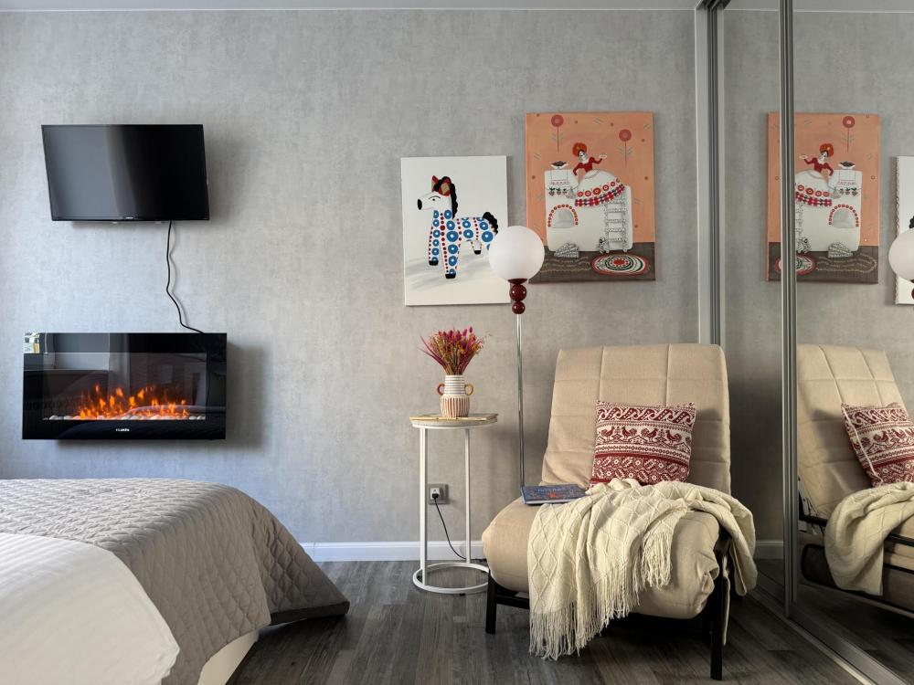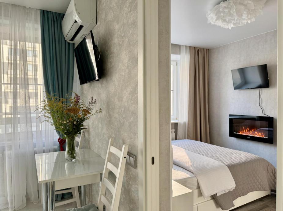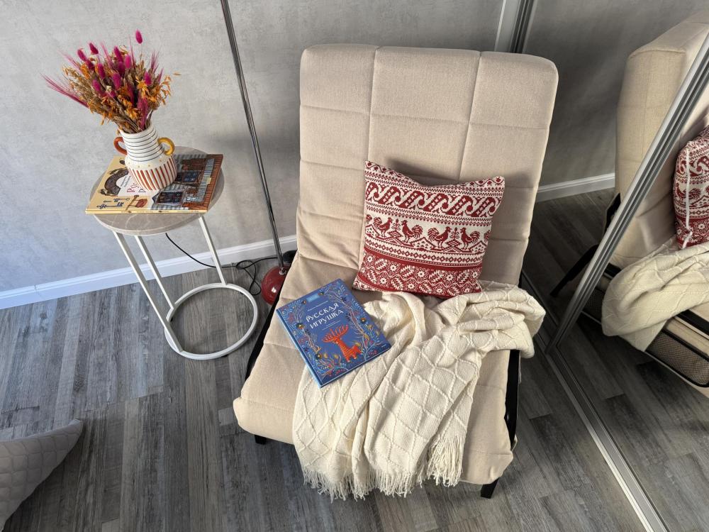 Уютные апартаменты с арт-объектами в русском стиле. Спальные места: двуспальная кровать с удобным матрасом, односпальный диван-кровать, кресло кровать. Кондиционеры установлены во всех помещениях, телевизоры в комнате и кухне-гостиной с функцией Смарт ТВ. На кухне установлен фильтр с трехступенчатой системой очистки воды. Гостям предоставляются: полотенца, постельное белье, тапочки, гель для душа, шампунь, средство для умывания, стиральный порошок и кондиционер для белья, средство для мытья посуды, в том числе в посудомоечной машине, чай, кофе, сахар, соль. В квартире есть теплые полы. В комнате установлен камин. Квартира оборудована современной техникой для комфортного проживания: посудомоечной машиной, капсульной кофемашиной, тостером, стиральной машиной, а так же самоваром с функцией Термопот, электрический чайник. Также в квартире есть: утюг, гладильная доска, раскладная сушилка для одежды, сушка для обуви.