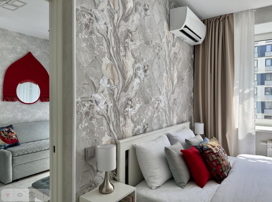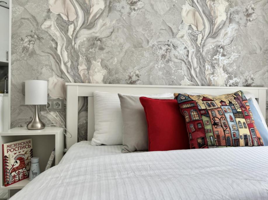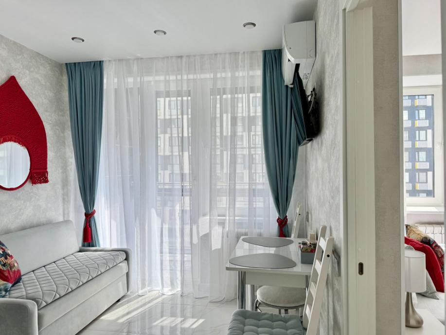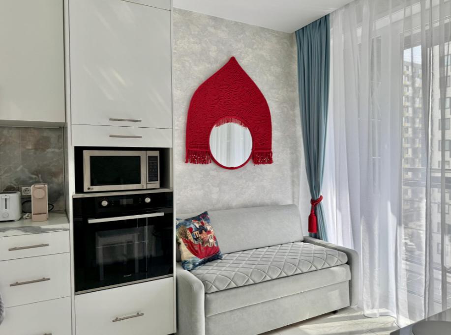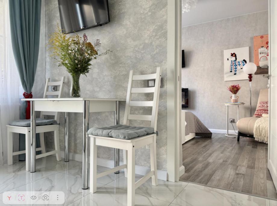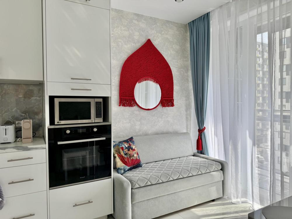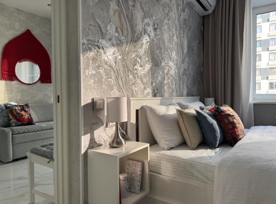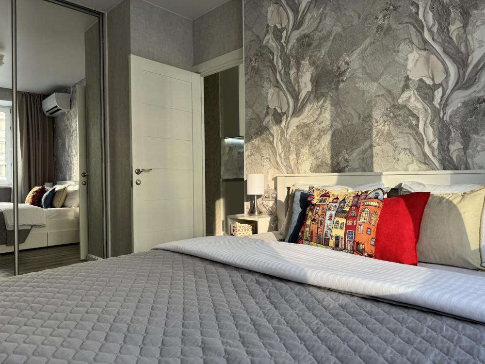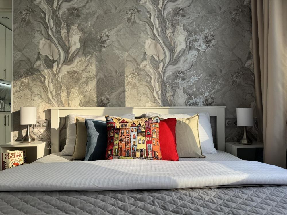 Уютные апартаменты с арт-объектами в русском стиле. Спальные места: двуспальная кровать с удобным матрасом, односпальный диван-кровать, кресло кровать. Кондиционеры установлены во всех помещениях, телевизоры в комнате и кухне-гостиной с функцией Смарт ТВ. На кухне установлен фильтр с трехступенчатой системой очистки воды. Гостям предоставляются: полотенца, постельное белье, тапочки, гель для душа, шампунь, средство для умывания, стиральный порошок и кондиционер для белья, средство для мытья посуды, в том числе в посудомоечной машине, чай, кофе, сахар, соль. В квартире есть теплые полы. В комнате установлен камин. Квартира оборудована современной техникой для комфортного проживания: посудомоечной машиной, капсульной кофемашиной, тостером, стиральной машиной, а так же самоваром с функцией Термопот, электрический чайник. Также в квартире есть: утюг, гладильная доска, раскладная сушилка для одежды, сушка для обуви.