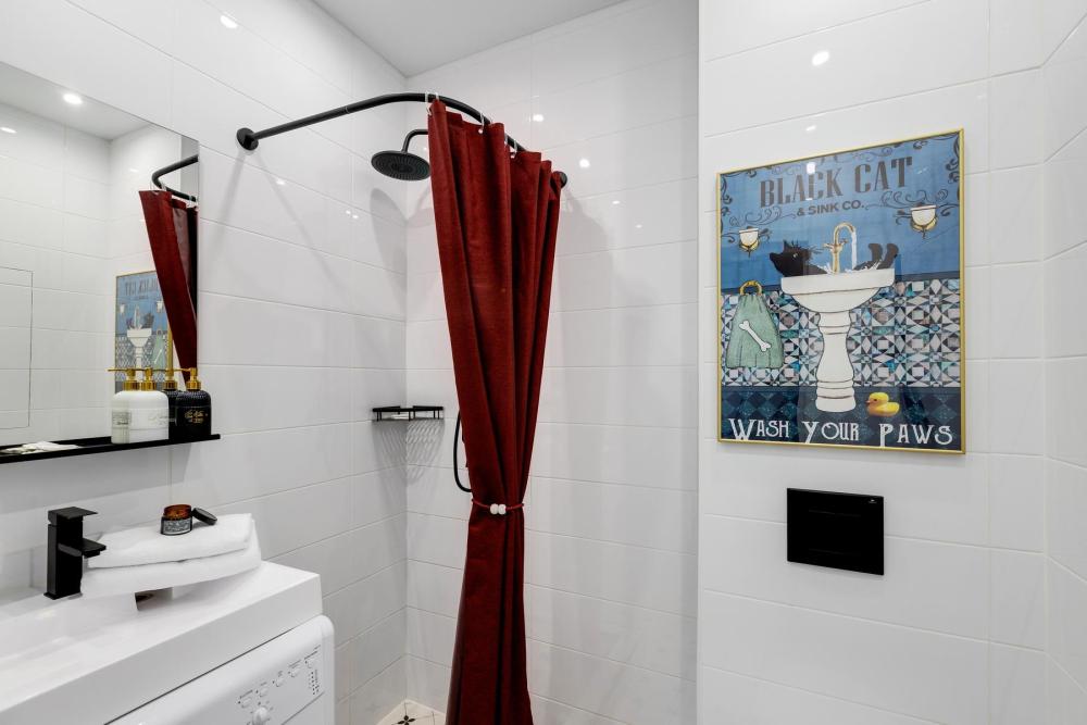 В квартире есть: шкаф, двуспальная кровать, полотенца, постельные принадлежности, стиральная машина, сушка для одежды, утюг, гладильная доска, телевизор, фен, чайник, столовые приборы, посуда, кастрюля, сковорода, чай, кофе, вода, сахар, гель для душа, шампунь, мыло, комплект белоснежных полотенец и постельного белья.