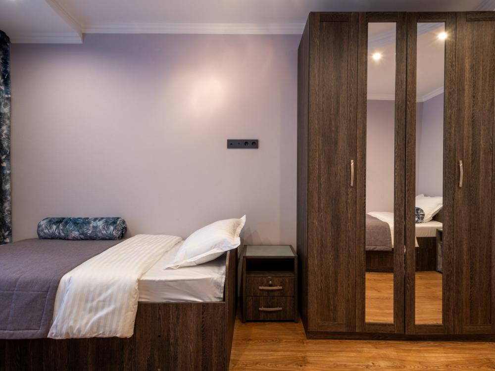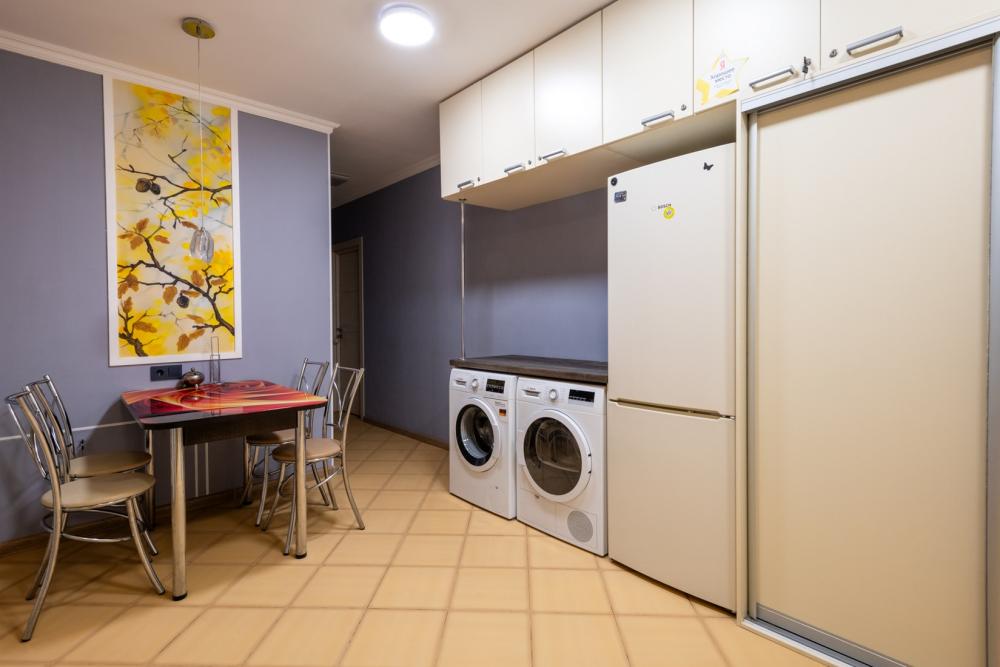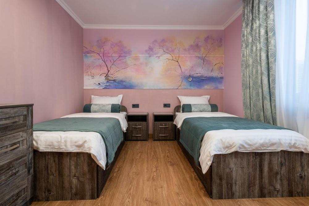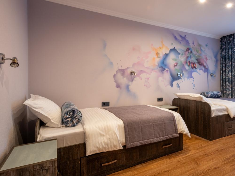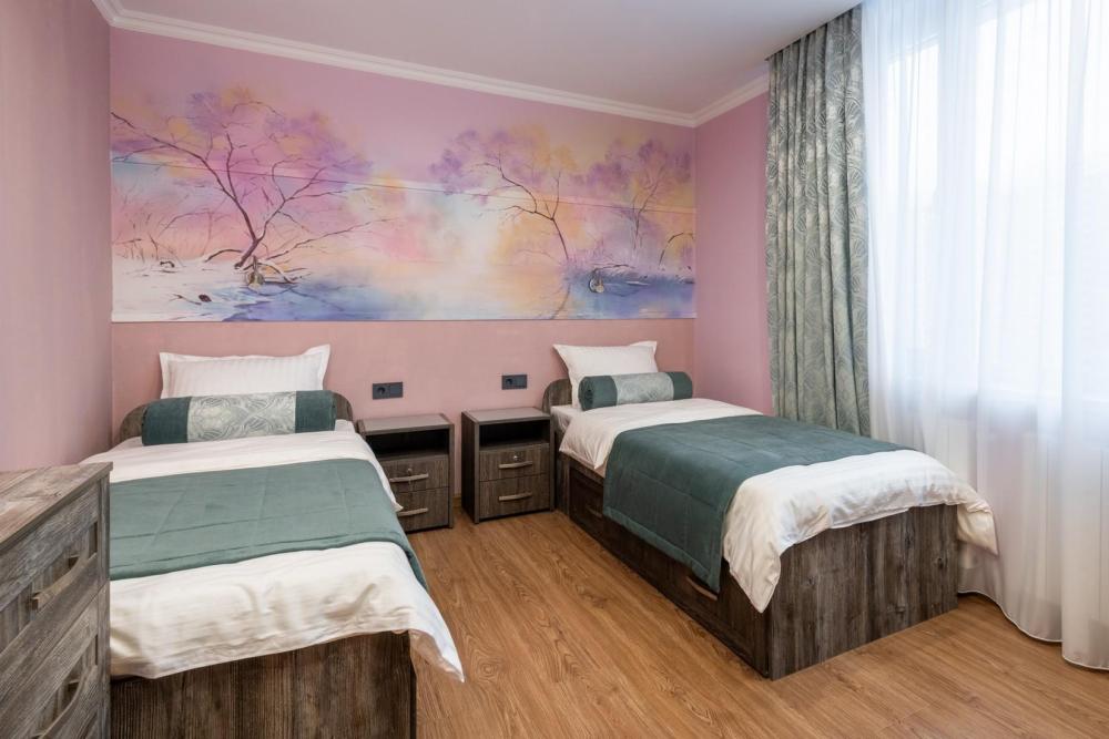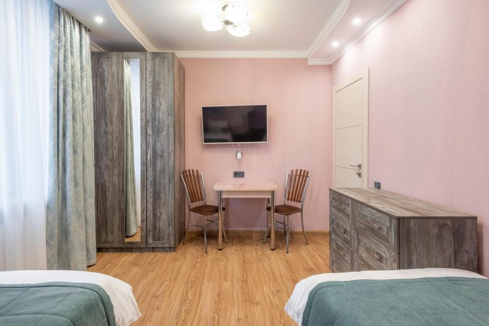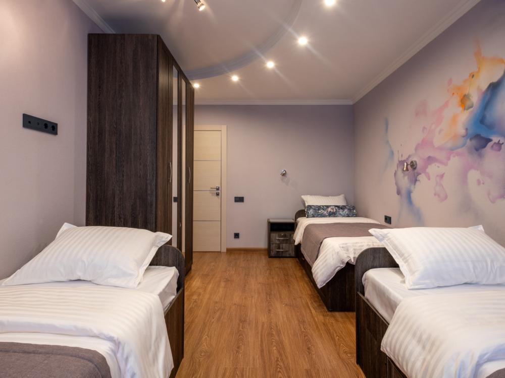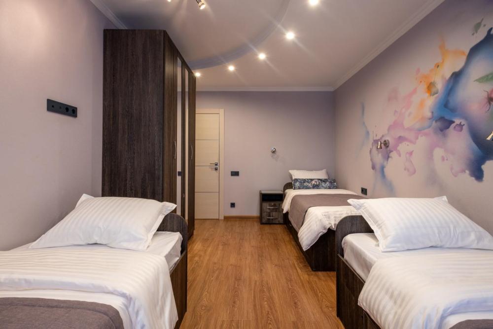 Апартаменты четырёхкомнатные площадью 83 кв.м с видом во двор. Подходит для размещения 10 человек. Имеет 4 спальни с приятным интерьером и гостиную. В номере: 8 односпальных кроватей и 1 двуспальная кровать. Индивидуальная ванная комната и кухня. Имеется телевизор, кондиционер, шкаф, вешалка, рабочий стол, чайник, холодильник, стулья, зеркало, посуда, плита, столовые приборы, стиральная машина, сушилка для белья, утюг, гладильная доска. В стоимость входит: Постельное бельё, полотенца, фен, тапочки, ванные принадлежности (шампунь, гель для душа ,мыло) WI-Fi бесплатно на всей территории. Бесплатная общественная парковка за территорией.