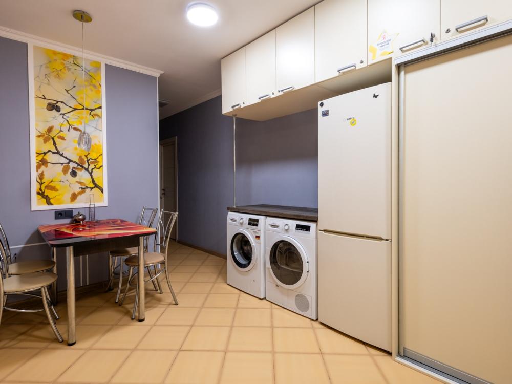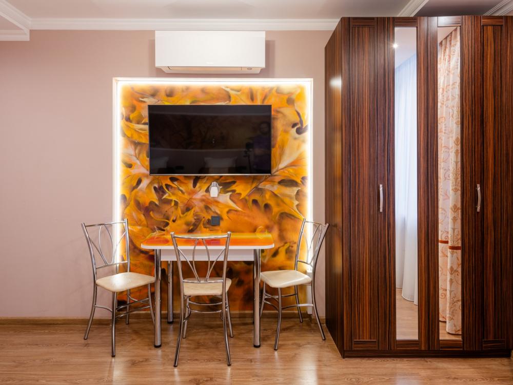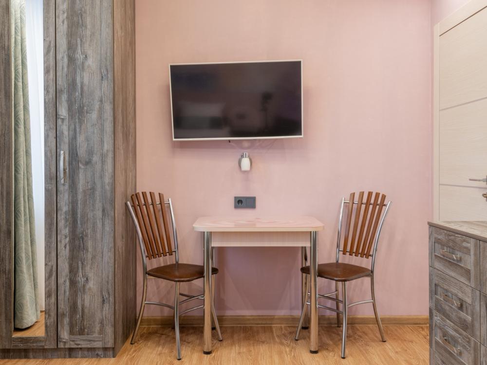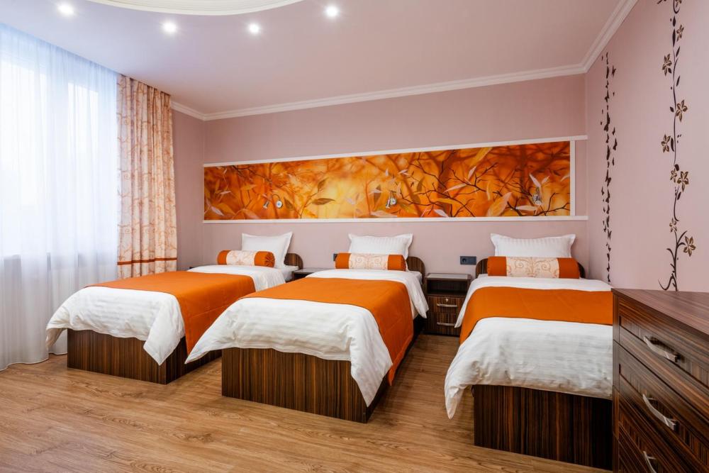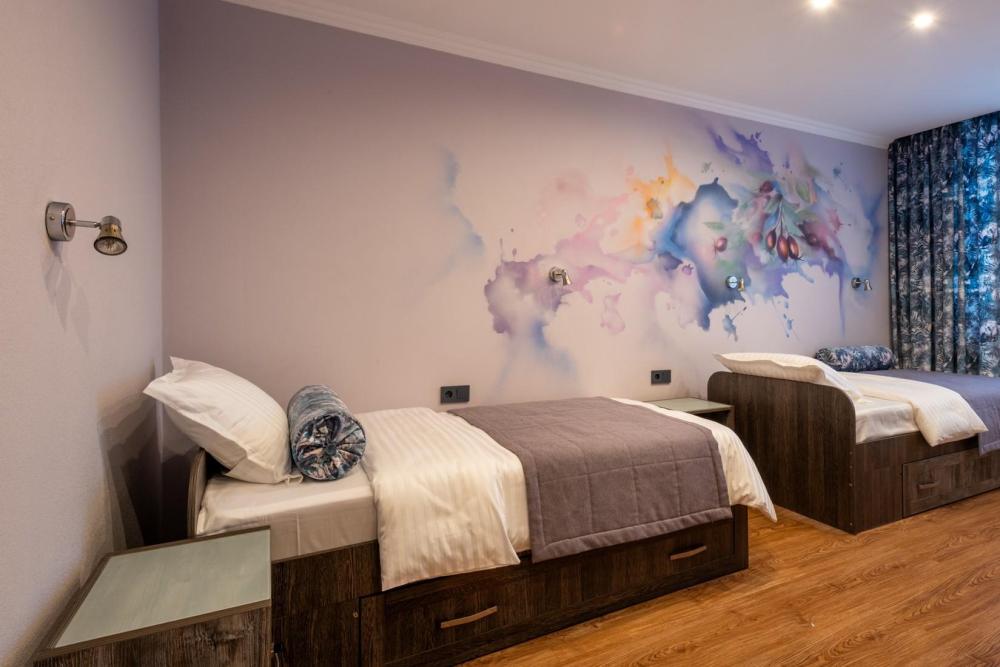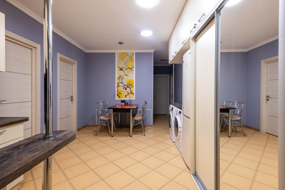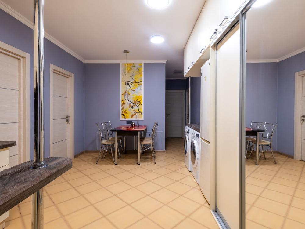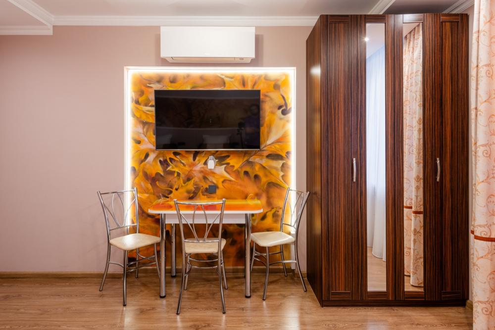 Апартаменты четырёхкомнатные площадью 83 кв.м с видом во двор. Подходит для размещения 10 человек. Имеет 4 спальни с приятным интерьером и гостиную. В номере: 8 односпальных кроватей и 1 двуспальная кровать. Индивидуальная ванная комната и кухня. Имеется телевизор, кондиционер, шкаф, вешалка, рабочий стол, чайник, холодильник, стулья, зеркало, посуда, плита, столовые приборы, стиральная машина, сушилка для белья, утюг, гладильная доска. В стоимость входит: Постельное бельё, полотенца, фен, тапочки, ванные принадлежности (шампунь, гель для душа ,мыло) WI-Fi бесплатно на всей территории. Бесплатная общественная парковка за территорией.