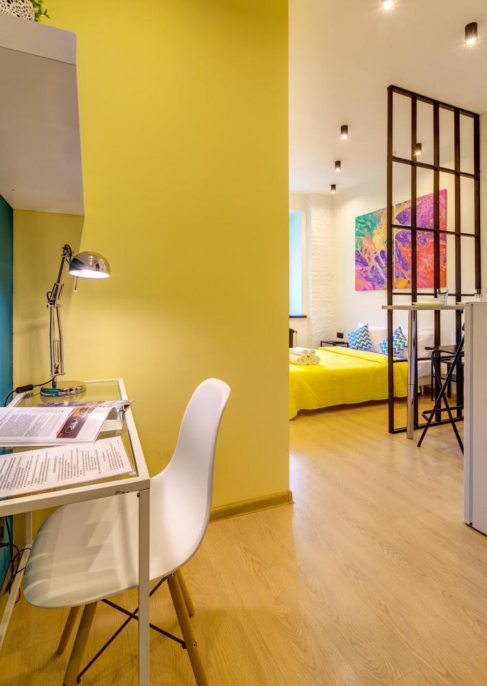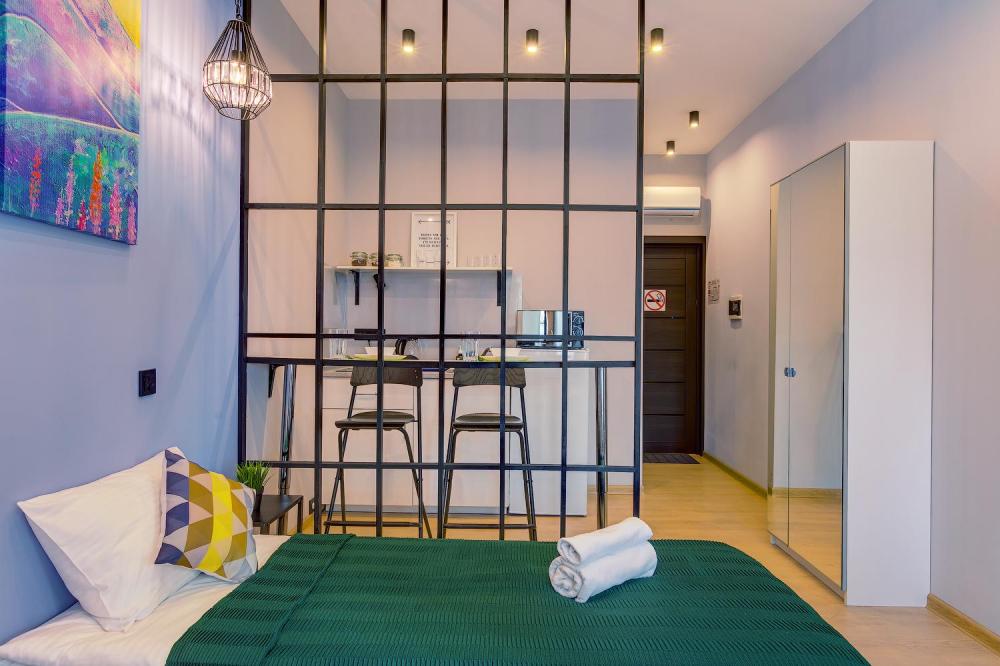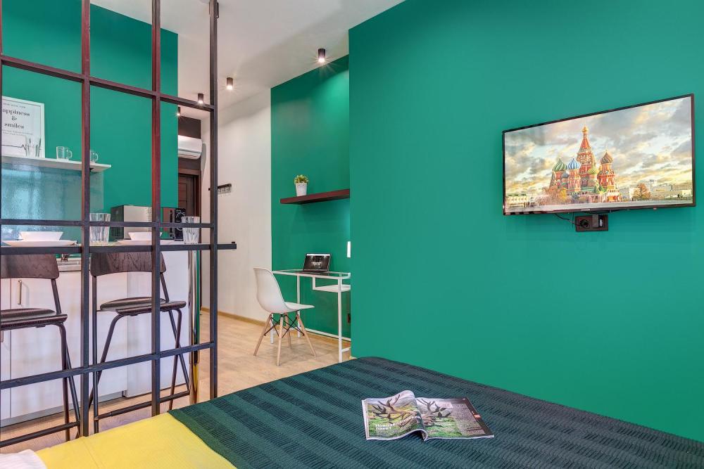 Стильная студия площадью 18 кв.м. с видом на тихий дворик. Размещение рассчитано для 1-2 человек. Дополнительно можно поставить детскую манеж-кроватку. Преимущества студии: Полностью оборудованная мини-кухня — плита, микроволновка, холодильник, чайник, полный набор посуды и встроенный фильтр для питьевой воды. Комфортный сон: двуспальная кровать 140×200 см, плотные шторы и тихий кондиционер — отдых без уличного шума благодаря окнам во двор. Для работы и досуга: быстрый Wi-Fi (100 Мбит) и Smart TV с подпиской на Кинопоиск — подойдёт для удалённой работы и вечерних фильмов. Удобства для длительного проживания: утюг и гладильная доска, стиральная машина (в общем доступе), свежие полотенца и ежедневная уборка. Ванная комната: душ, фен, полотенца, тапочки и качественные туалетно-косметические принадлежности. Апартаменты расположены на четвертом и пятом этажах исторического здания рядом с метро Арбатская.