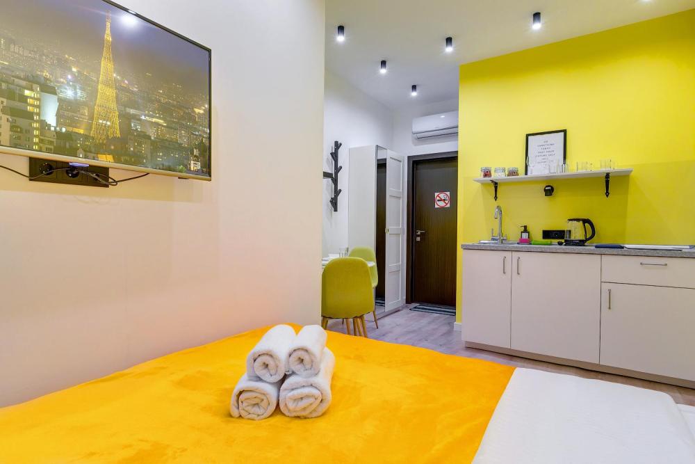 Студия площадью 21 кв.м. с прекрасным видом на Арбат. В номере можно подготовить до заезда на выбор 1 двуспальную кровать либо две односпальные. Размещение рассчитано для 1-2 человек. Дополнительно можно поставить детскую манеж-кроватку. Преимущества студии: Полностью оборудованная мини-кухня — плита, микроволновка, холодильник, чайник, полный набор посуды и встроенный фильтр для питьевой воды. Комфортный сон: двуспальная кровать 160×200 см или две односпальные, плотные шторы и тихий кондиционер — отдыхайте полноценно после насыщенного дня. Для работы и отдыха: быстрый Wi-Fi 100 Мбит и Smart TV с подпиской на Кинопоиск — удобно и для конференций, и для вечера с фильмом. Удобства для длительного проживания: утюг и гладильная доска, стиральная машина (в общем доступе), свежие полотенца и ежедневная уборка. Ванная комната: душ, фен, тапочки и качественные туалетно-косметические принадлежности. Апартаменты расположены на четвертом и пятом этажах исторического здания рядом с метро Арбатская.