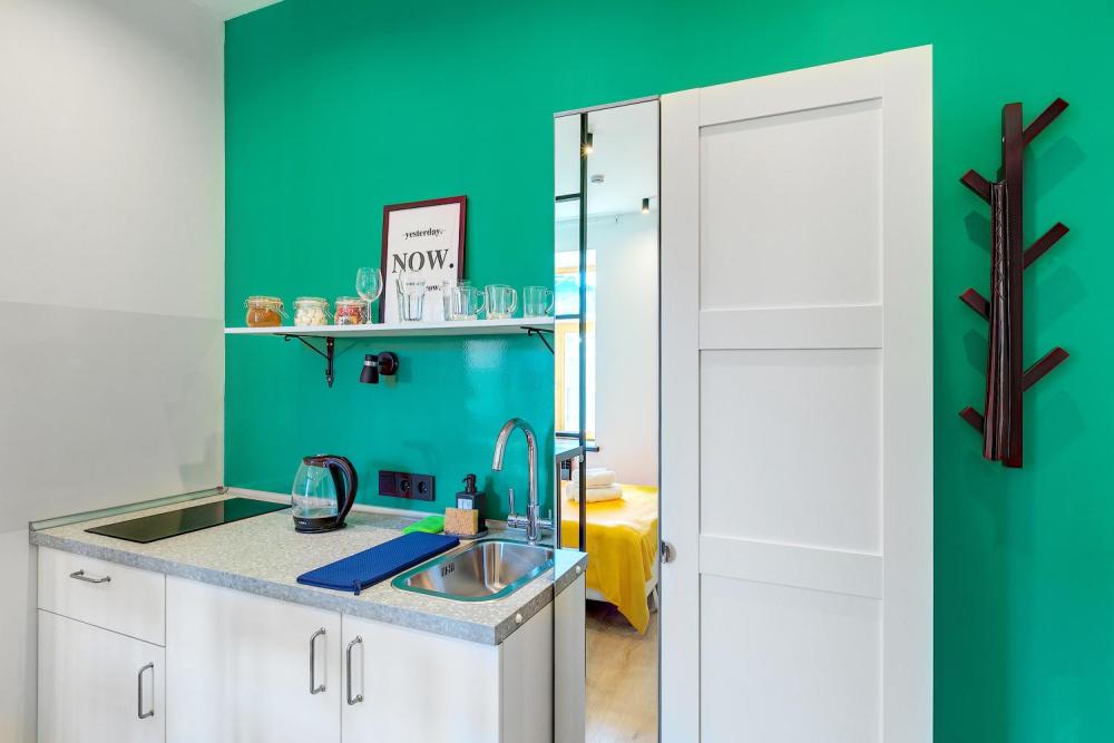 Стильные светлые студии в стиле фьюжн с видом на тихий двор. В апартаментах большая двуспальная кровать и ортопедический матрас подойдет для размещения двух гостей или семьи с маленьким ребёнком. В общем холле есть мягкий угол, где можно распечатать документы или провести время до заселения. В апартаментах полностью оборудована кухня и обеденная зона. Есть плита, микроволновка, телевизор, Wi-Fi, стиральная и сушильная машины. Мы предоставляем детскую кроватку, ступеньку и горшок по запросу без дополнительной оплаты. Обратите внимание, в этой категории 4 апартамента, выполненные в разных цветовых гаммах. Размер и наполнение апартаментов не отличается. Гостю доступно: - Полотенца и постельное бельё; - Мыло, гель для душа и шампунь; - Фен и тапочки; - Полноценная кухня - плита, микроволновка, чайник и набор посуды для готовки; - Чай, кофе, сахар и соль; - Фильтр очистки воды; - WiFi, принтер, телевизор с подпиской на Youtube и Netflix; - Стиральная и сушильная машины, гладильная доска и утюг.