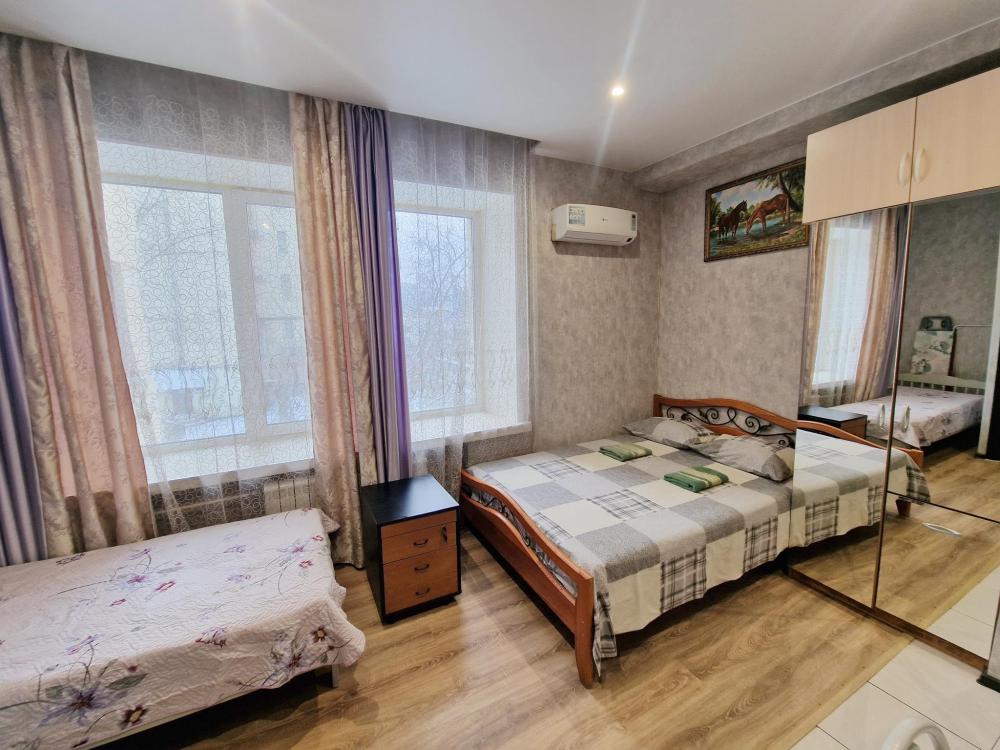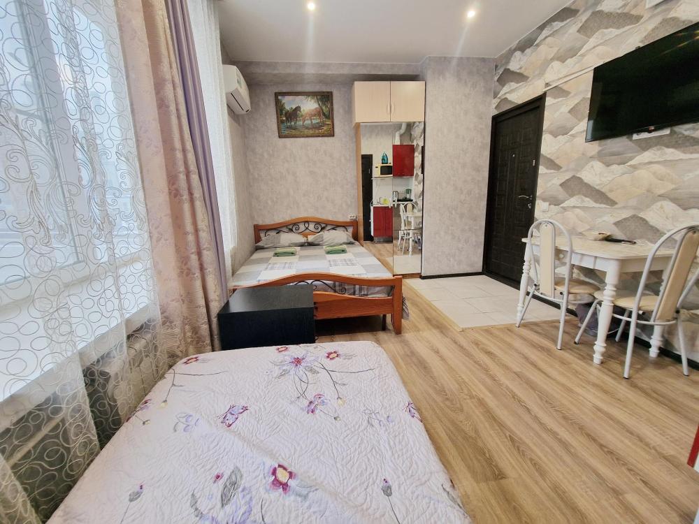 Студия с вместимостью до 4 гостей. В квартире есть все, что нужно для комфортного проживания: две односпальные и двуспальная кровати, постельное белье и полотенца, посуда, микроволновка, телевизор, Wi-Fi, гигиенические и гладильные принадлежности, стиральная машина, холодильник, фен.