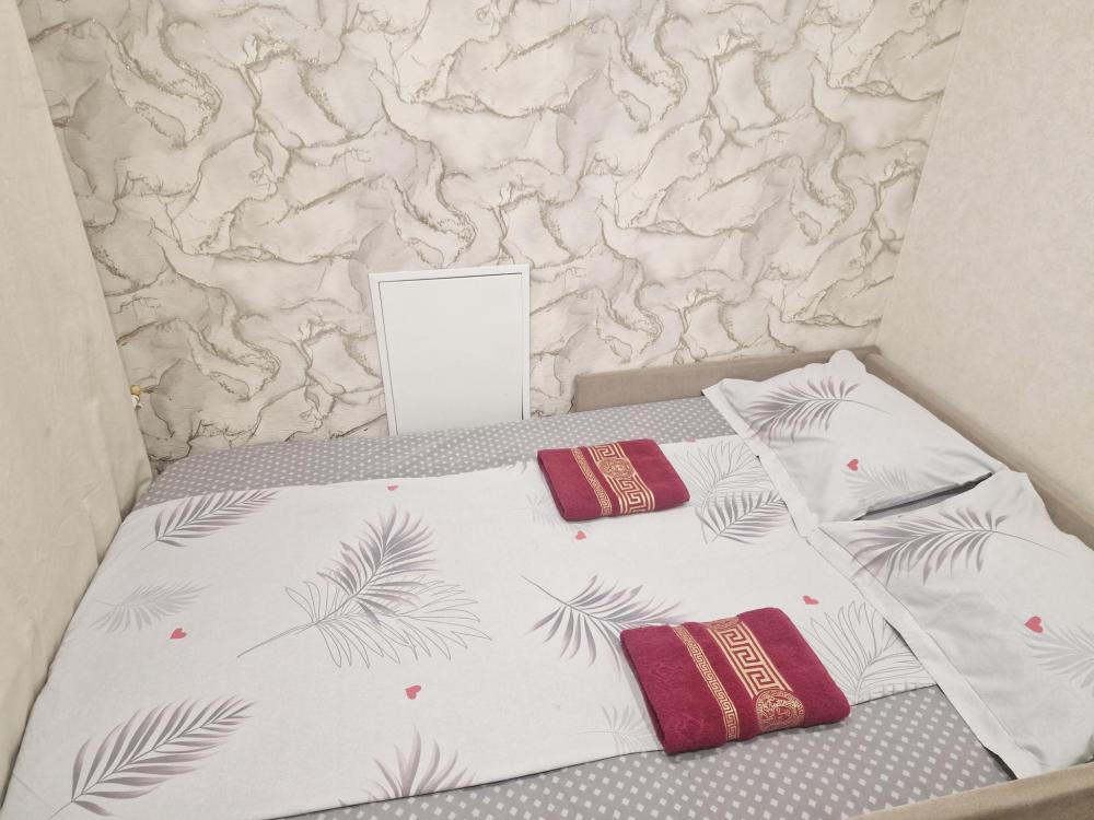 Студия с вместимостью до 2 гостей. В квартире есть все, что нужно для комфортного проживания: двуспальная кровать, раскладной диван, постельное белье и полотенца, посуда, микроволновка, телевизор, Wi-Fi, гигиенические и гладильные принадлежности, холодильник, фен.