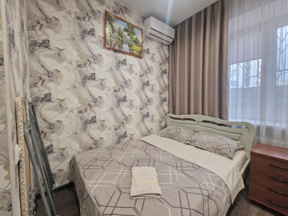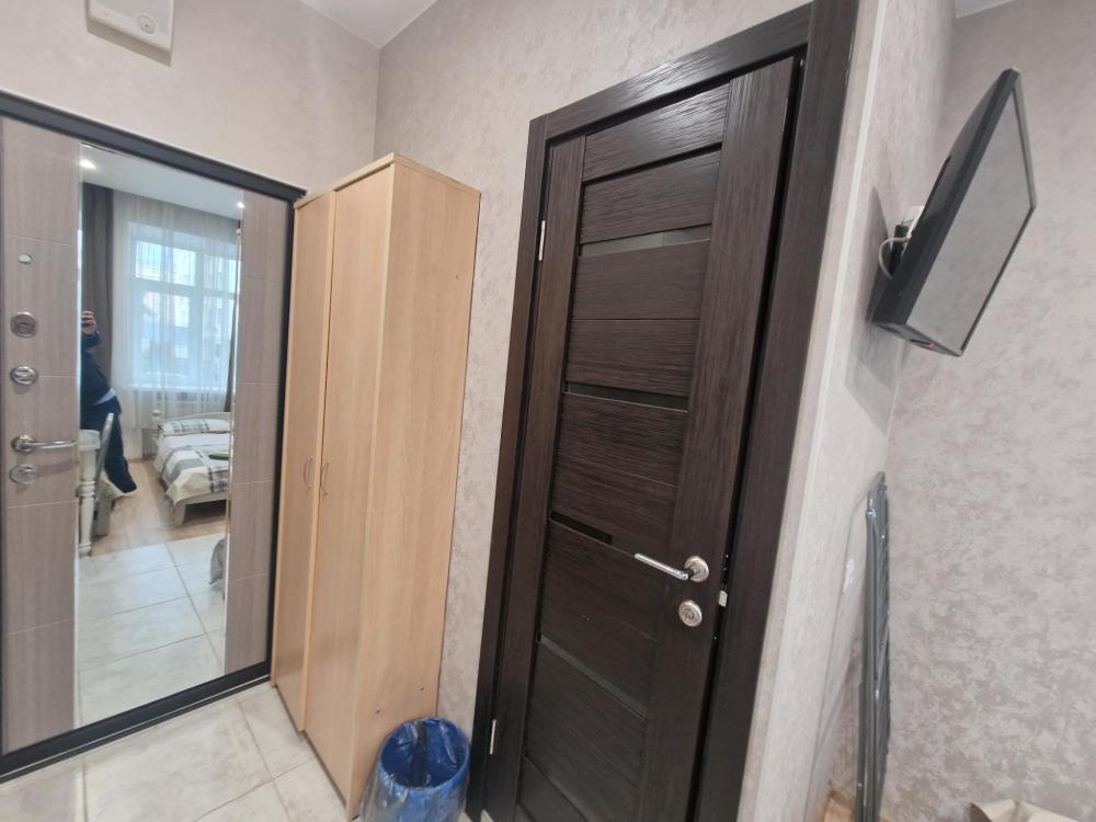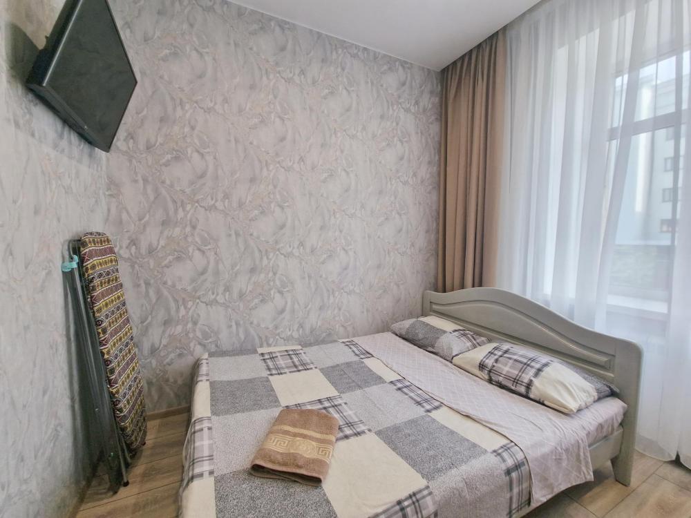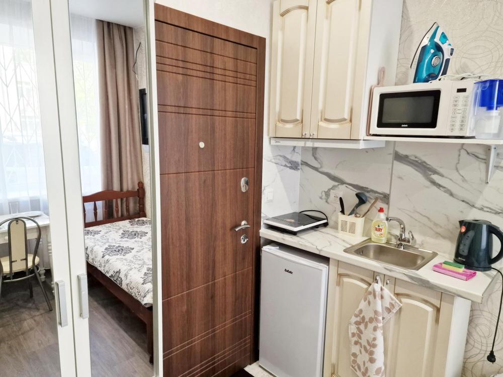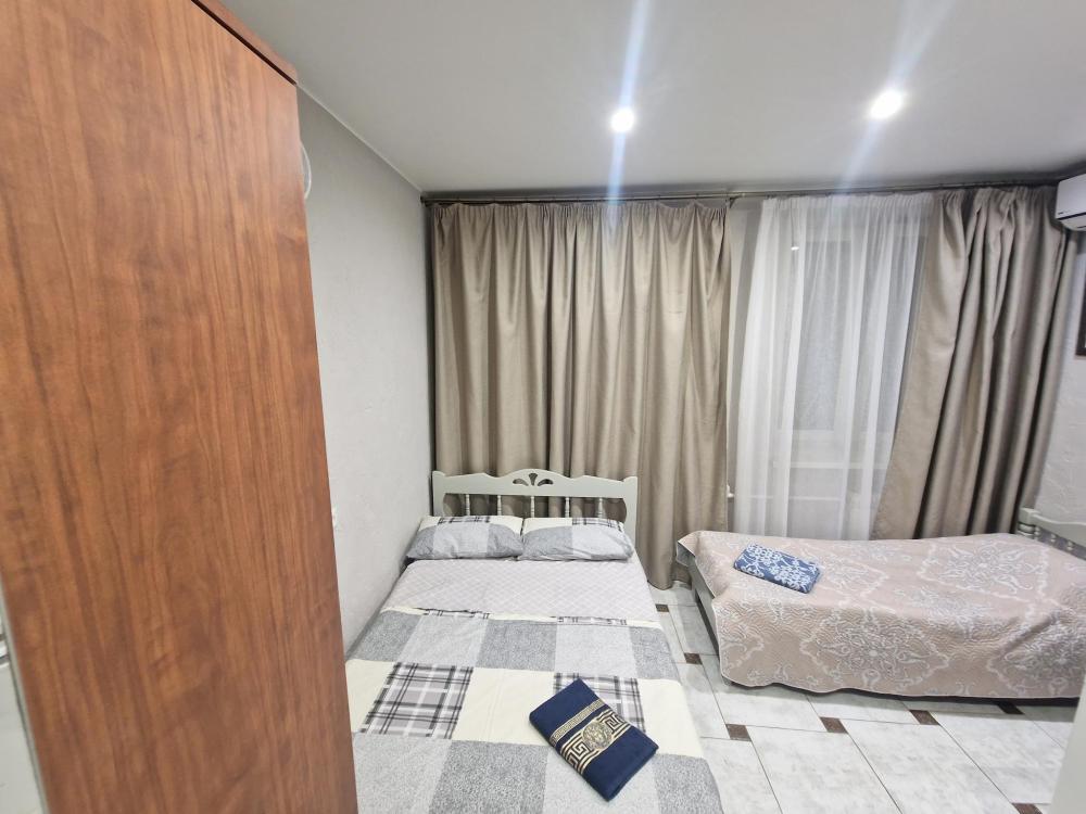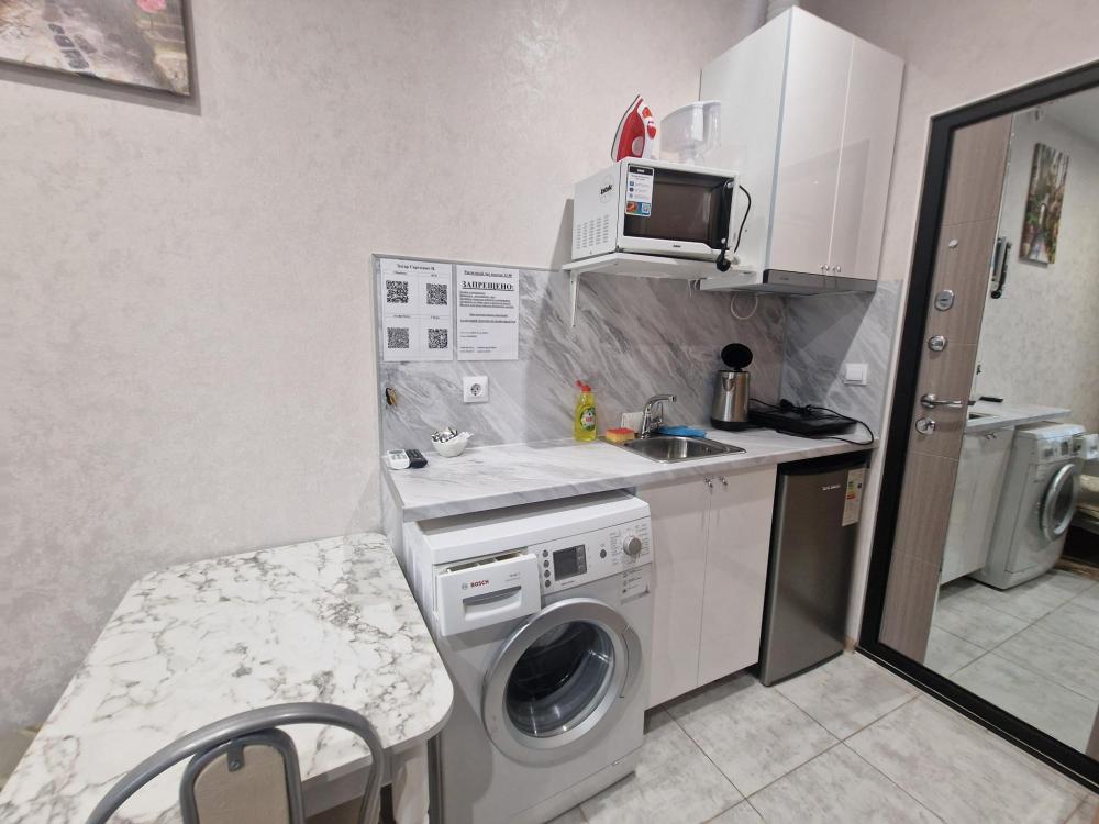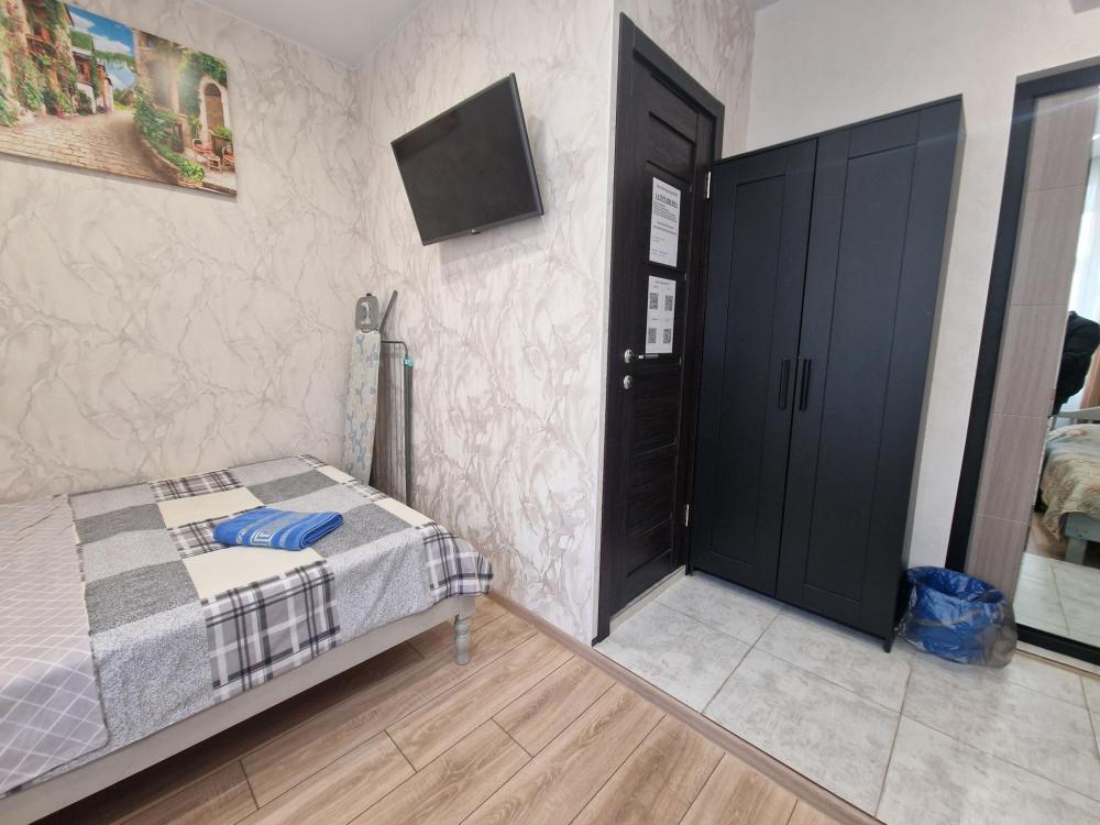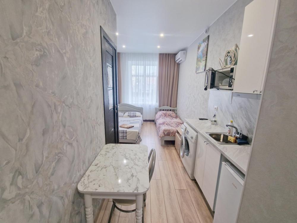 Студия с вместимостью до 3 гостей. В квартире есть все, что нужно для комфортного проживания: двуспальная и односпальная кровати, постельное белье и полотенца, посуда, микроволновка, телевизор, Wi-Fi, гигиенические и гладильные принадлежности, стиральная машина в общей зоне, холодильник, фен.