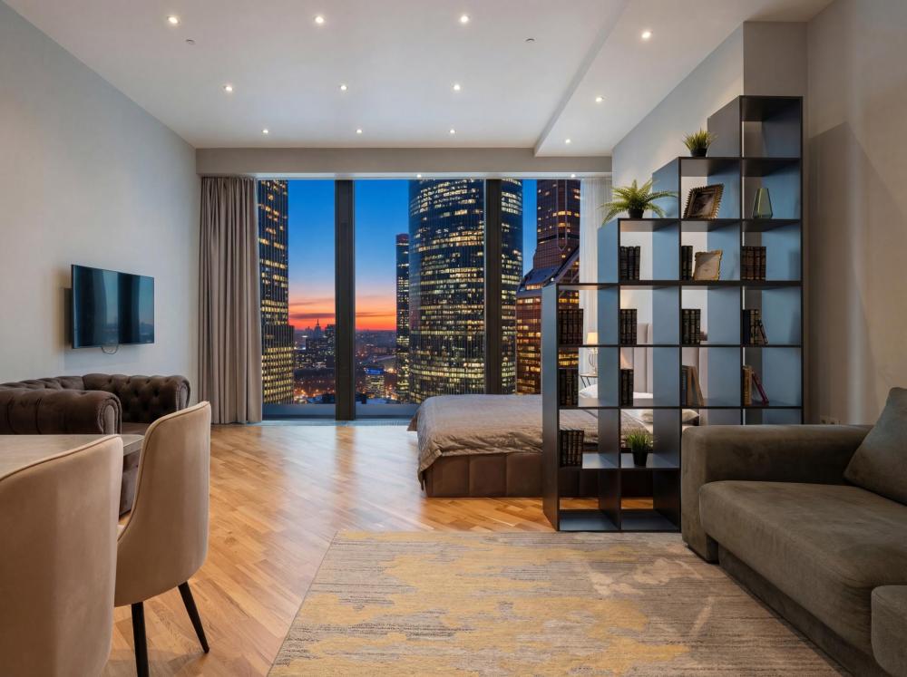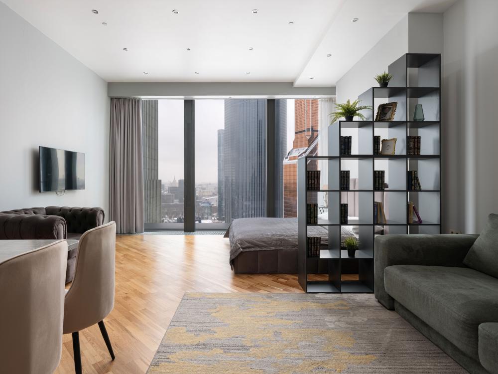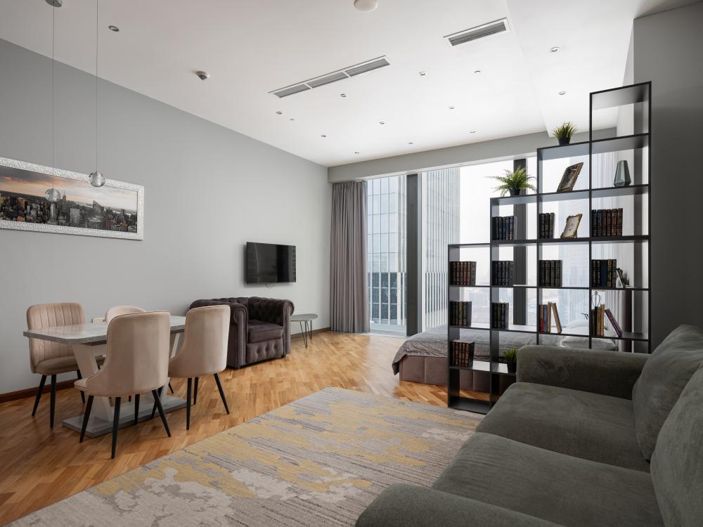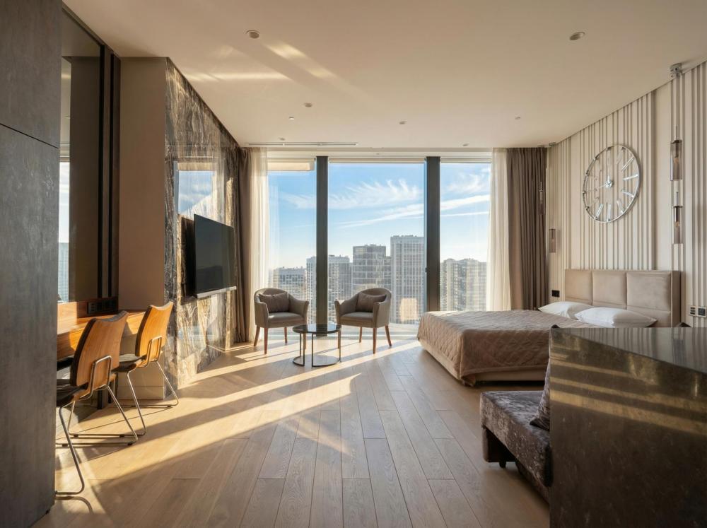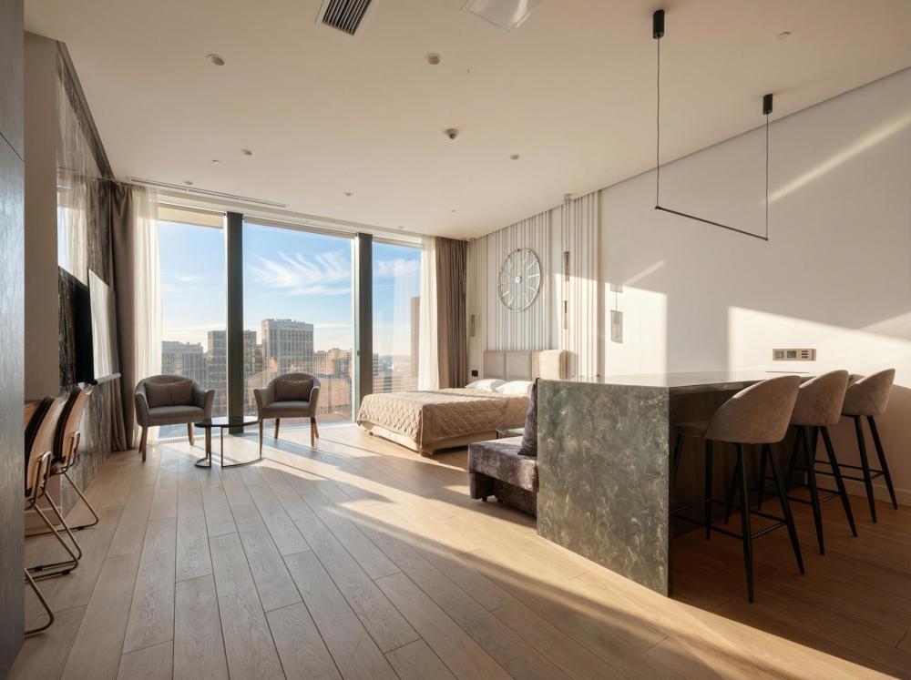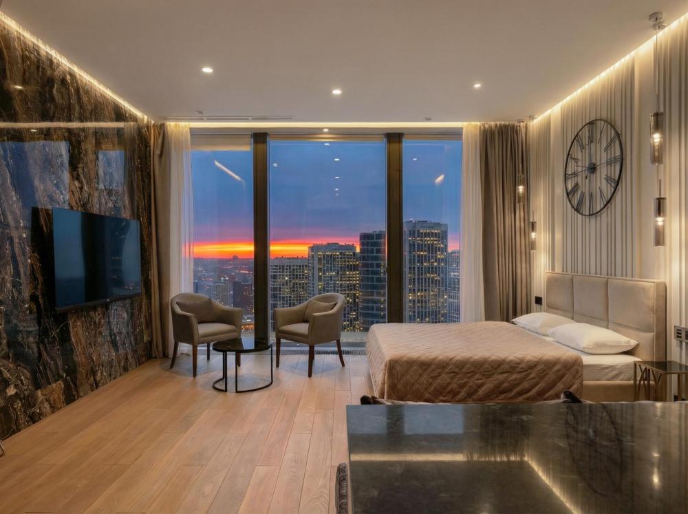 Уютная студия апартамент в башне "Нева" Sirius 51 кв.м. на 28 этаже с дизайнерским ремонтом и видом на городскую панораму. Вид на закатную сторону! Одна из самых новых башен Москвы Сити.