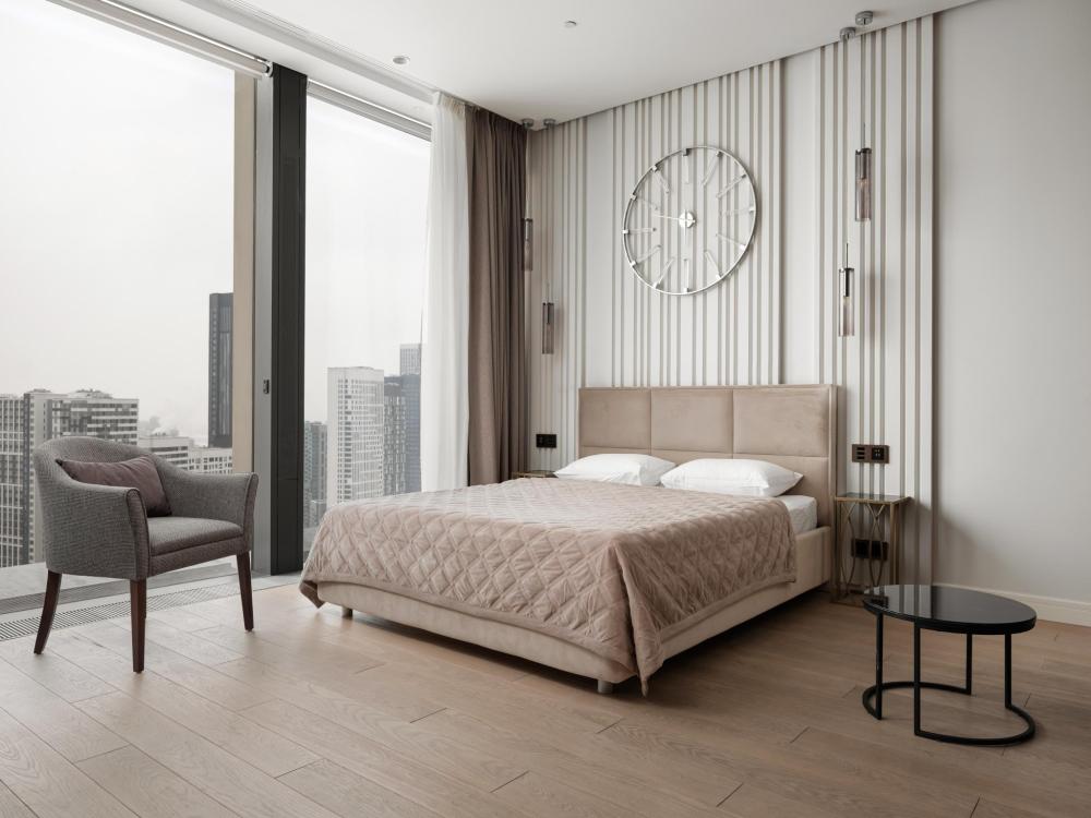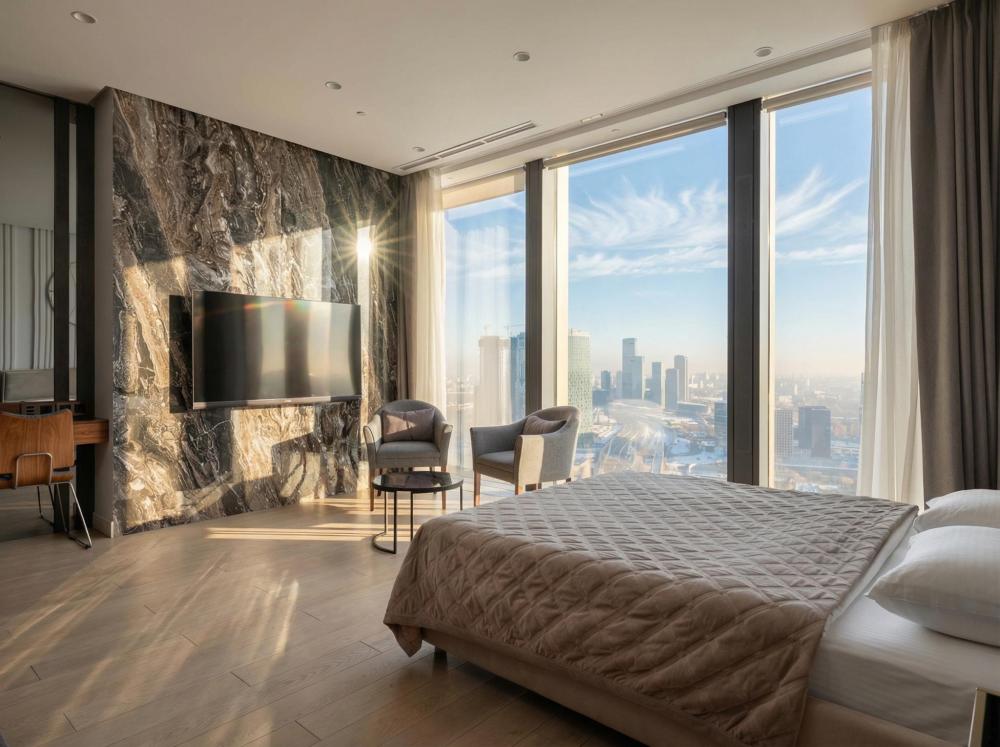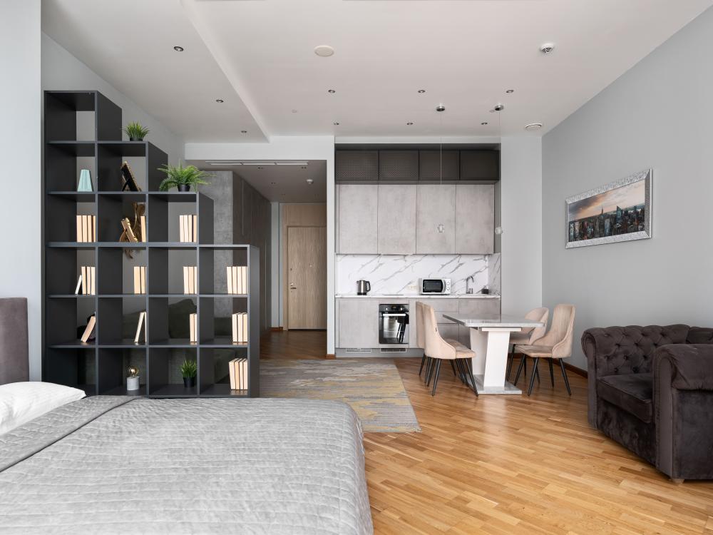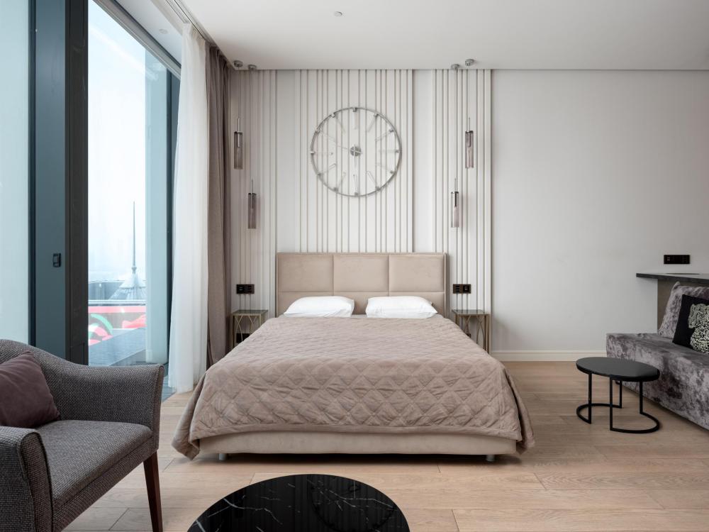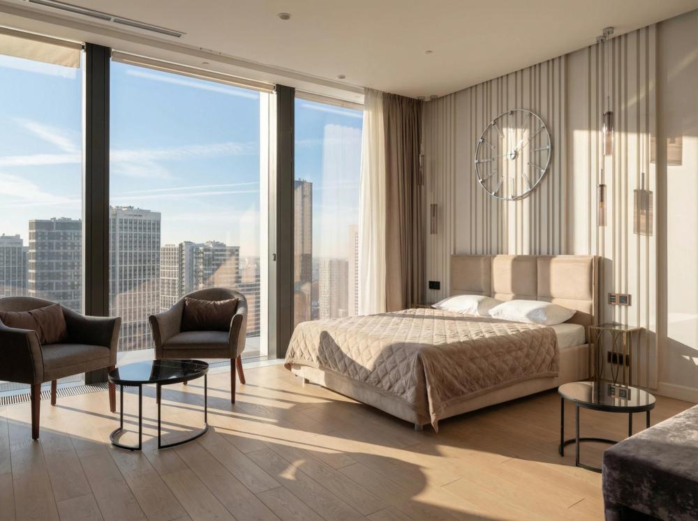 Уютная студия апартамент в башне "Нева" Sirius 51 кв.м. на 28 этаже с дизайнерским ремонтом и видом на городскую панораму. Вид на закатную сторону! Одна из самых новых башен Москвы Сити.
