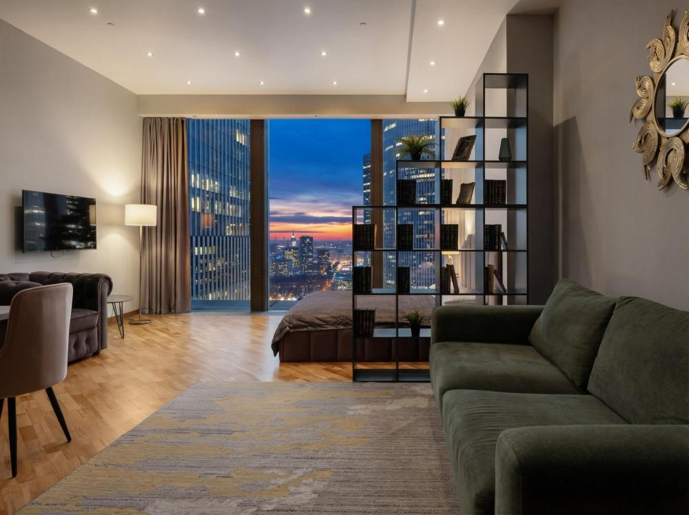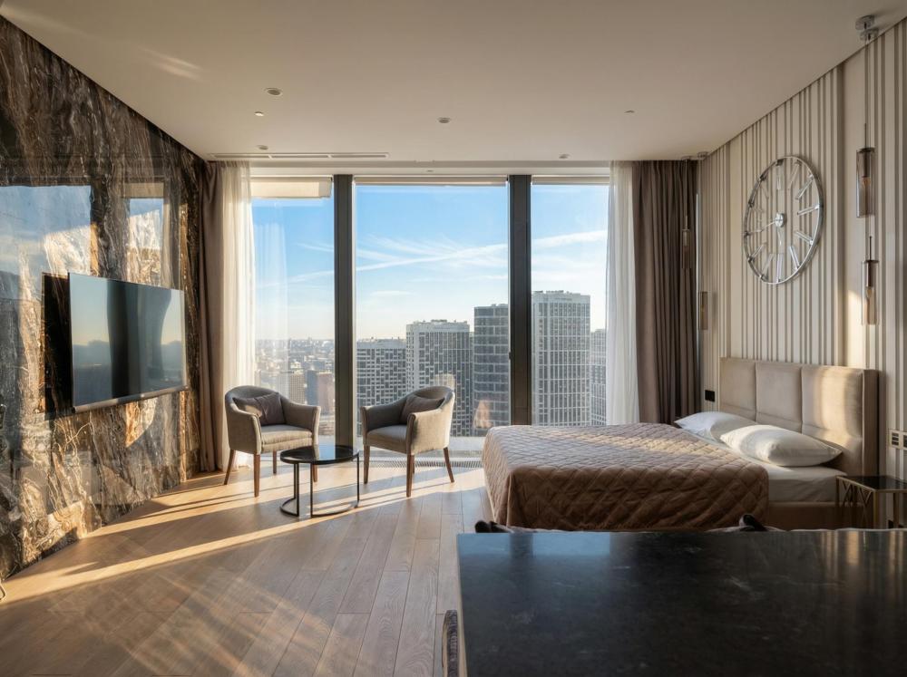 Стильная студия апартамент в башне "Нева" Nati 51 кв.м. на 59 этаже с дизайнерским ремонтом и видом на городскую панораму. Шикарный вид на город с высокого этажа! Одна из самых новых башен Москвы Сити.