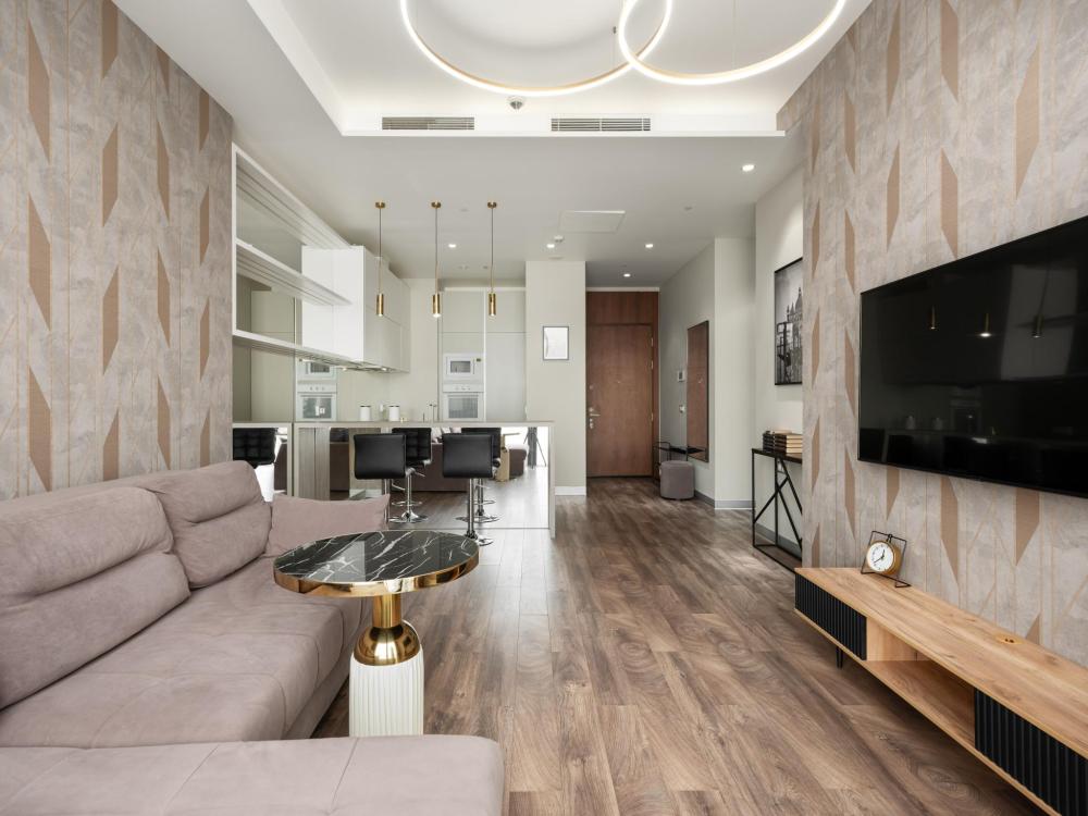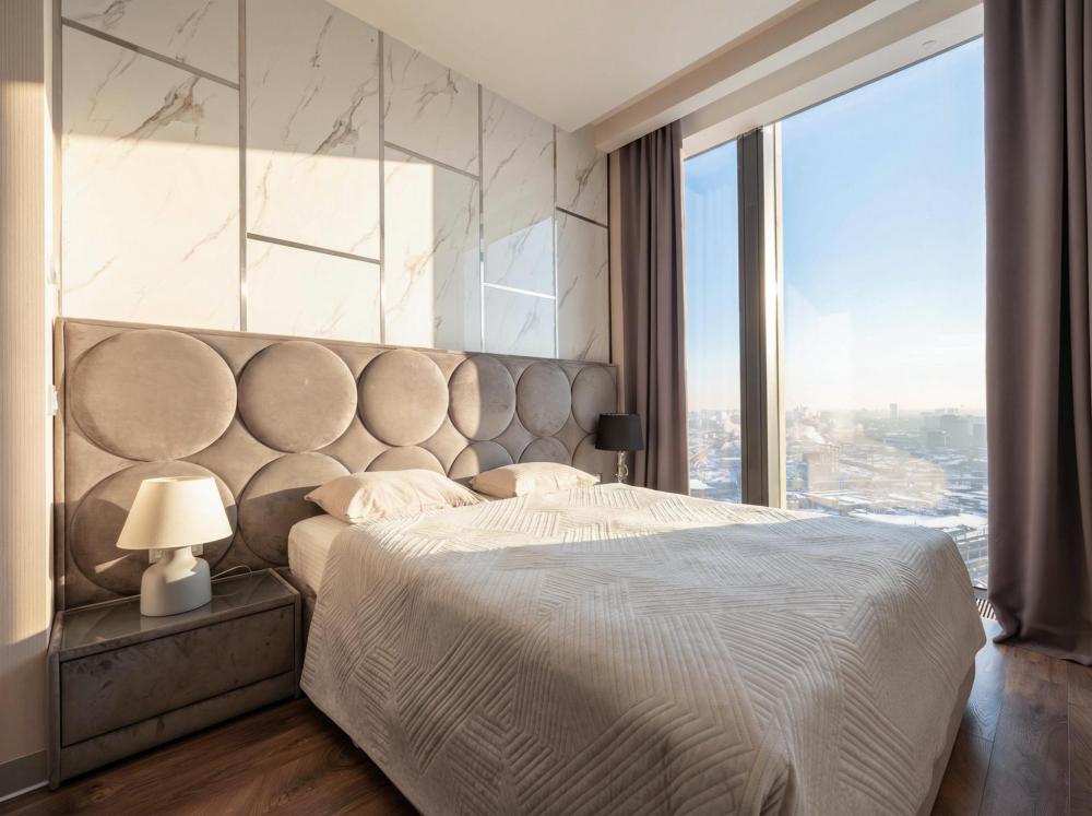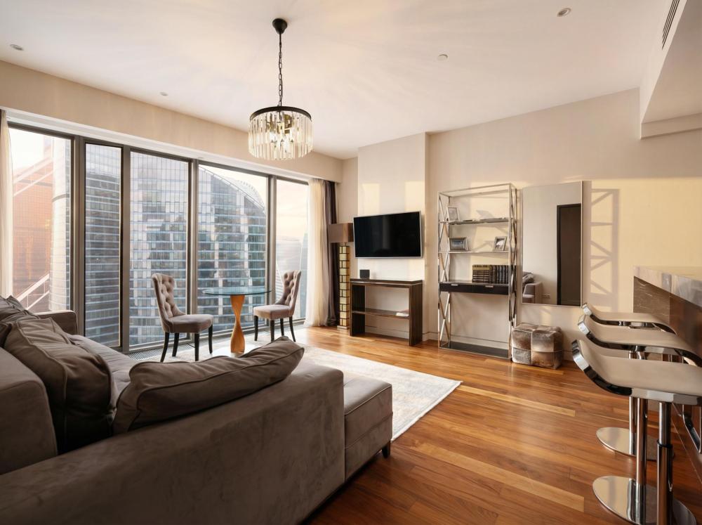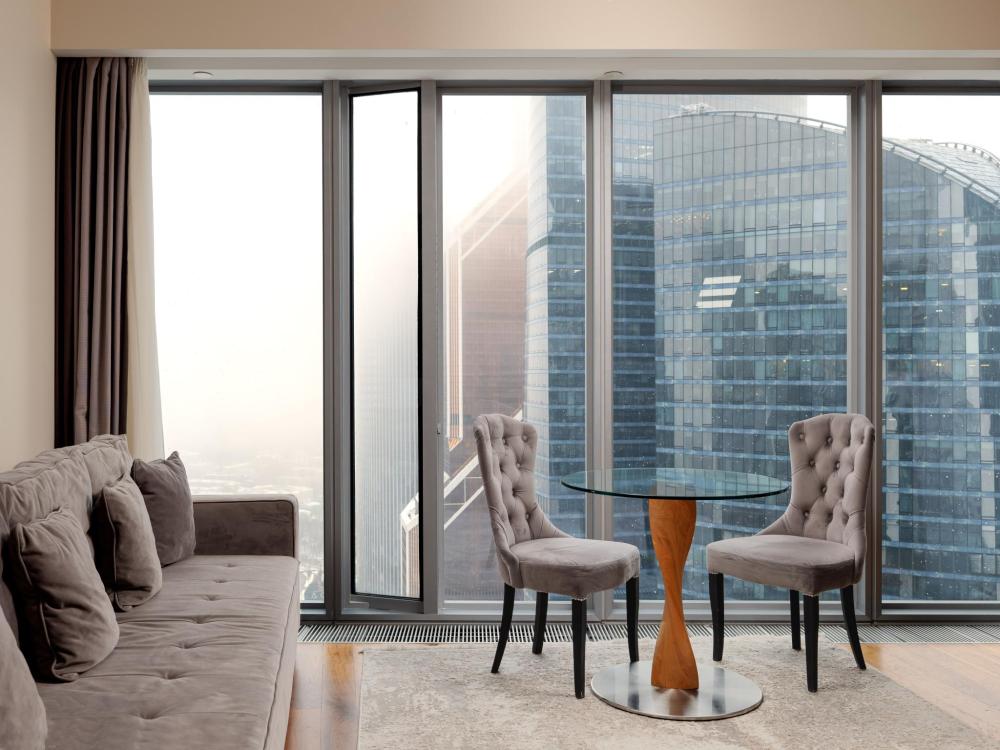 В башне ОКО на 42 этаже расположен прекрасный двухкомнатный апартамент с замечательным видом на город и реку. В апартаментах находится всё необходимое для комфортного проживания: кухня со встроенной бытовой техникой, два санузла, полноценная ванная комната, включающая в себя ванную, душевую кабину, туалет, раковину и все необходимые туалетные принадлежности. На 85 этаже расположен знаменитый ресторан Русский, который не оставит вас равнодушным своим шикарным видом на город. Система Климат-контроля, бесплатный Wi-Fi. В квартире имеется всё необходимое для проживания.