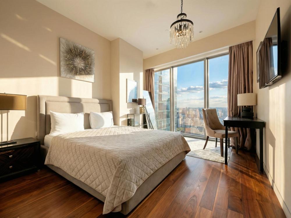 В башне ОКО на 48 этаже расположен прекрасный двухкомнатный апартамент с замечательным видом на город и реку. В апартаментах находится всё необходимое для комфортного проживания: кухня со встроенной бытовой техникой, два санузла, полноценная ванная комната, включающая в себя ванную, душевую кабину, туалет, раковину и все необходимые туалетные принадлежности. На 85 этаже расположен знаменитый ресторан Русский, который не оставит вас равнодушным своим шикарным видом на город. Система Климат-контроля, бесплатный Wi-Fi. В квартире имеется всё необходимое для проживания.
