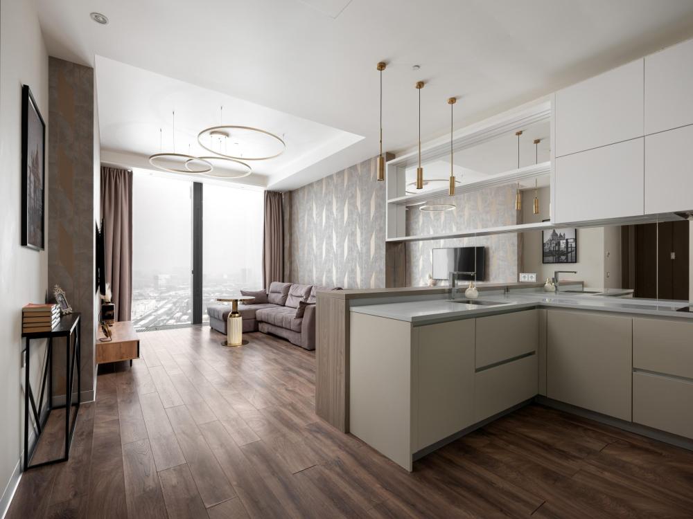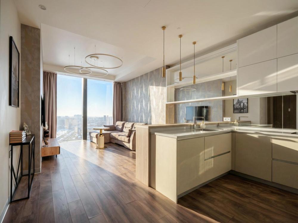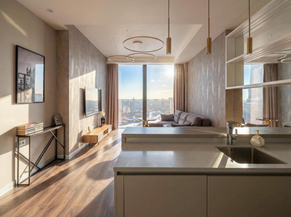 Уютная студия апартамент в башне "Нева" City 51 кв.м. на 43 этаже с дизайнерским ремонтом и видом на городскую панораму. Вид на Москву Сити! Одна из самых новых башен.