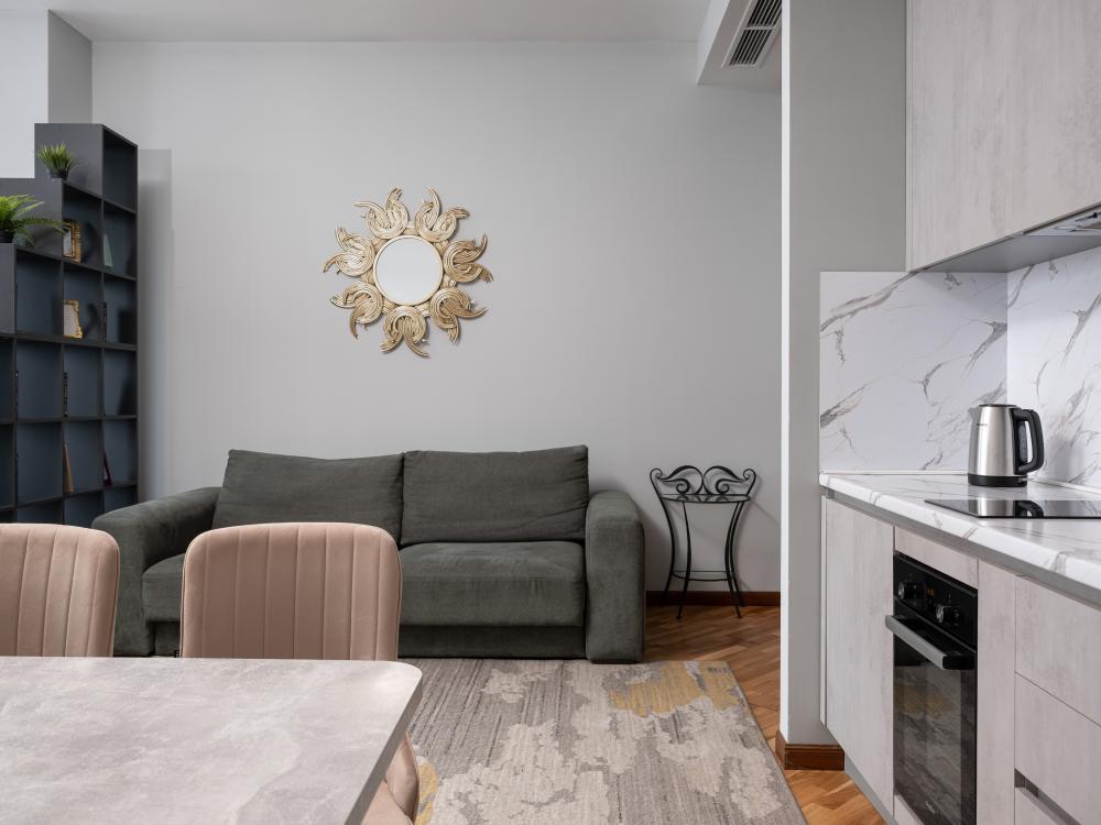 Уютный двухкомнатный апартамент в башне "Нева" Navi 50 кв.м. на 36 этаже с дизайнерским ремонтом и видом на город. Уютный раскладной диван и стильная кухня. Одна из самых новых башен Москвы Сити.