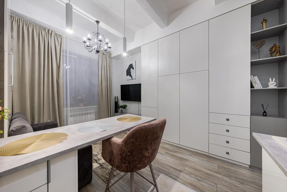 Стильная лофт-студия в клубном бизнес-классе Loftec — современном арт-пространстве, где кипит жизнь. Современный дом бизнес-класса в Басманном районе рядом с садом имени Баумана, в 7 минутах ходьбы до станции метро Бауманская, 9 минут до станции метро Красносельская. На первом этаже уютные кафе, рестораны, салоны красоты. Студия в стиле хай-тек с высокими потолками 3,5 метра создают ощущение свободы и воздуха. Качественная отделка, новая техника, окна в тихий двор обеспечивают уют. Продуманная планировка с умной диваном-кроватью трансформером с удобным ортопедическим матрасом позволит комфортно отдохнуть и экономит место. Небольшая кухонная зона оснащена всей необходимой техникой (холодильник, микроволновая печь, индукционная плита), оснащена всеми кухонными принадлежностями для комфортного пребывания. Чашка утреннего свежесваренного кофе из электрической турки поднимет Вам настроение. Большой функциональный шкаф позволит удобно расположить вещи. Для ухода за ними стиральная машина, утюг, гладильная доска. Ванная комната с большой ванной, феном, средствами для ухода позволит снять усталость дня.