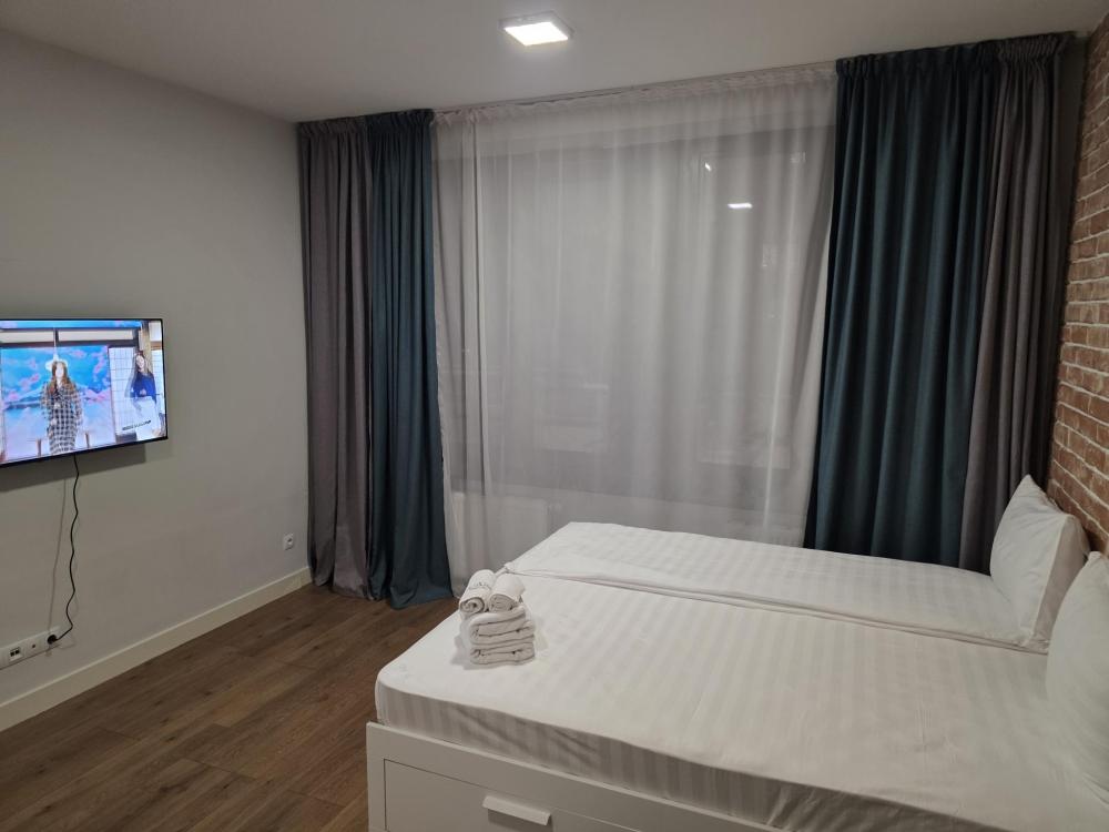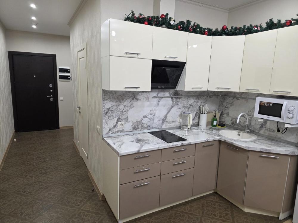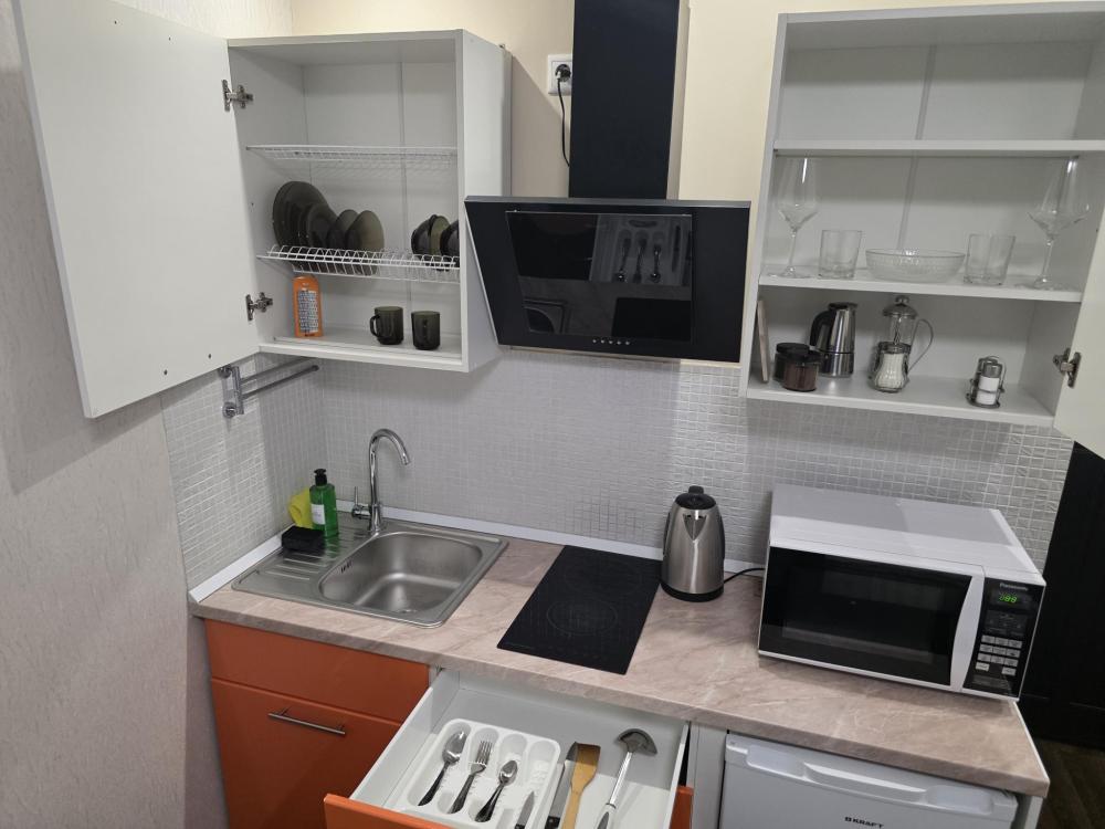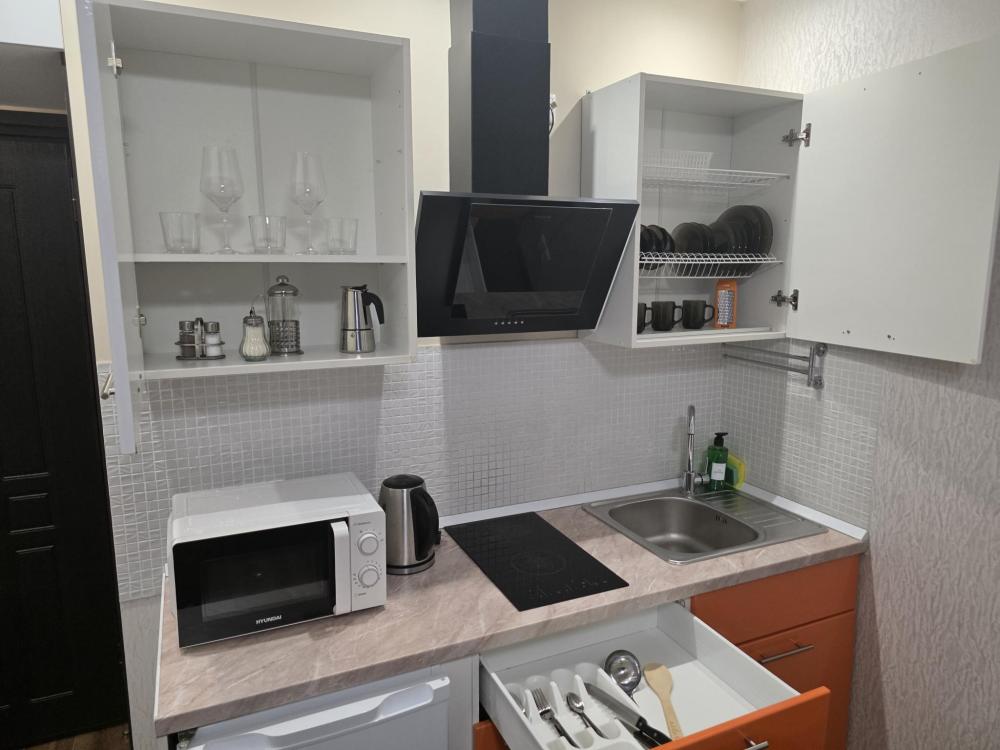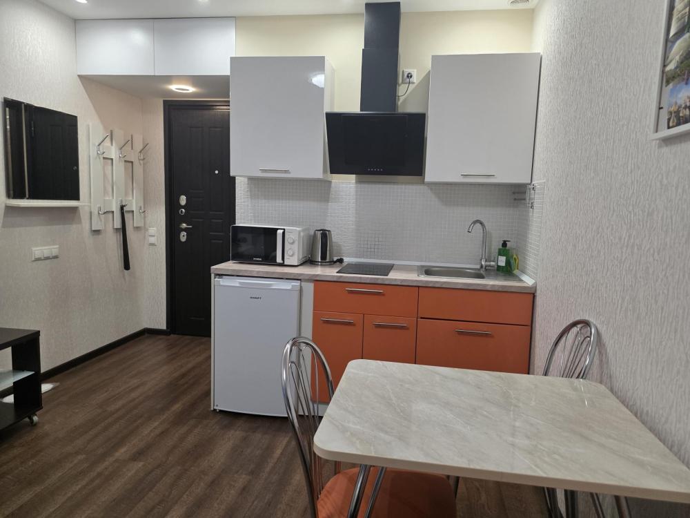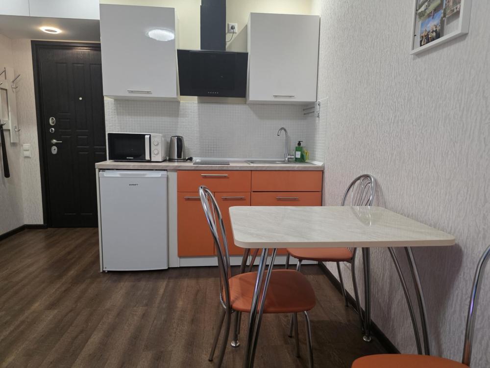 Апартамент Комфорт на 4 этаже . Студия оборудована всем необходимым, станет приятным местом отдыха как на одну ночь, так и на более длительный срок. Кровать размером 160/200 с ортопедическим матрасом средней жесткости. На кухне есть все для приготовления блюд и закусок. Ванная комната с ванной подарит минуты отдыха после долгого дня. В зоне прихожей находиться просторный шкаф и комод, что позволит комфортно разместить вещи при длительном проживании. Апартамент отлично подойдет для проживание двух людей и семей с детьми.