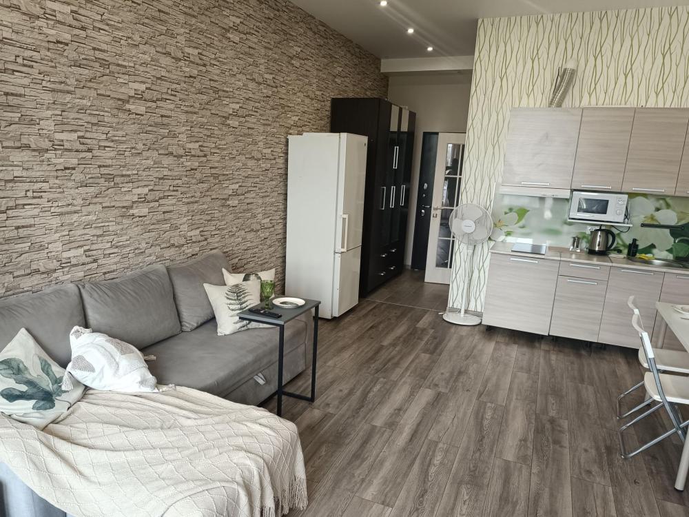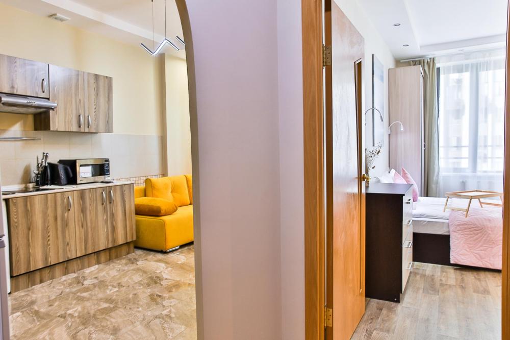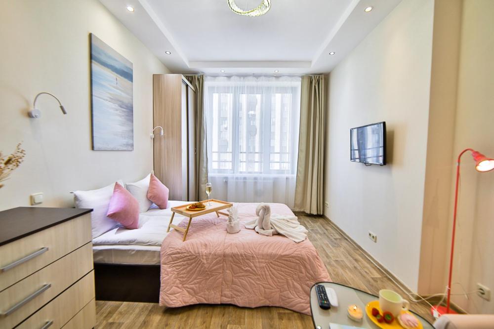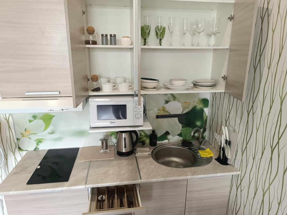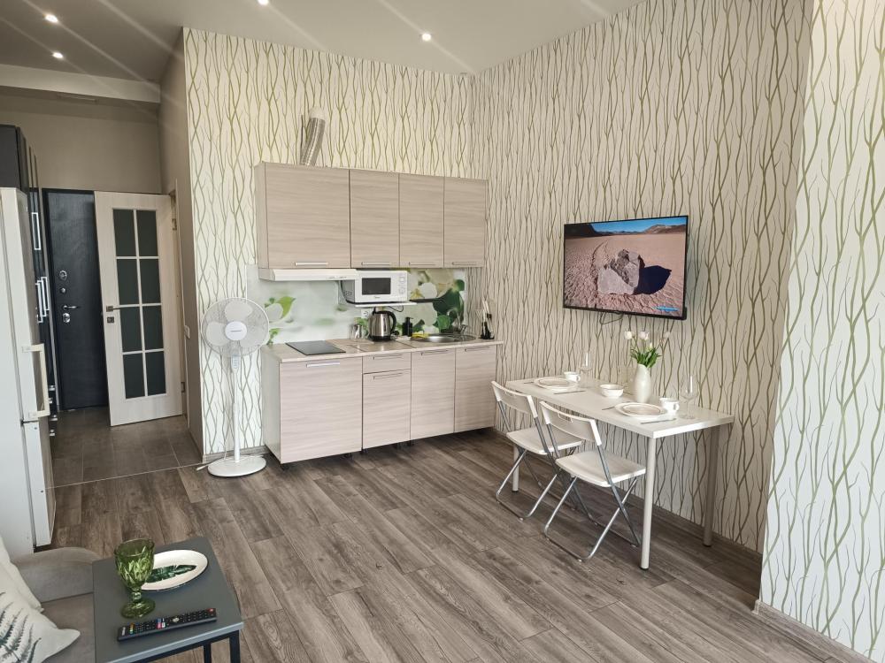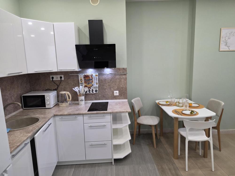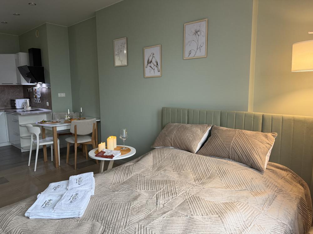 Апартаменты выдержаны в светлых лавандовых тонах. Студия оборудована мини-кухней с электроплитой и холодильником, обеденной зоной и телевизор с плоским экраном. В распоряжении гостей полностью оборудованная собственная ванная комната с душем, феном и стиральной машиной. Студия располагает одной двухспальной кроватью с ортопедическим матрасом. В проживание включены одноразовые гигиенические средства, кофе,чай, полотенца и бесплатный Wi-Fi. жизни по максимуму. Кухня оборудована мини-холодильником, электроплитой и микроволновой печью. В апартаменте есть стиральная машина, фен и одноразовые принадлежности.