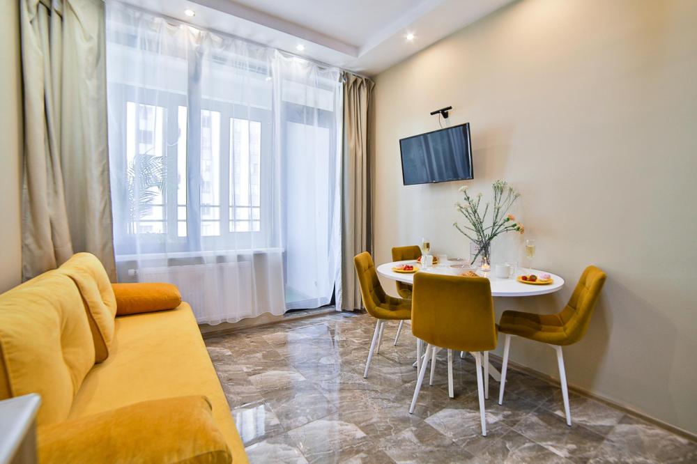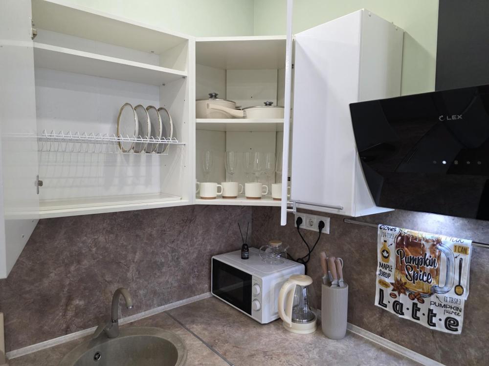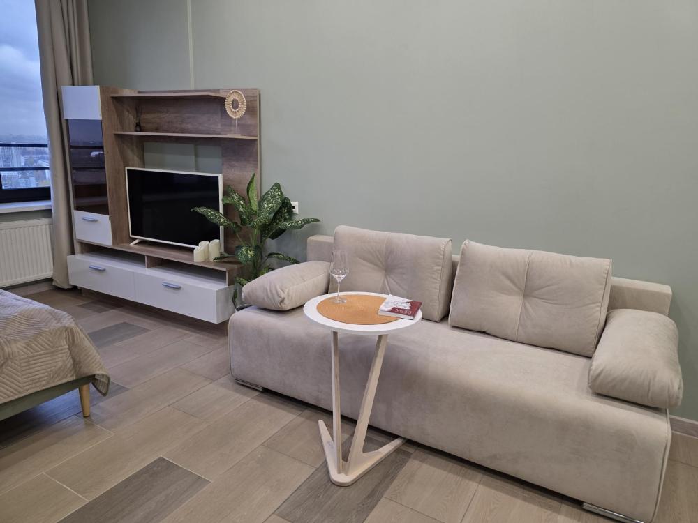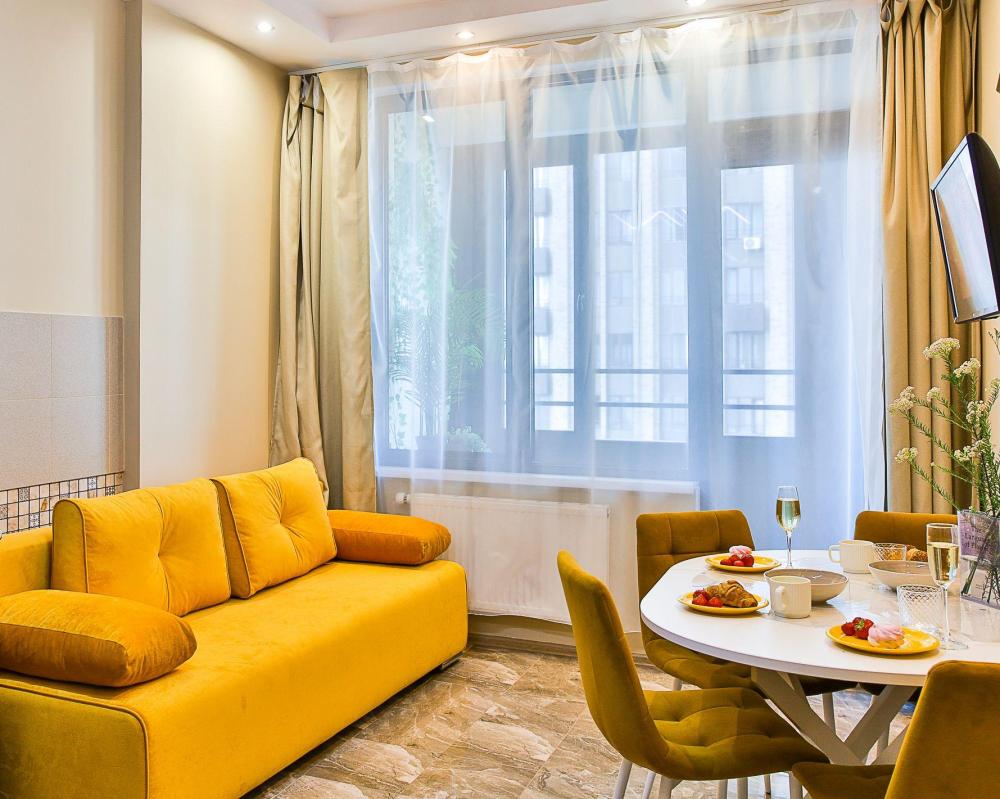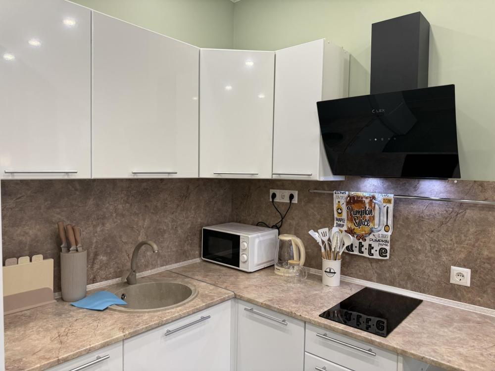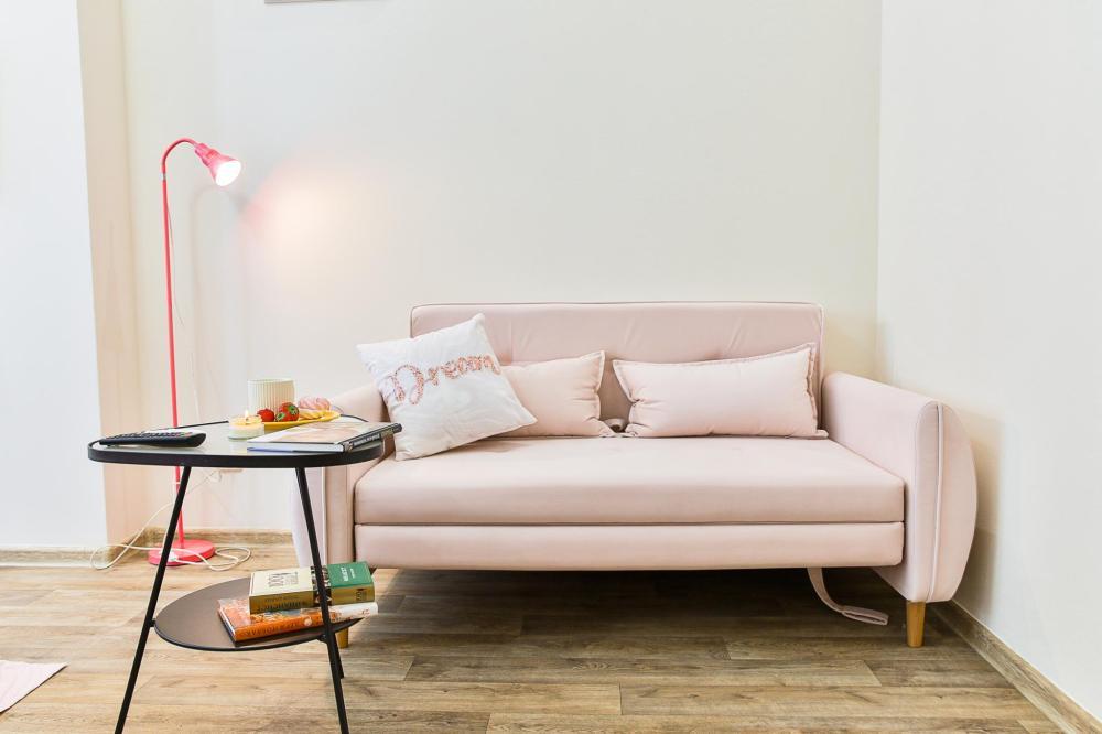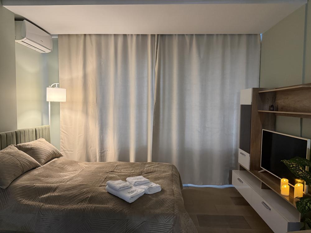 Апартаменты выдержаны в светлых лавандовых тонах. Студия оборудована мини-кухней с электроплитой и холодильником, обеденной зоной и телевизор с плоским экраном. В распоряжении гостей полностью оборудованная собственная ванная комната с душем, феном и стиральной машиной. Студия располагает одной двухспальной кроватью с ортопедическим матрасом. В проживание включены одноразовые гигиенические средства, кофе,чай, полотенца и бесплатный Wi-Fi. жизни по максимуму. Кухня оборудована мини-холодильником, электроплитой и микроволновой печью. В апартаменте есть стиральная машина, фен и одноразовые принадлежности.