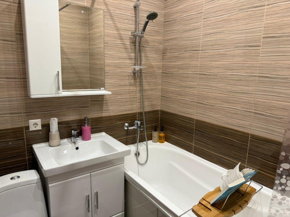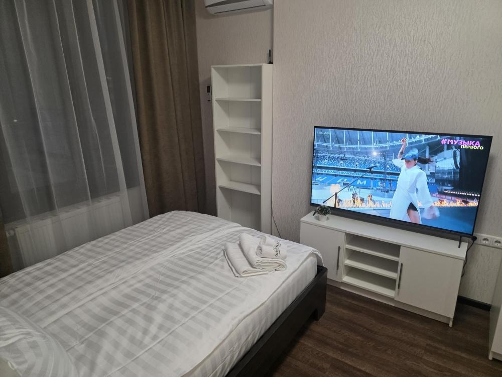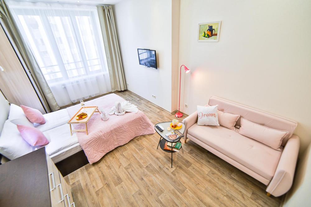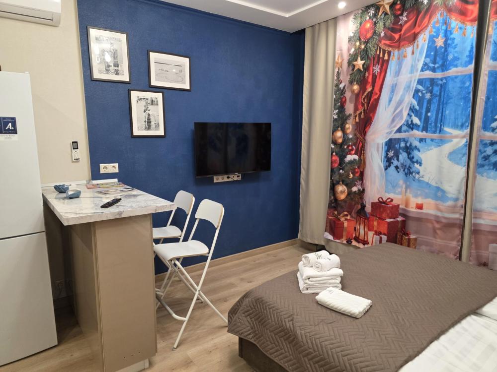 Дизайнерский апартамент на 4 этаже с яркими акцентами. Студия оборудована всем необходимым, станет приятным местом отдыха как на одну ночь, так и на более длительный срок. Кровать размером 160/200 с ортопедическим матрасом средней жесткости. Прекрасный и удобный диван, раскладывается на два спальных места. На кухне есть все для приготовления блюд и закусок. Особенностью апартамента является балкон с барной стойкой . Ванная комната с ванной подарит минуты отдыха после долгого дня. В зоне прихожей находиться просторный шкаф и обувница, что позволит комфортно разместить вещи при длительном проживании. Апартамент отлично подойдет для проживание двух людей и семей с детьми.