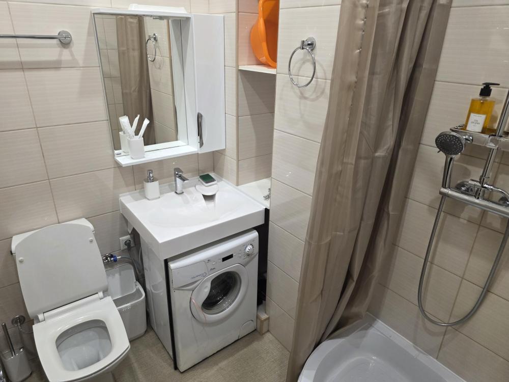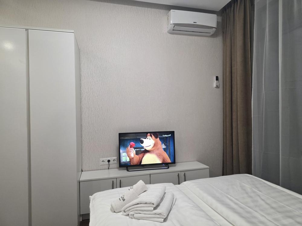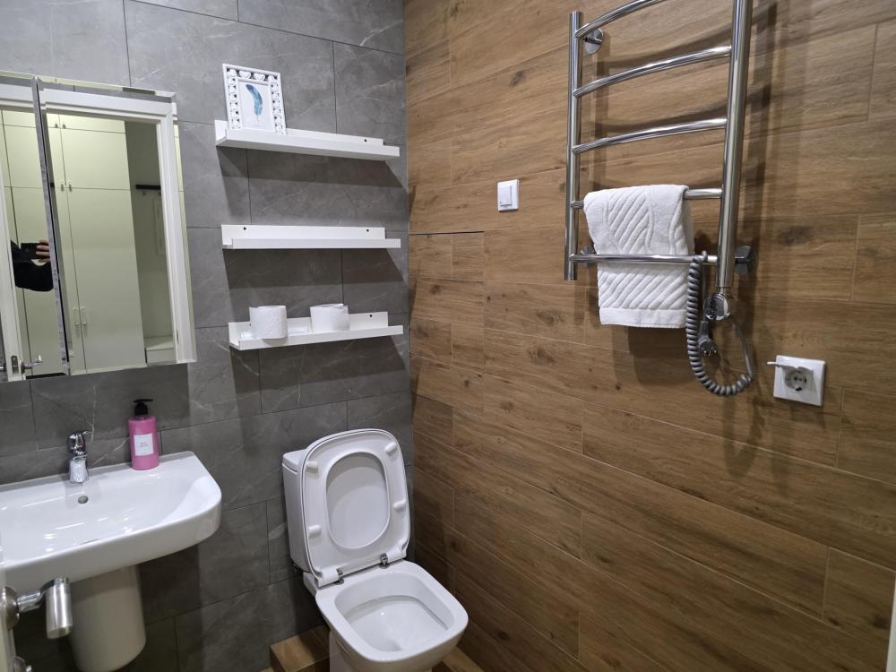 Просторные двухкомнатные апартаменты на 13 этаже с видом на город. Современный дизайн придется по вкусу любому человеку. В спальной расположена удобная кровать шириной 160см с ортопедическим матрасом. В гостиной стильный яркий диван и зеркало в виде медвежонка будут залогом отличной фотографии на память о проведенном времени у нас. Кухонная зона с барной стойкой оборудована необходимым для приготовления пищи и даже кофемашиной. Ванная с панорамным окном на город станет приятной изюминкой апартамента.