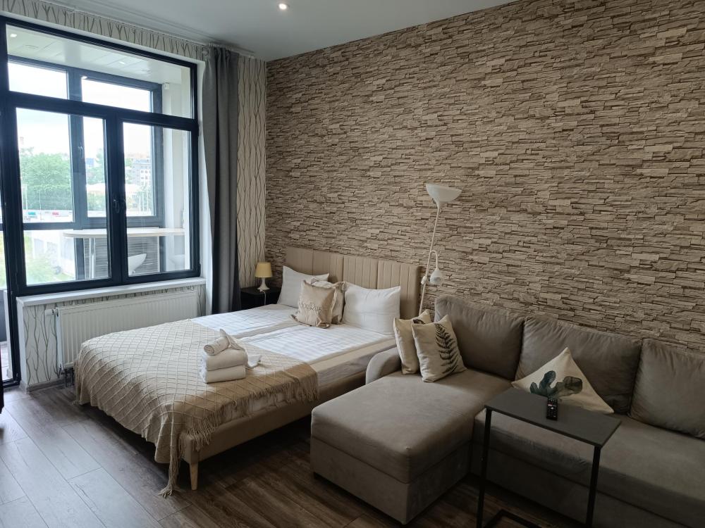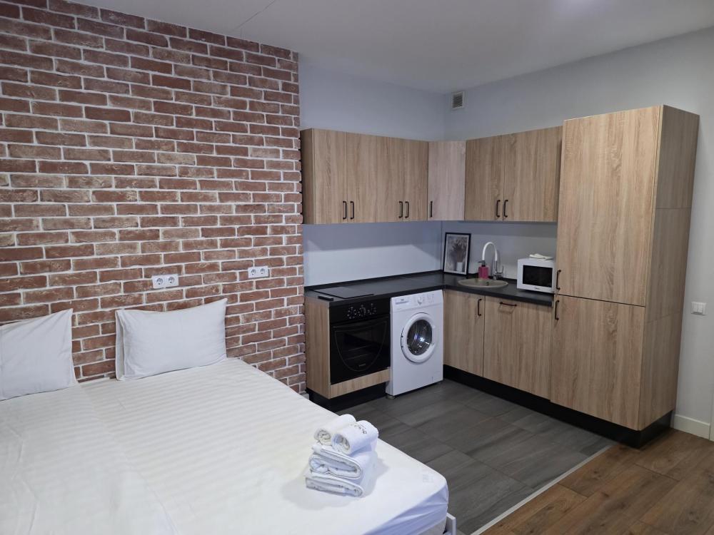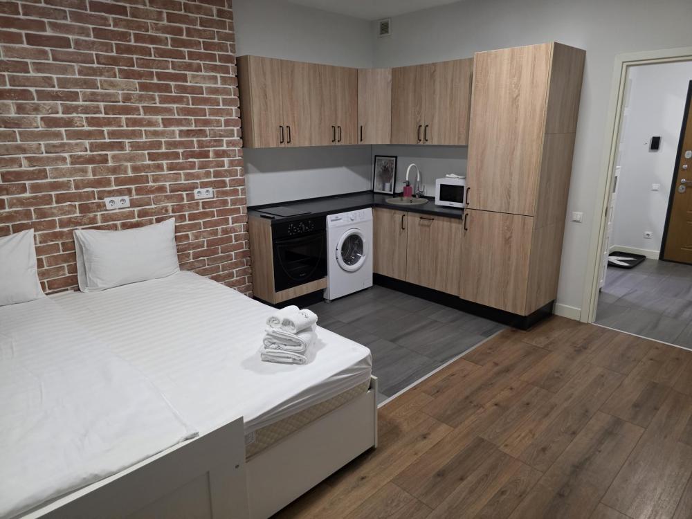Апартаменты выполнены в скандинавском стиле. В оформлении использованы натуральные материалы. В студии запоминающими акцентами являются двухспальная кровать-подиум и окно в ванную комнату. Открытая и удобная кухня полностью оборудована для приготовления пищи. Кухня укомплектована мини-холодильником и микроволновой печью. В апартаменте есть стиральная машина, фен и одноразовые принадлежности.