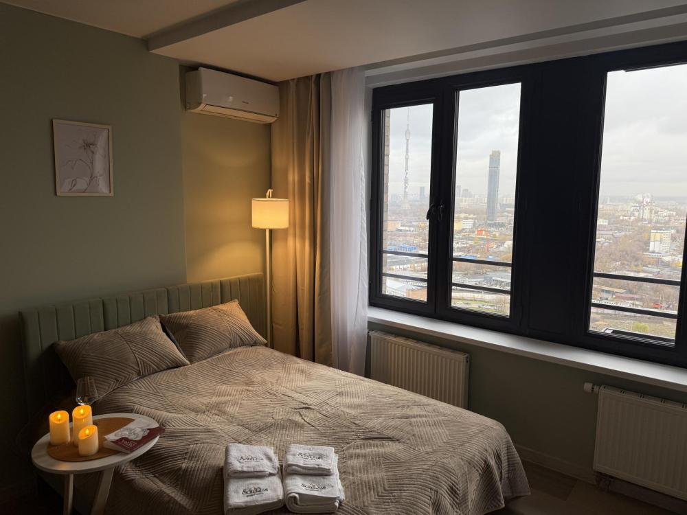 Дизайнерская апартамент на 36-м этаже небоскреба ЖК “Савеловский Сити” с панорамным видом на Москву. Ванна у окна с зеркальными откосами позволит Вам насладиться видом города и романтическим настроением. Можно отлично провести романтический вечер, утро невесты или брачную ночь. Или просто получить удовольствие от ванны, красивого вида и хорошего вина. Био камин с настоящим пламенем создаст неповторимую атмосферу тепла и уюта. Апартамент оборудован кондиционером, 42” телевизора со 100 цифровыми каналами и активной подпиской ivi, кофе машиной, электроплитой, микроволновкой и всем необходимы для проживания. Комфорт обеспечивает широкая двуспальная кровать шириной 160см с ортопедическим матрасом. Зеркальная стена рядом с кроватью добавит впечатления парам.