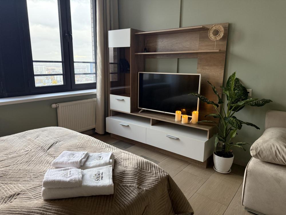 Апартамент на 27-м этаже ЖК Савеловский Сити. Панорамный вид из окна на ВДНХ и восток Москвы доставит массу удовольствия нашим Гостям. Студия оборудована всем необходимым и обеспечит комфорт пребывания как на одну ночь, так и на несколько недель. Кровать размером 160/200 с ортопедическим матрасом средней жесткости. Удобный диван, раскладывается на два спальных места. На кухне есть все для приготовления блюд и закусок. Ванная комната с ванной подарит минуты отдыха после долгого дня. В зоне прихожей находиться просторный шкаф купе, что позволит комфортно разместить вещи при длительном проживании. Апартамент отлично подойдет для проживание двух людей и семей с детьми.