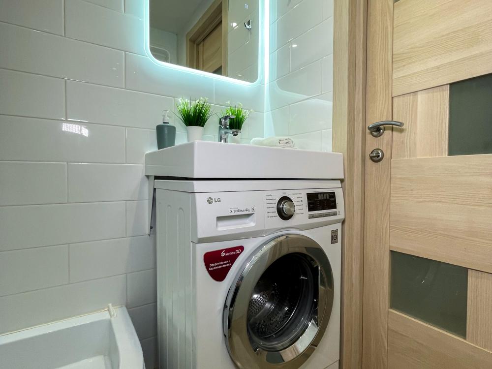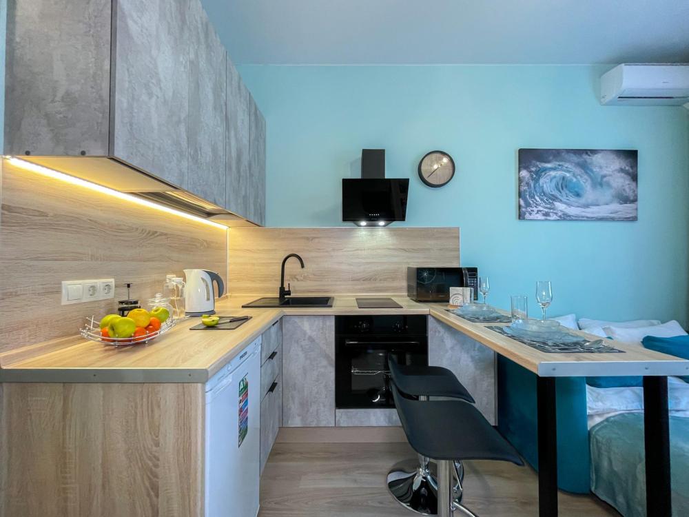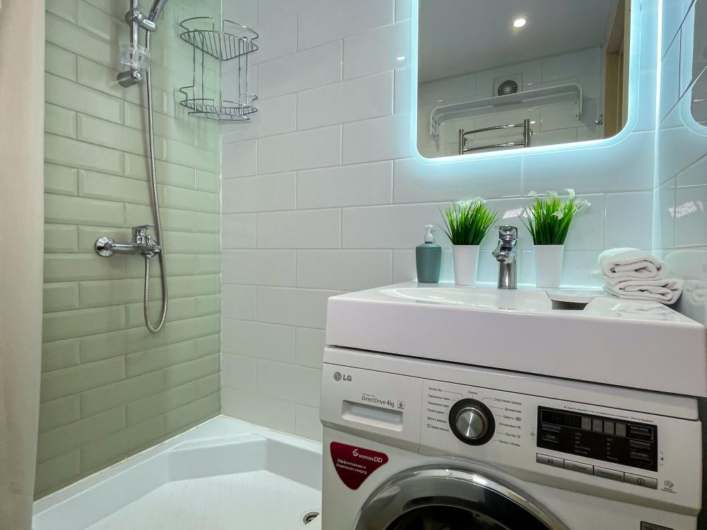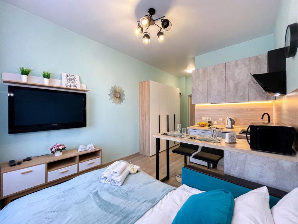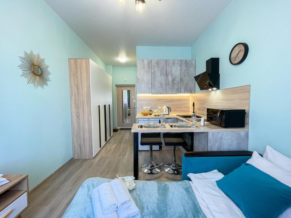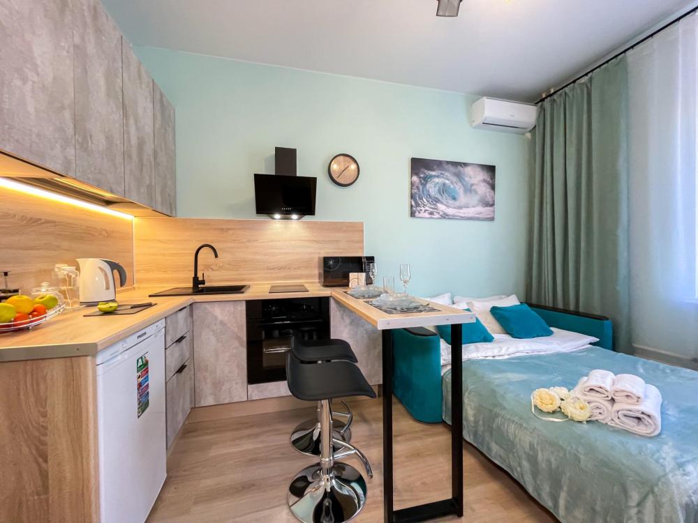 Апартаменты-студия подойдут для проживания 2-х человек. Спальные места: двуспальная кровать с ортопедическим матрасом. Для комфортного проживания доступны: стиральная машина, фен, телевизор (подключено приложение KION), высокоскоростной Wi-Fi, утюг, кондиционер. В кухонной зоне: холодильник, СВЧ-печь, чайник, электрическая плита, духовой шкаф, посуда и столовые приборы. Постельное белье, полотенца, гигиенические принадлежности: гель для душа, шампунь, мыло и одноразовые тапочки предоставляются.