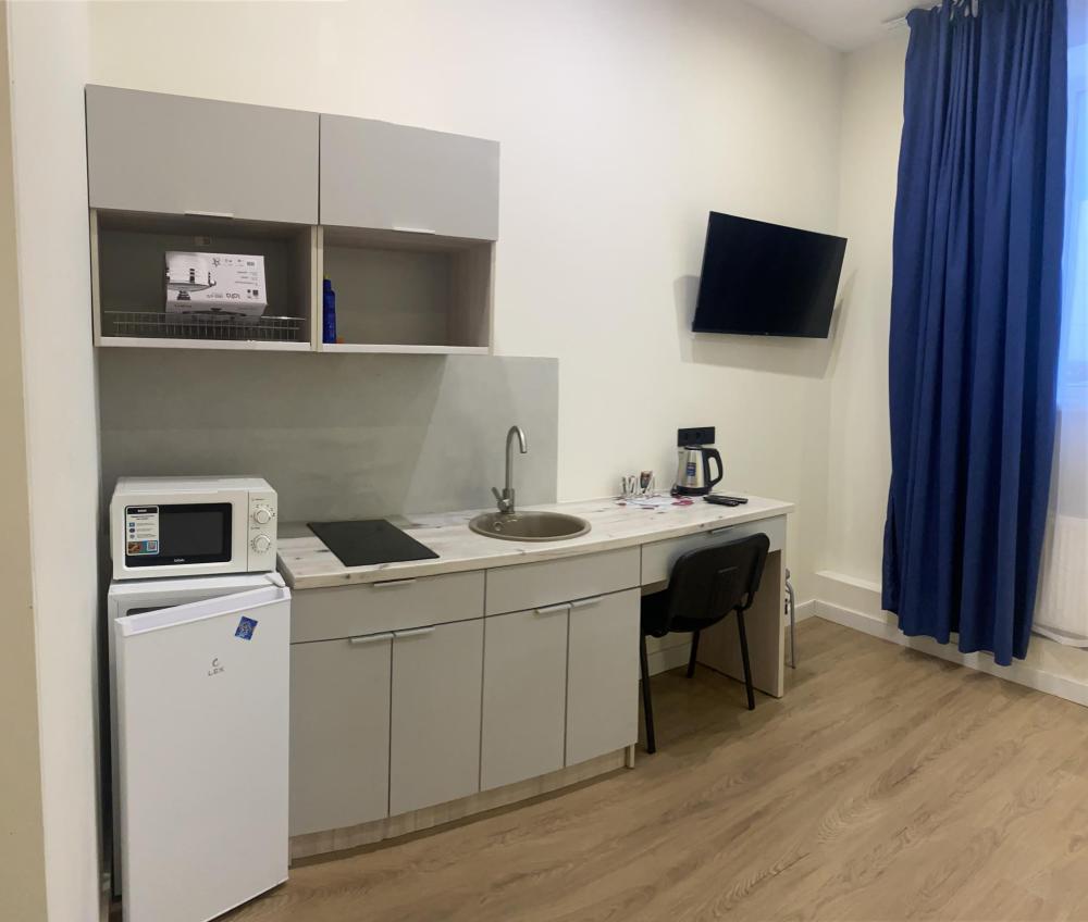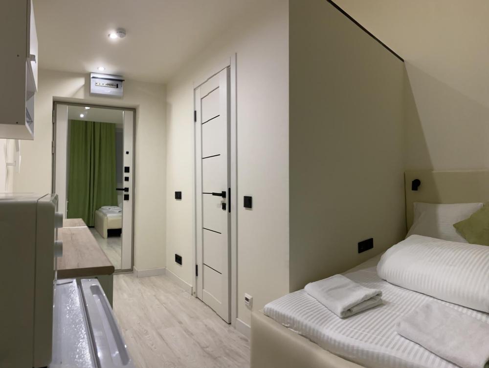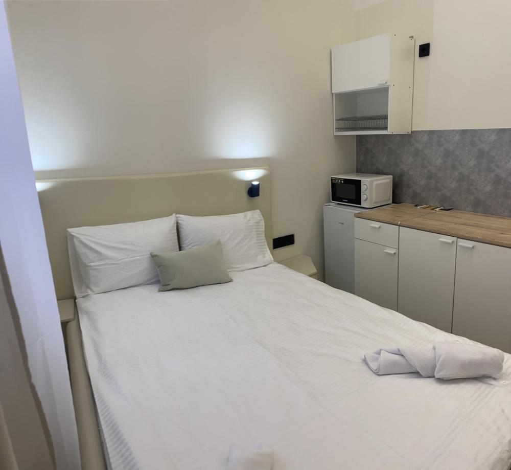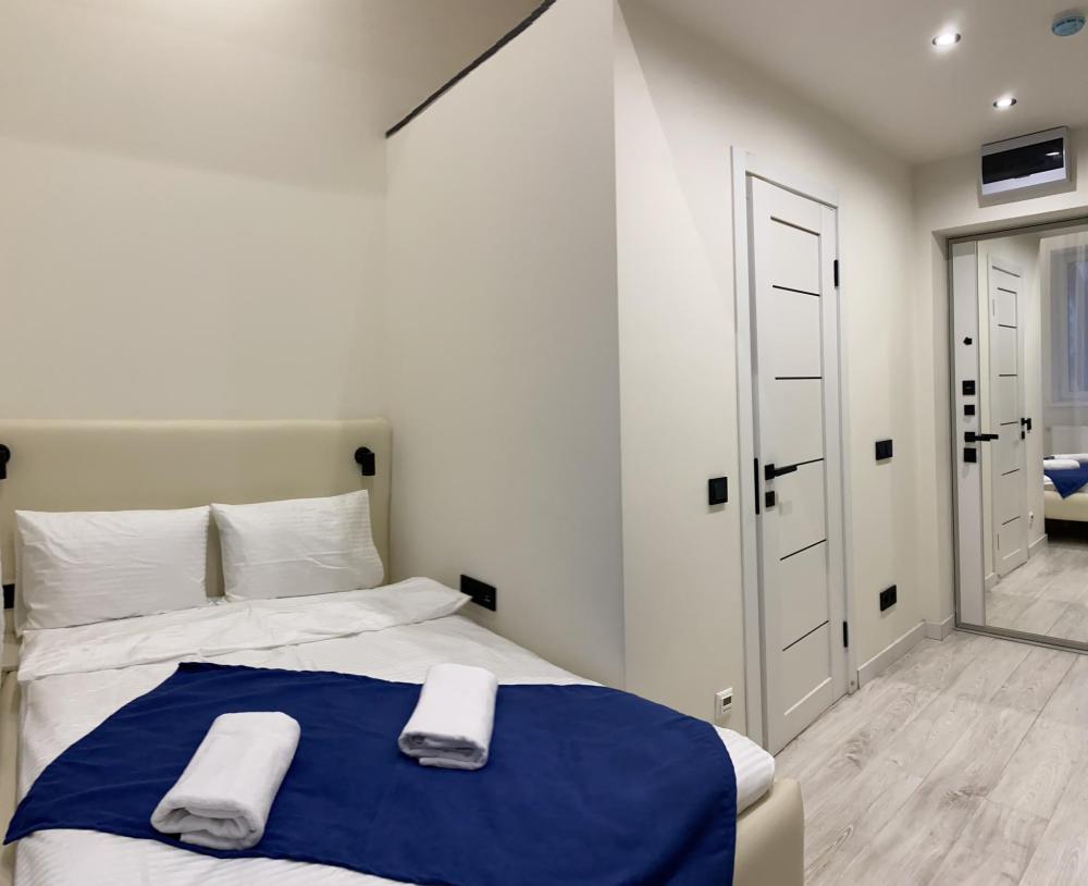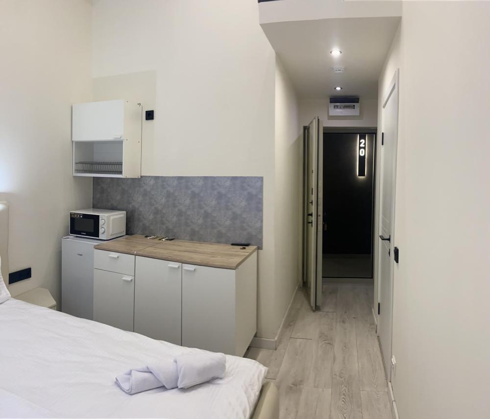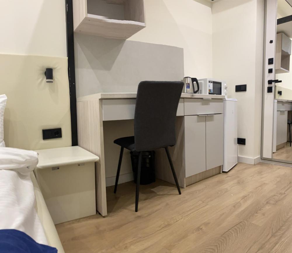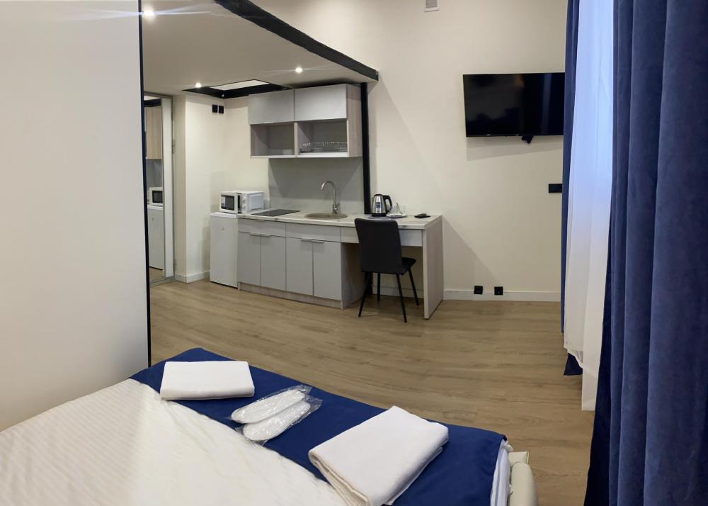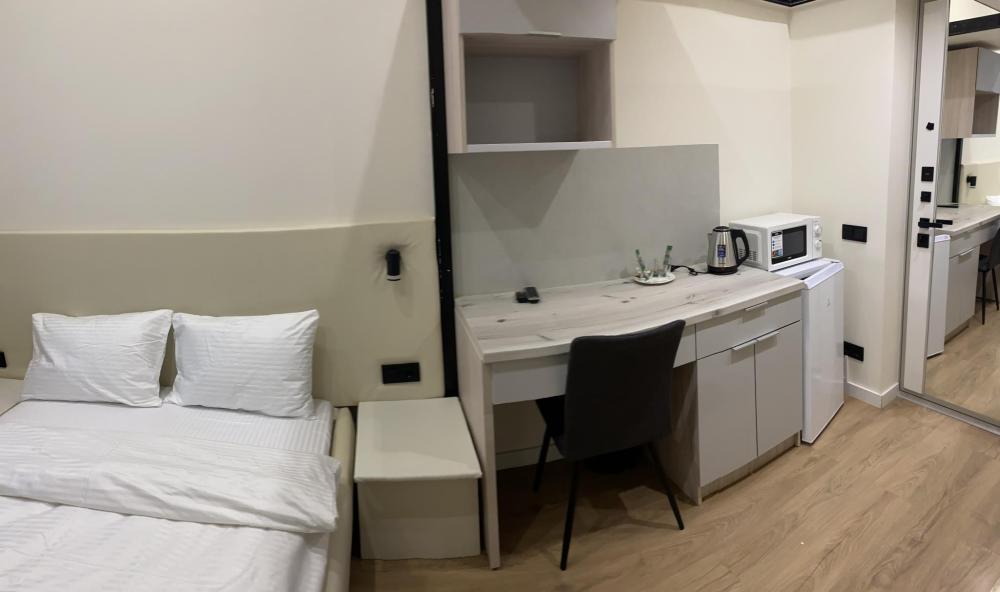 Уютная студия для проживания 1-2 человек. Есть фен, холодильник, чайник, микроволновка, варочная панель. Удобные матрасы, новое постельное белье из натуральных тканей. Полотенца, мыло, шампунь, тапочки входят в стоимость. Нет залога и депозита. Заехать можно в любое время, стойка регистрации работает круглосуточно.