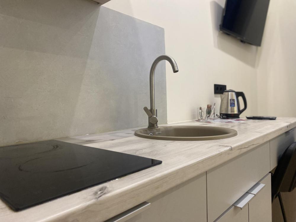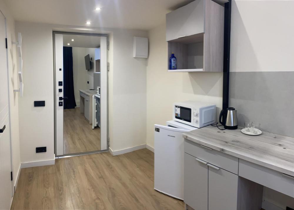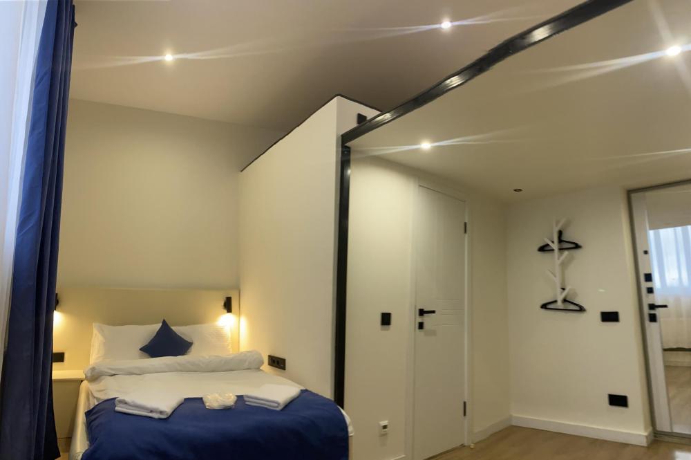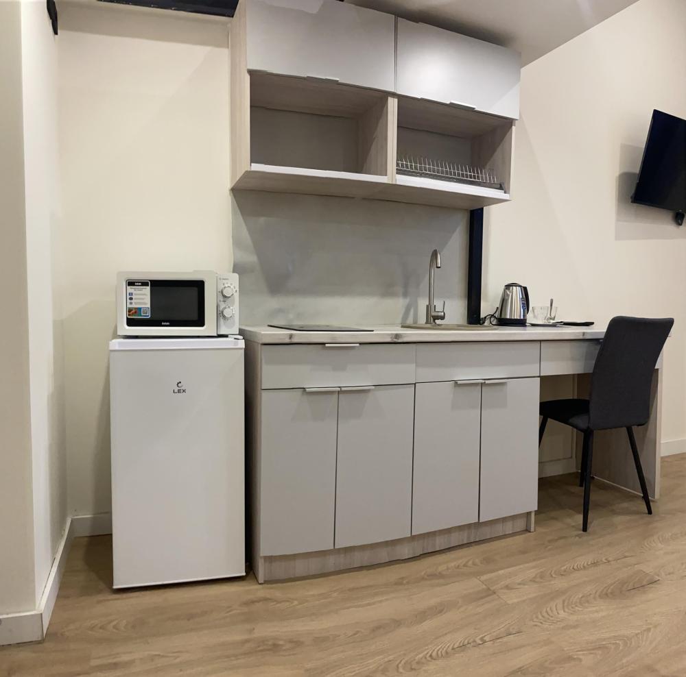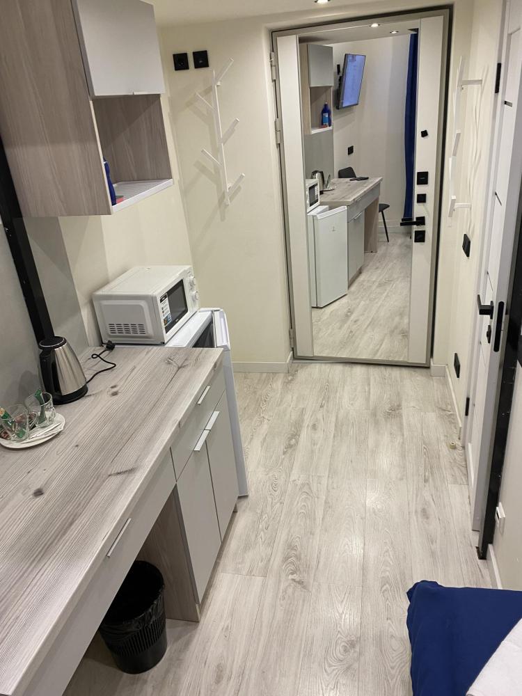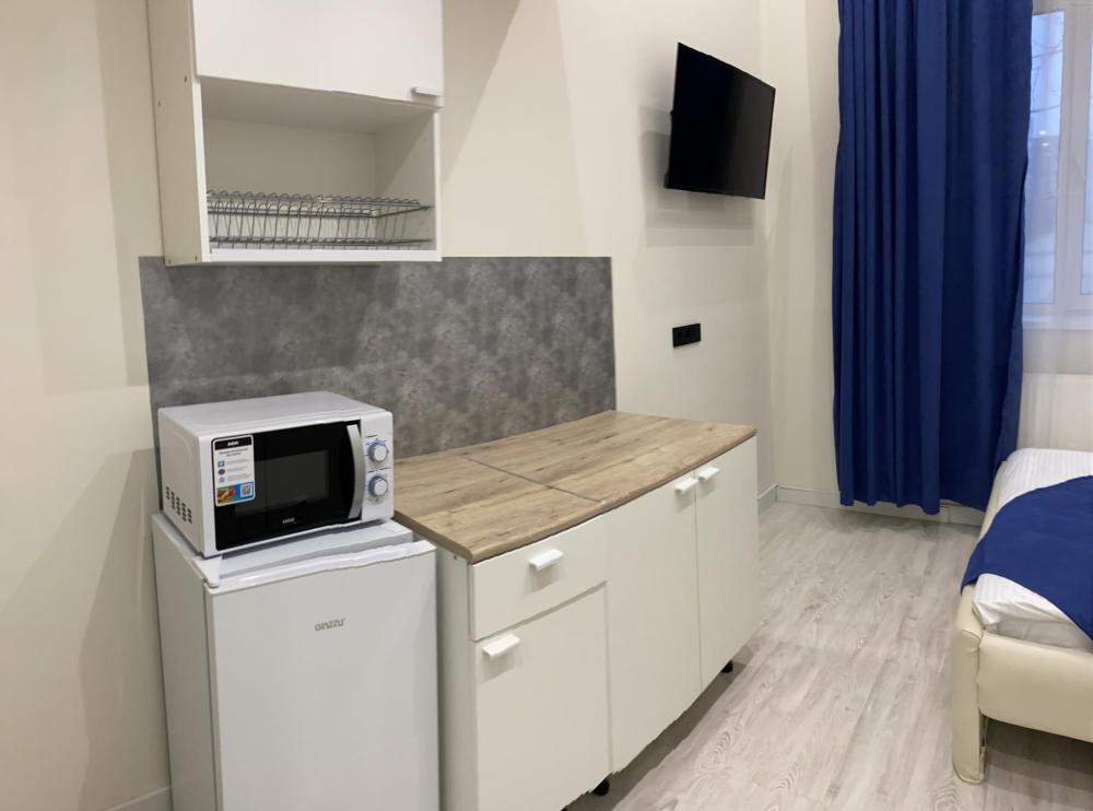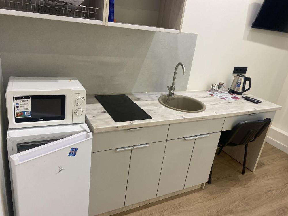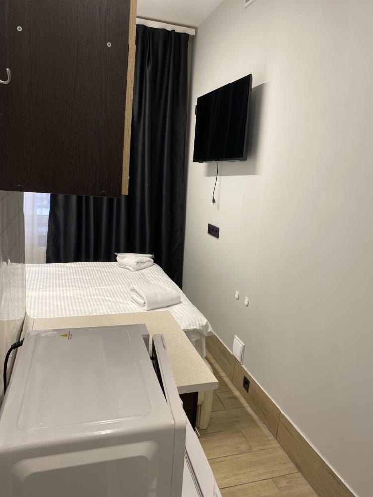 Уютная студия для проживания 1-2 человек. Есть фен, холодильник, чайник, микроволновка, варочная панель. Удобные матрасы, новое постельное белье из натуральных тканей. Полотенца, мыло, шампунь, тапочки входят в стоимость. Нет залога и депозита. Заехать можно в любое время, стойка регистрации работает круглосуточно.