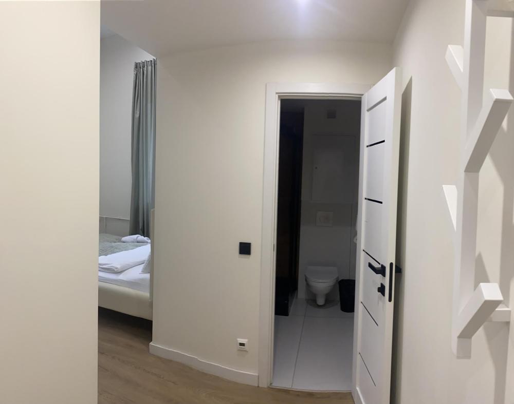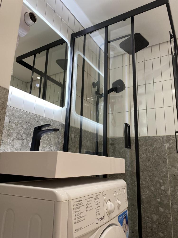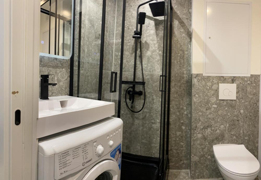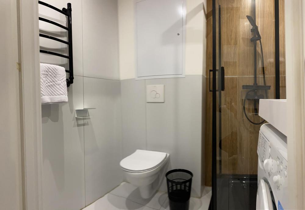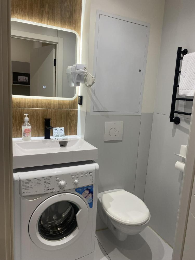 Небольшая студия для двоих с одной двуспальной кроватью. Есть душ, туалет, стиральная машинка, холодильник, микроволновка, чайник.