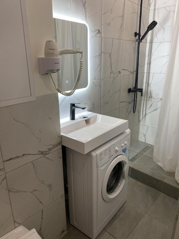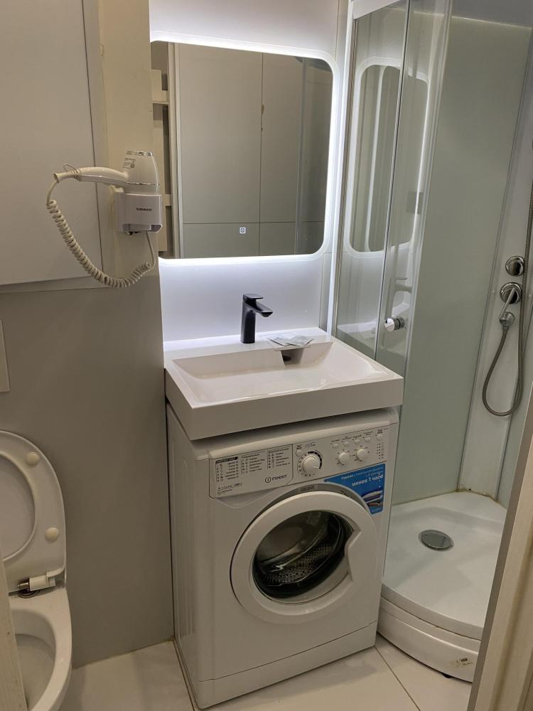 Небольшая студия с одной двуспальной кроватью. Есть все для комфортного проживания: холодильник, стиральная машина, микроволновка, чайник, посуда, постельное белье, полотенца, тапочки, фен.
