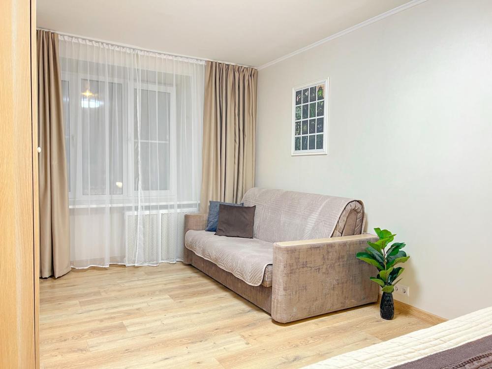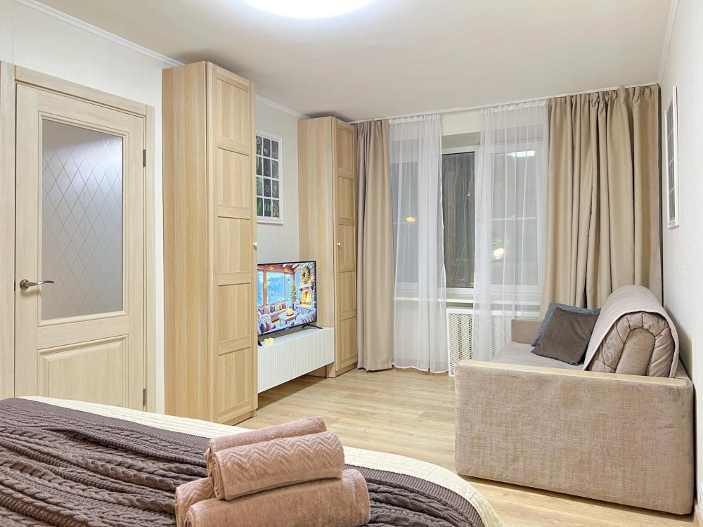 Квартира обставлена хорошей мебелью. Здесь вас ждут удобная большая кровать и комфортный раздвижной диван.
