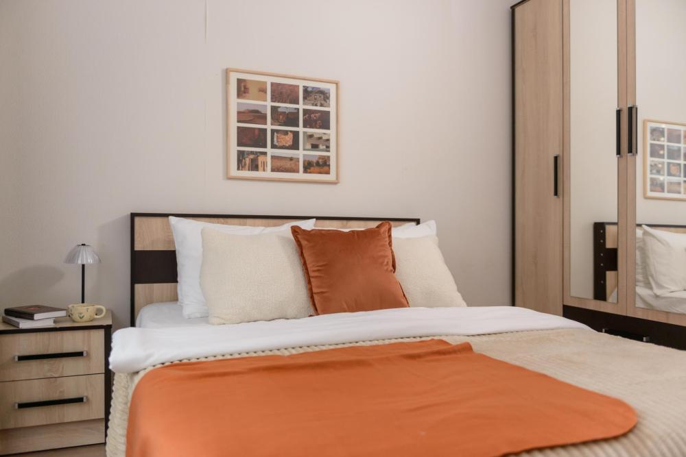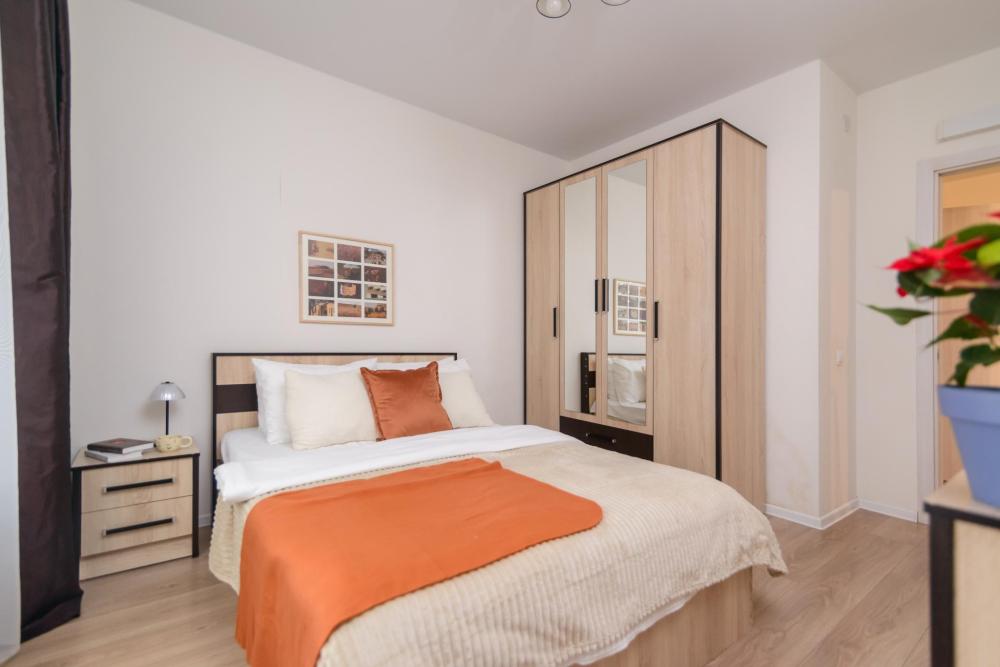 Уютная двухкомнатная квартира с раздельными спальнями. Квартира вмещает в себя до 4 человек, в двух спальнях стоят двуспальные кровати с ортопедическим матрасом и шкафы. В одной из спален телевизор со Smart TV. На кухне есть кухонный стол, холодильник, плита, чайник. Также для гостей предоставляется бесплатный WiFi, гладильная доска, утюг, фен и сушилка для белья. Для каждого гостя свежее полотенце, гель для душа, шампунь. ЖИВОТНЫЕ: проживание с домашними животными допускается по согласованию, взымается повышенный залог