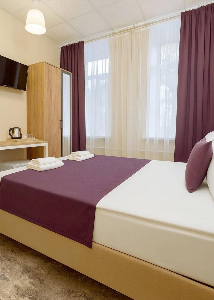 Отдельный номер площадью от 11,2 м2 до 16,3 м2. В номере: двуспальная кровать 140*200 или 160*200, раскладной мини-диван, стол, стулья, шкаф с вешалками для одежды, телевизор, холодильник, чайник, чайный набор. Санузел с душем, фен, туалетные принадлежности (шампунь и гель для душа, туалетная бумага, освежитель воздуха)