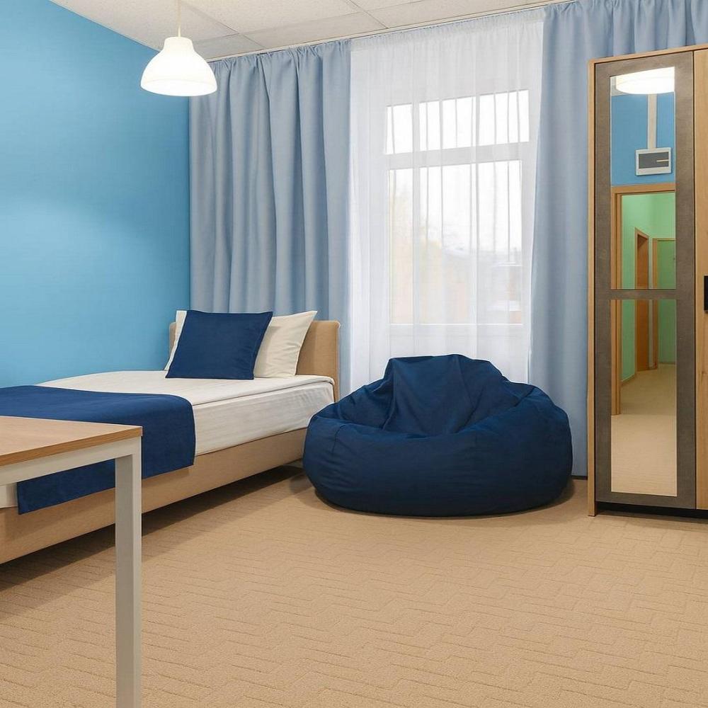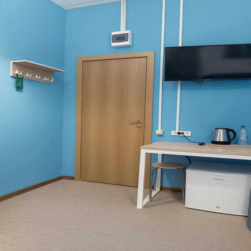 Отдельный номер площадью от 5,5 м2 до 9,7 м2. В номере: односпальная кровать 80*200, стол, стул, вешалки для одежды, телевизор, чайник, чайный набор. Санузел с душем, фен, туалетные принадлежности (шампунь и гель для душа, туалетная бумага, освежитель воздуха)