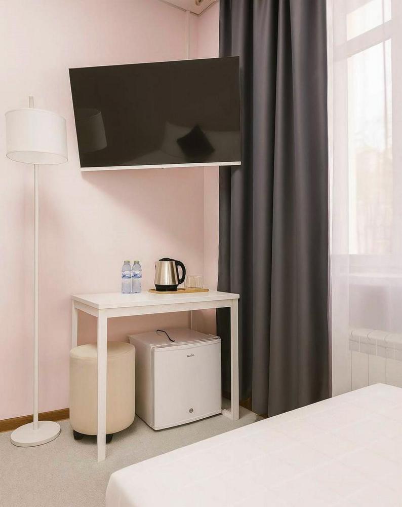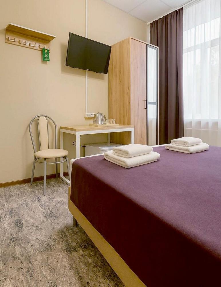 Отдельный номер с ремонтом площадью 12,4 м2. В номере: вешалка для верхней одежды, шкаф для одежды, двуспальная кровать 160*200 с ортопедическим матрасом, письменный стол, рабочий стул, телевизор от 43 дюймов, холодильник, чайник, чайный набор, питьевая вода 0,5 л., салфетки. Санузел с душем, фен, туалетные принадлежности (шампунь и гель для душа, зубной набор, туалетная бумага, освежитель воздуха). Махровые халаты и тапочки для двух гостей