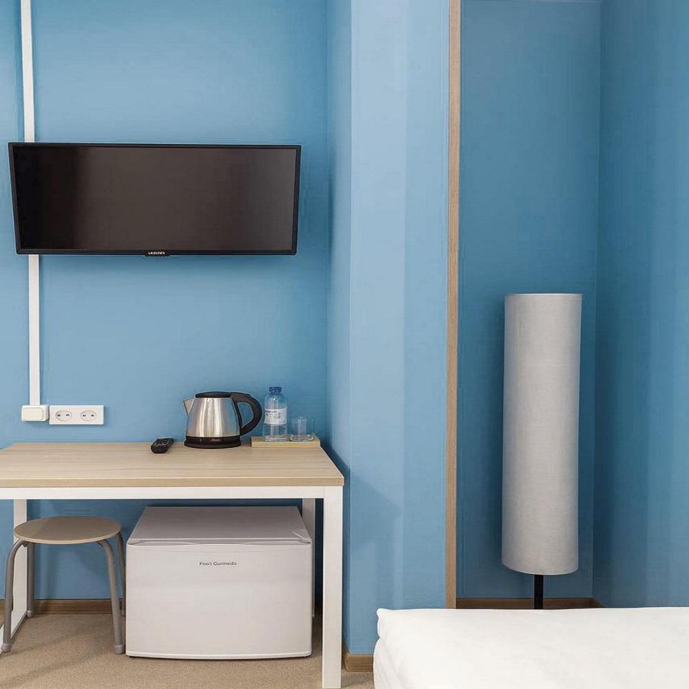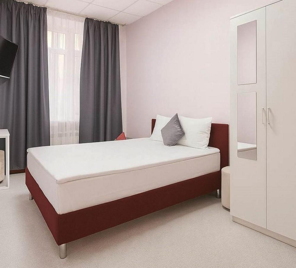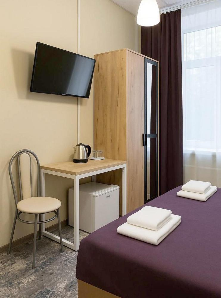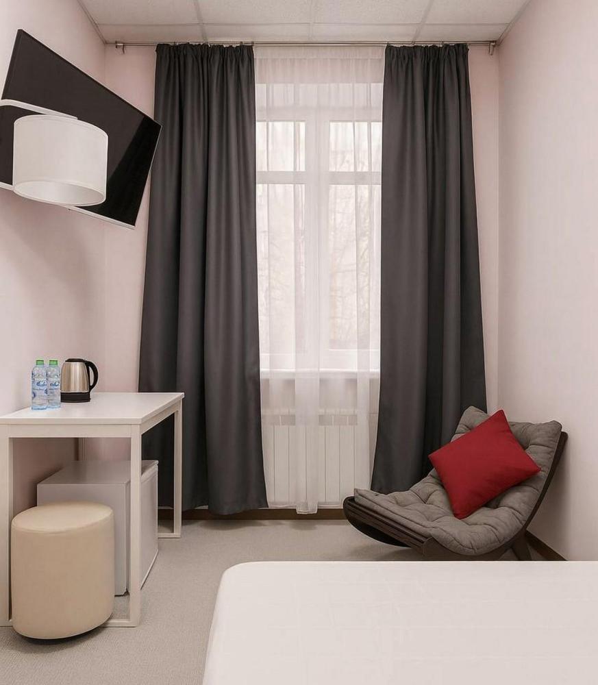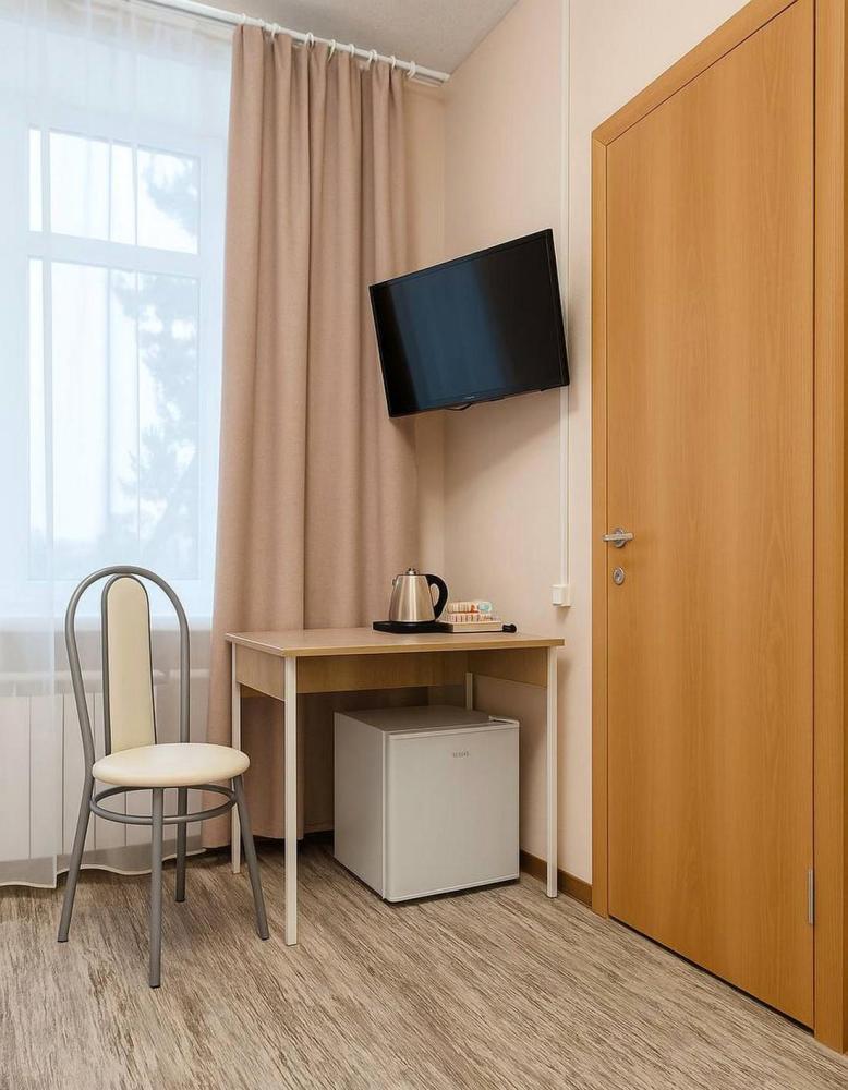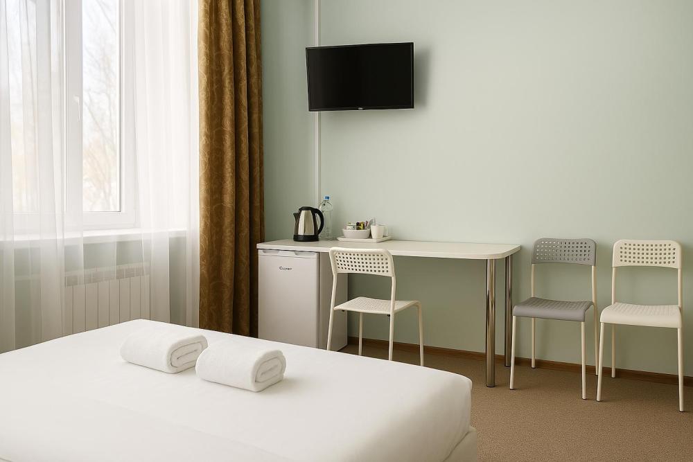 Отдельный номер с ремонтом площадью 7,4 м2 до 10,5 м2. В номере: вешалка для верхней одежды, шкаф с вешалками для одежды, односпальная кровать 90*200 с ортопедическим матрасом, стол, мягкий стул, телевизор от 32 дюймов, холодильник, чайник, чайный набор, питьевая вода 0,5 л., салфетки. Санузел с душем, фен, туалетные принадлежности (шампунь и гель для душа, зубной набор, туалетная бумага, освежитель воздуха). Махровый халат и тапочки