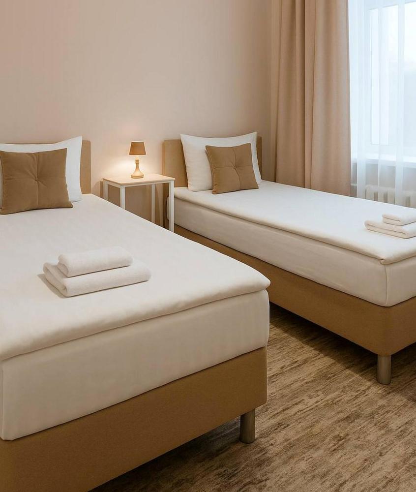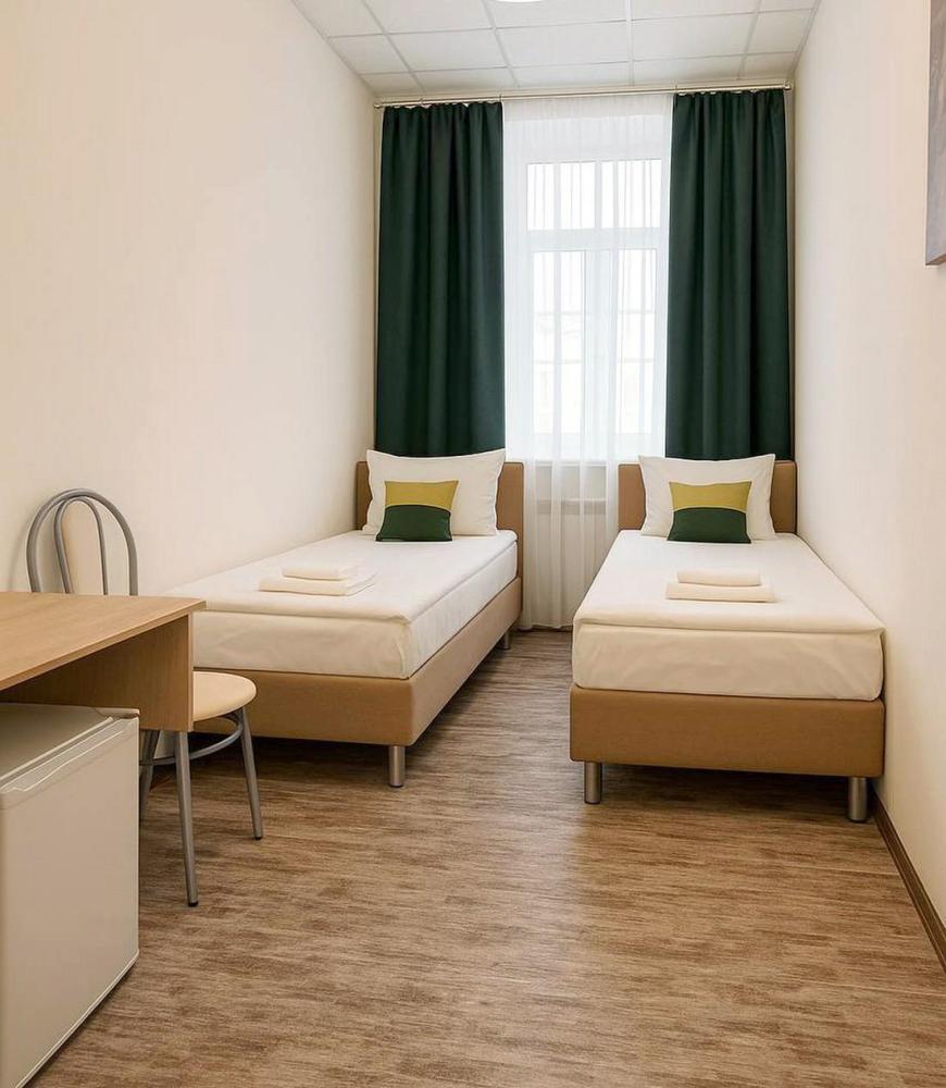 Отдельный номер с ремонтом площадью от 9,4 м2 до 14,0 м2. В номере: вешалка для верхней одежды, две односпальные кровати на 80*200 с ортопедическим, стол, стулья, шкаф с вешалками для одежды, телевизор от 32 дюймов, холодильник, чайник, чайный набор. Санузел с душем, фен, туалетные принадлежности (шампунь и гель для душа, туалетная бумага, освежитель воздуха)