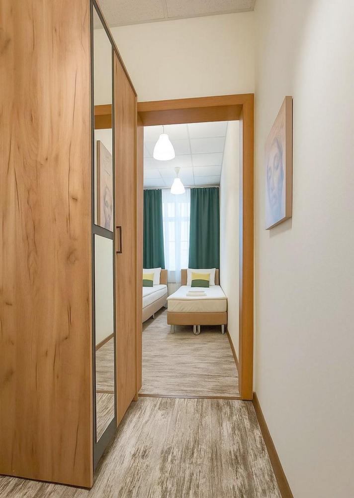 Отдельный номер площадью от 11,7 м2 до 15,8 м2. В номере: двуспальная кровать 160*200 и односпальная кровать 80*200, стол, стулья, шкаф с вешалками для одежды, телевизор, холодильник, чайник, чайный набор. Санузел с душем, фен, туалетные принадлежности (шампунь и гель для душа, туалетная бумага, освежитель воздуха)