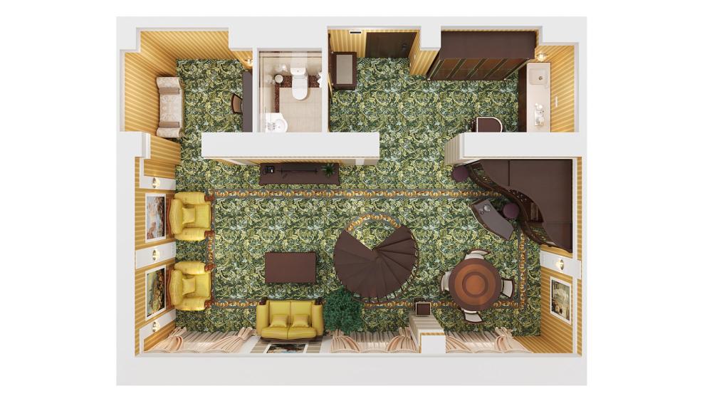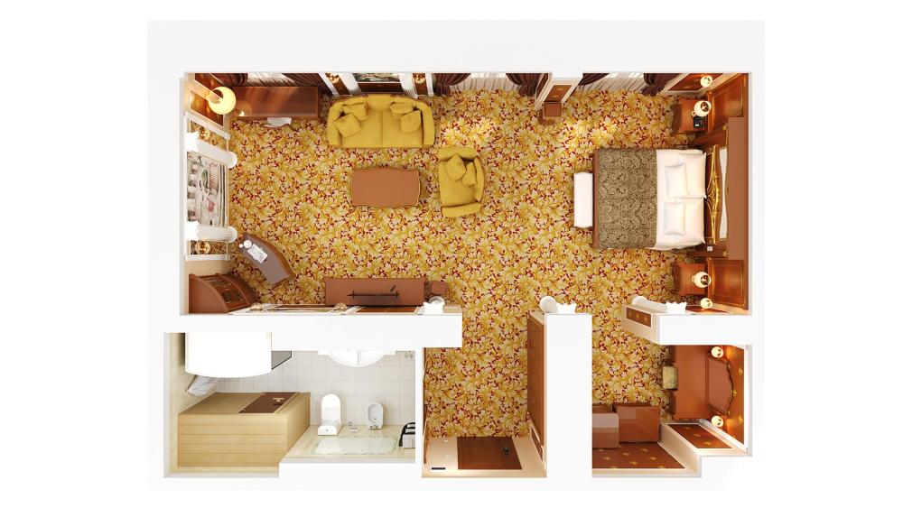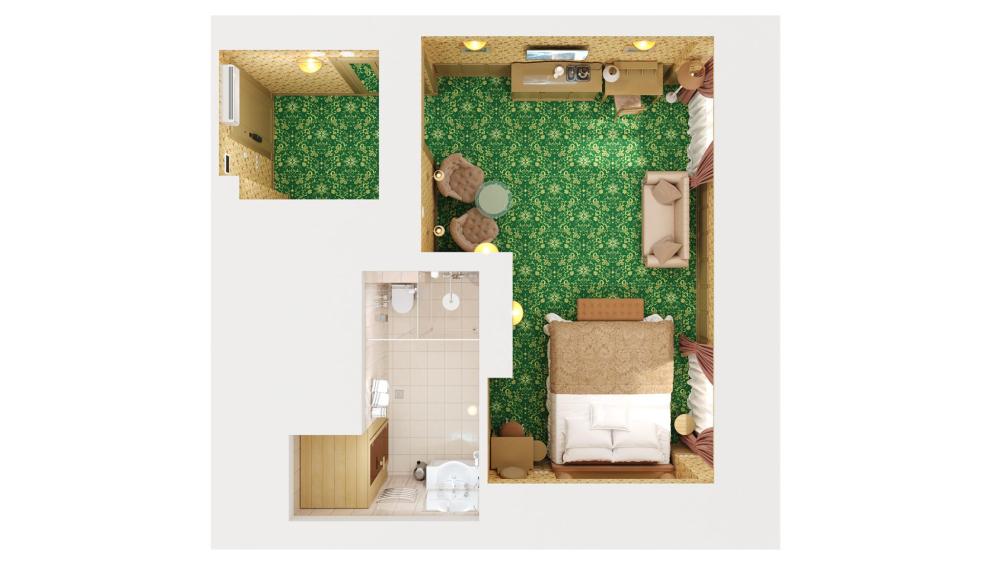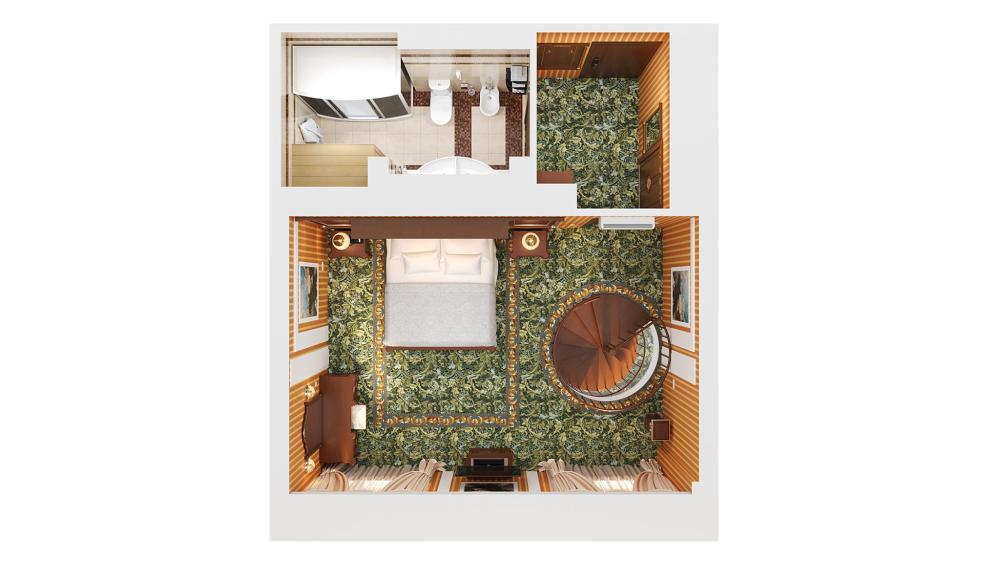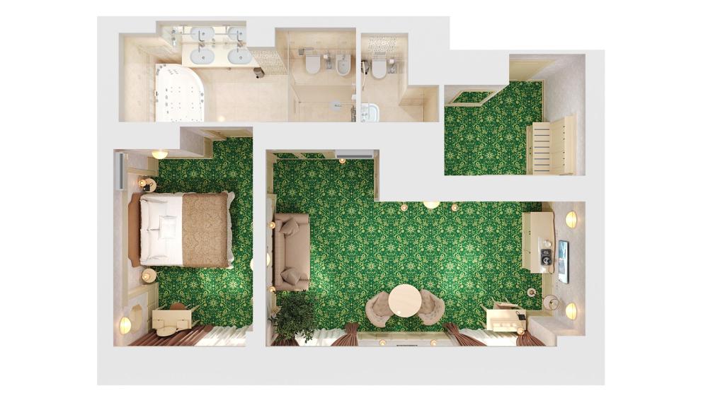 Двухкомнатный номер с продуманным до мелочей интерьером, общей площадью 60 кв.м. состоит из уютной гостиной и просторной спальной комнаты с одной большой кроватью (King size 180х200). Идеально подходит для тех, кто ценит сочетание комфорта и функциональности. Номер спланирован так, чтобы подарить полноценный отдых после насыщенного дня, проведенного в городе, а оригинальный дизайн создает красочный образ каждого номера. Ванная комната оснащена гидромассажной ванной (джакузи) c подсветкой для релаксации, душевой кабиной и биде. Просторная прихожая с гостевым санузлом.