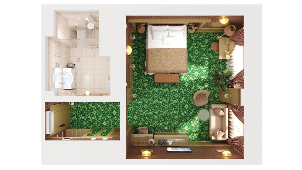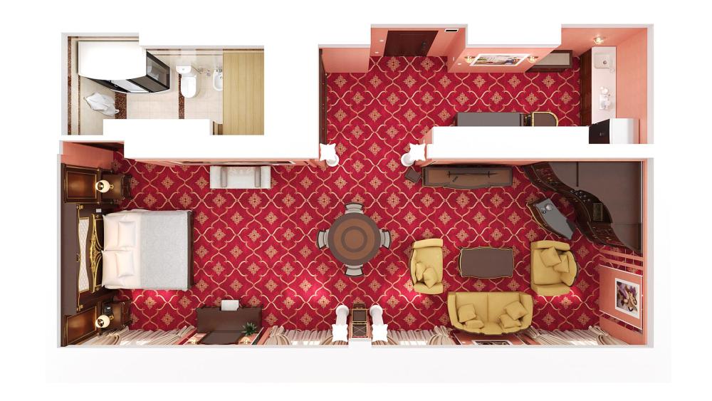 Двухкомнатный номер состоит из уютной гостиной и спальни с одной большой кроватью и имеет все необходимое для полноценного отдыха. В номере: телевизор с плоским экраном, телефон, сейф, кондиционер, рабочий стол, шкаф/гардероб, ванна или душ, фен, халат, бесплатные туалетные принадлежности, комплект полотенец.