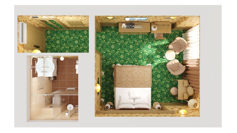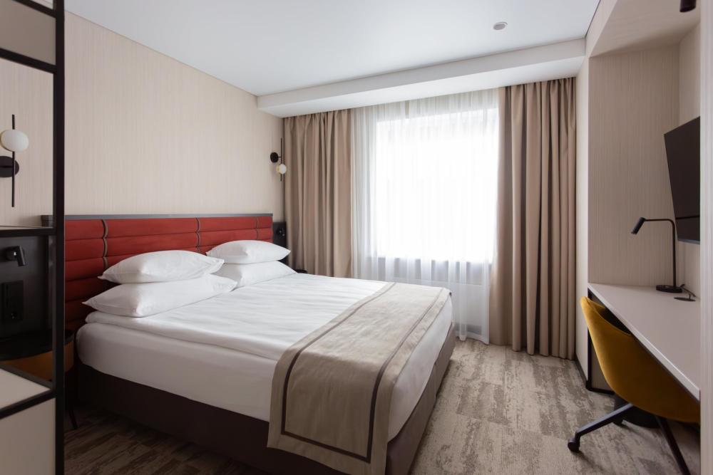 Однокомнатный номер площадью 18 - 21 кв. м. с одной двуспальной кроватью или двумя односпальными кроватями оборудованный кондиционером сочетает в себе красоту интерьера и максимальную комфортность. Номер для некурящих. Санузел с ванной чашей (130 х 68 см.) или душем. Обращаем ваше внимание, что номера при бронировании могут отличаться дизайном и цветовыми решениями от фотографий, указанных на сайте.
