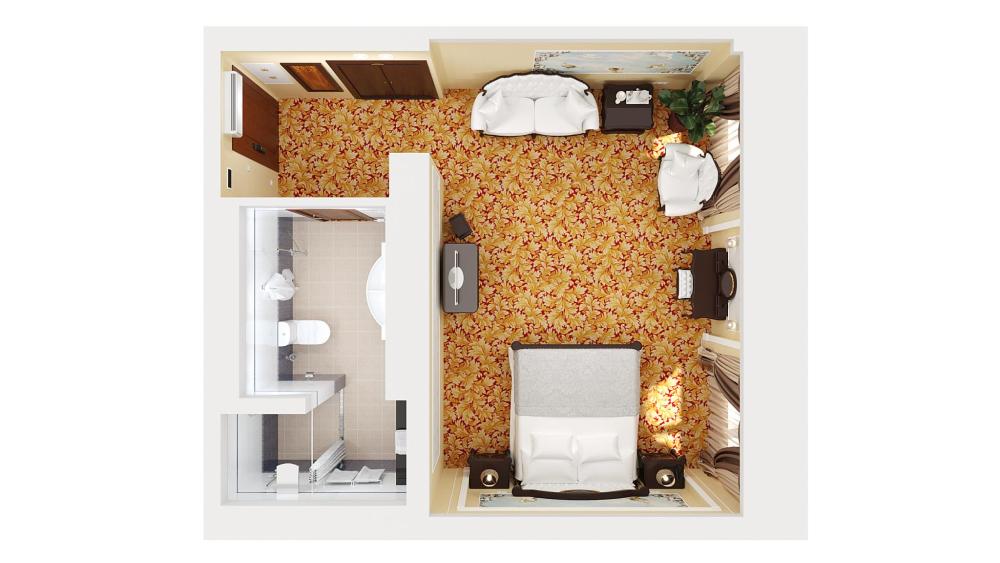 Площадь номера 44 кв. м. В номере :2-спальная кровать «King Size», мини-бар, кофе-машина, сейф, кондиционер, фен, мягкая мебель, рабочая зона, телевизор, телефон, халат и тапочки, туалетные и косметические принадлежности, санузел с душем.