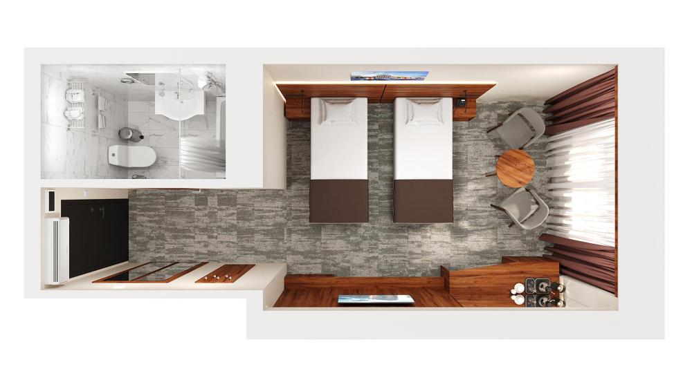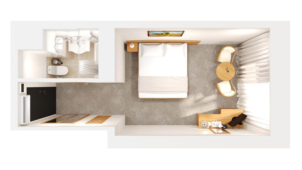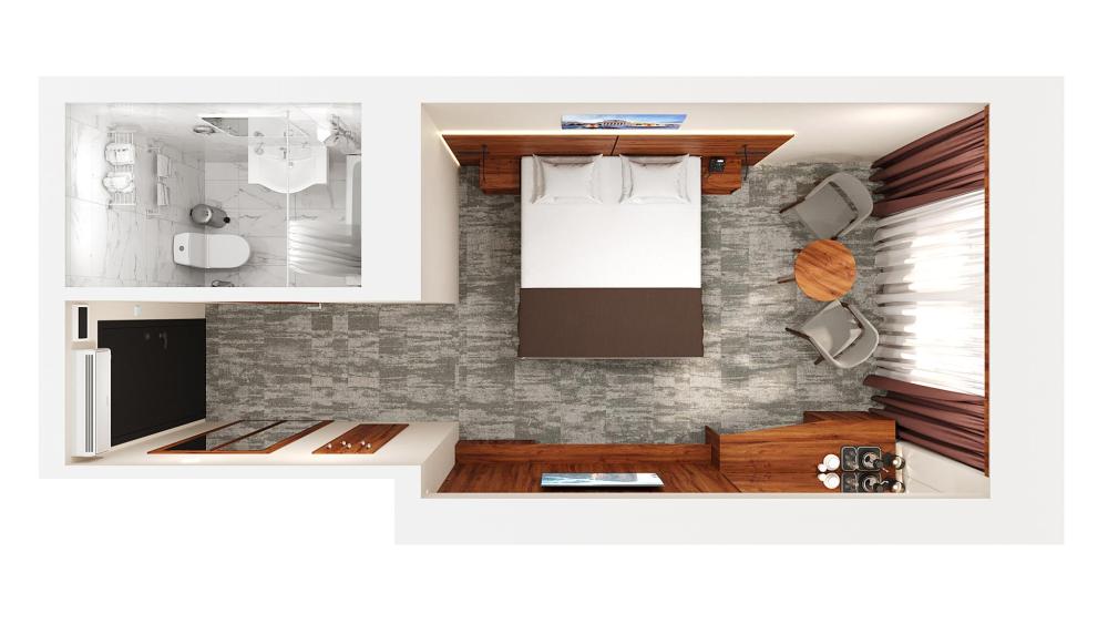 Однокомнатный номер площадью 21 кв.м с одной двуспальной кроватью (180x200) оборудованный кондиционером сочетает в себе красоту интерьера и максимальную комфортность. Санузел с ванной или душем.