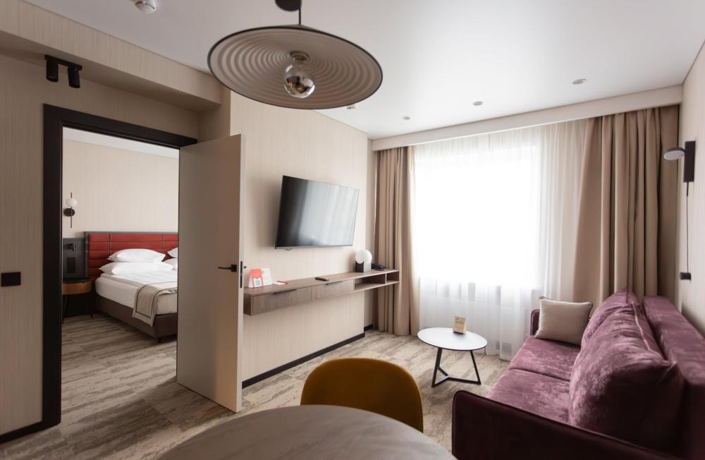 Двухкомнатный люкс — двухкомнатный номер площадью 43 м2 , состоящий из уютной гостиной и просторной спальни с одной большой кроватью. Интерьер номера выполнен в элегантном современном стиле с использованием премиальных материалов и изысканных декоративных элементов. Особую комфортабельность номеру придают два полностью оборудованных санузла с премиальной сантехникой.