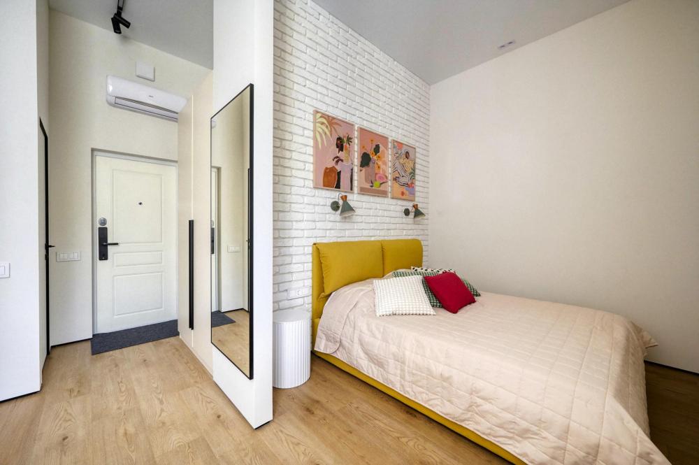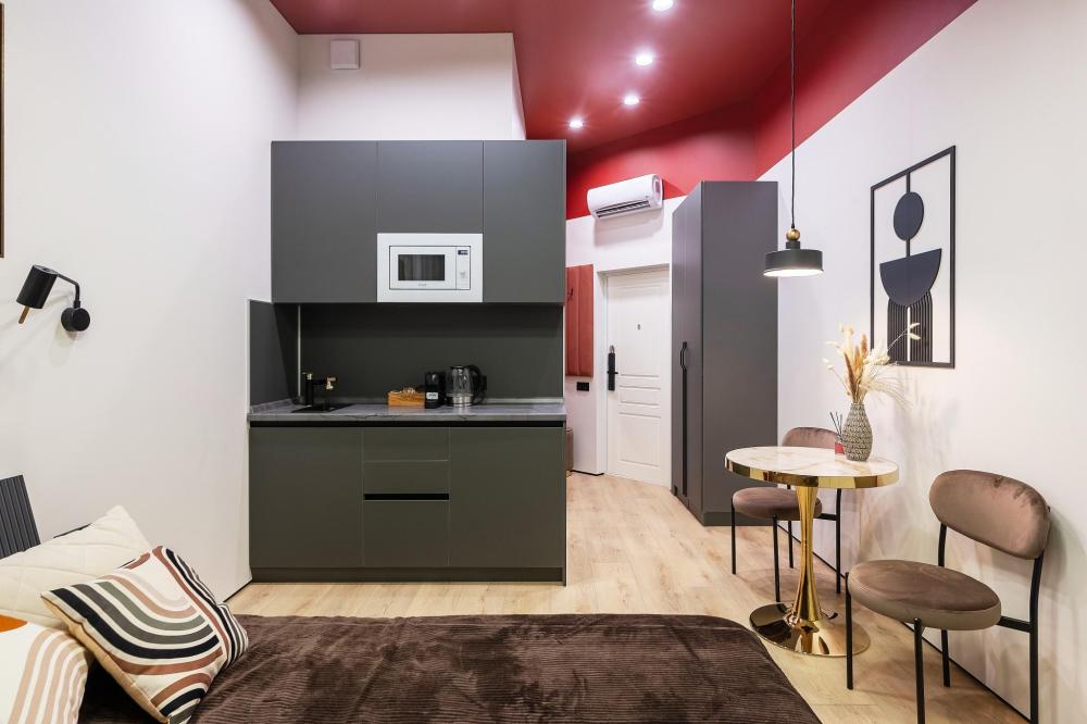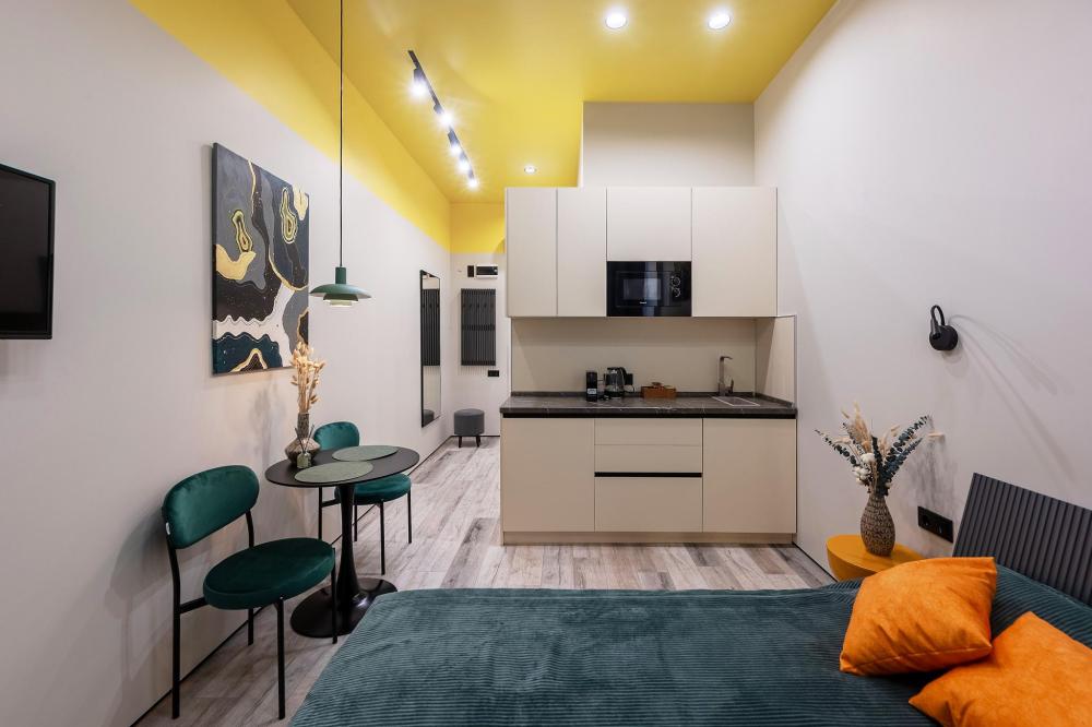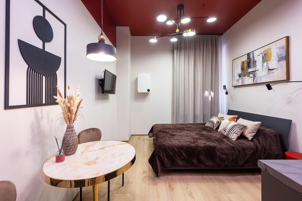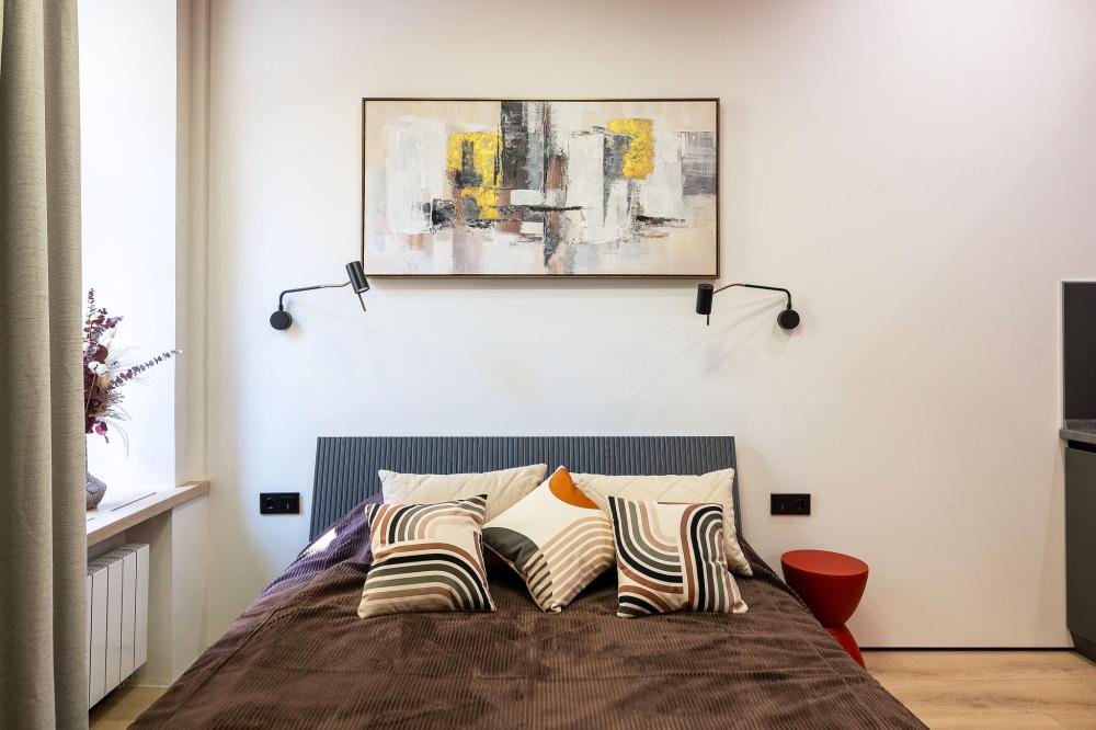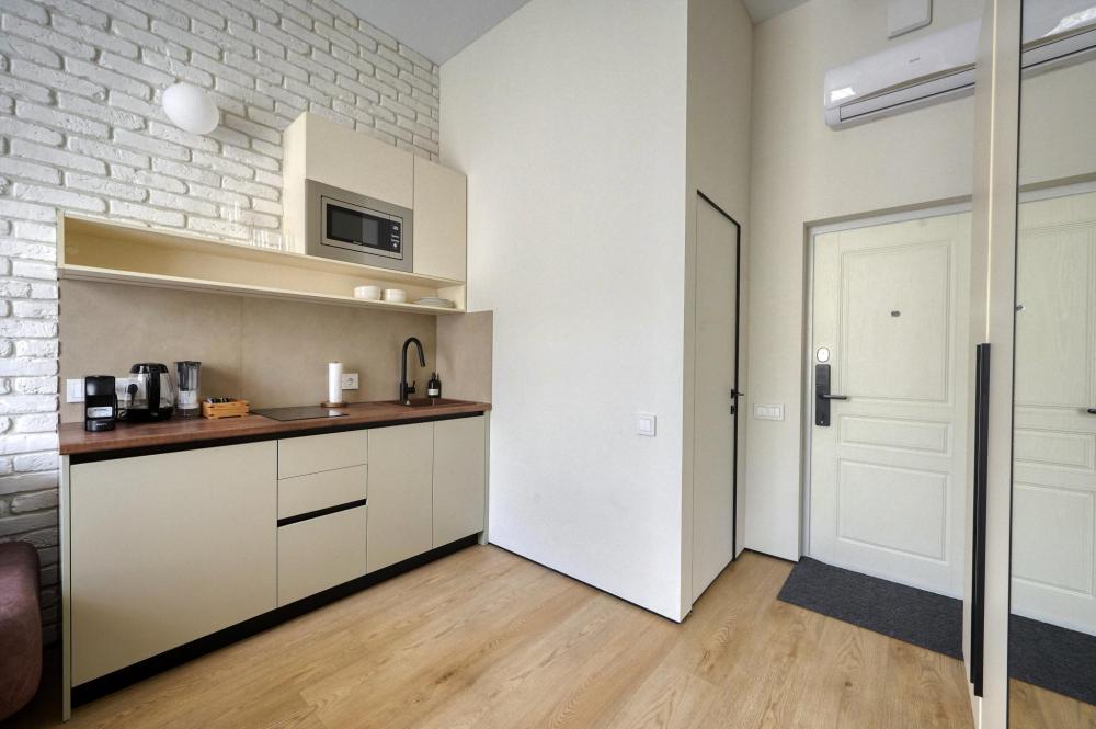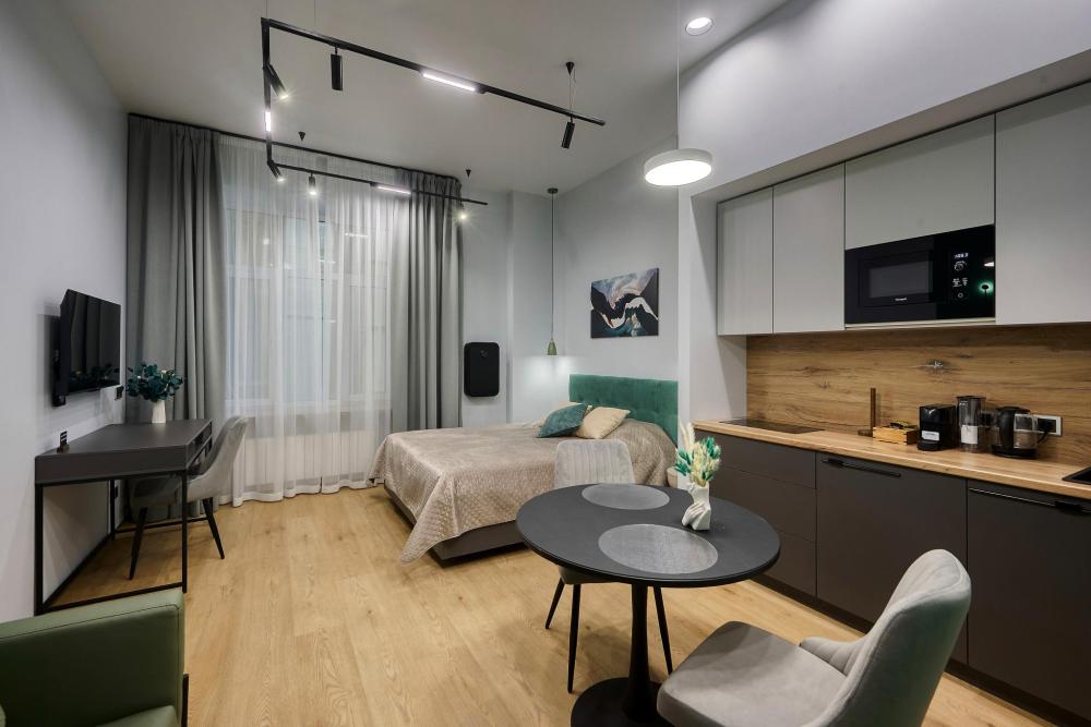 Уютные апартаменты студия. В студии есть все необходимое для комфортного проживания: современная мебель: двуспальная кровать, письменный стол, обеденная зона, кухня и шкаф, вся необходимая бытовая техника и удобства: фен, утюг, гладильная доска, микроволновка, чайник, кофемашина, плита для готовки, мини-холодильник, телевизор, кондиционер и очиститель воздуха, скоростной WI-FI, кухня оборудована полным комплектом посуды и столовых приборов для приема пищи, чай, кофе, свежее постельное белье, полотенца, гель для душа, шампунь, кондиционер, мыло.